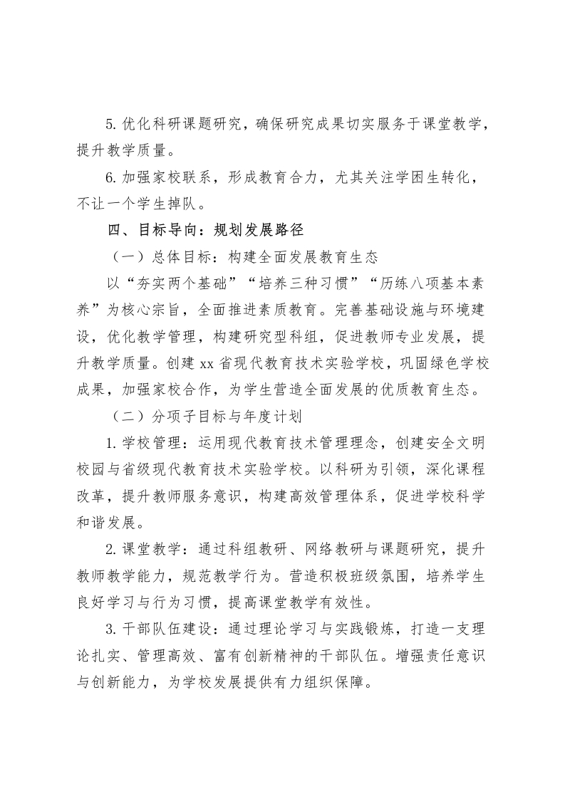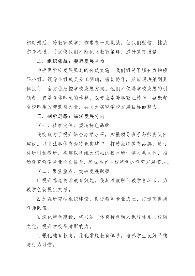 学校五年发展规划(2025-2030年)在教育改革与发展的浪潮中,我校正站在新的历史起点,积极响应时代召唤,精心绘制未来发展蓝图。这份规划,不仅是对学校过去成果的总结与传承,更是对未来教育方向的深刻洞察与积极探索,旨在为每一位学生提供优质且全面的教育,助力他们成为时代的栋梁之才。一、内外兼修:剖析发展根基(一)外部政策引领航向《教育强国建设规划纲要(20242035年)》的颁布,为义务教育阶段指明了清晰方向。素质教育的全面推进,要求我们从品行塑造、兴趣激发、体魄培育到习惯养成,全方位关注学生成长。深化课程与教学改革,借助信息技术创新教学,均衡师资配置,保障学生身心健康,减轻学业负担,成为我们落实纲要精神的关键任务。这不仅是政策要求,更是教育发展的必然趋势,激励我们不断探索教育创新之路。(二)内部优势与挑战并存学校秉持“全面育人,打好基础,发展个性,培养特长”的理念,在素质教育推进中成果斐然。现代化的校园设施、完善的功能室配备以及先进的信息化建设,为教学提供了坚实保障。教师队伍中,中级职称占比较高,骨干教师队伍初现规模,为学校发展注入强大动力。然而,学校地处发达地区农村,生源结构变化带来价值观、家庭文化背景差异等问题,家庭教育