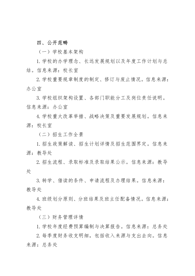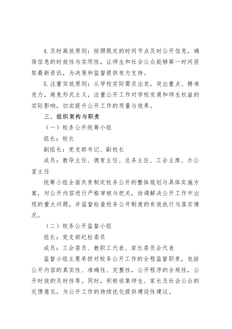学校校务公开制度(2025年)为积极响应党的教育方针政策,深入推进依法治校进程,强化学校民主政治建设,切实保障教职工与社会公众对学校事务的知情权、参与权、表达权及监督权,提升学校管理透明度与公信力,推动学校朝着科学、和谐的方向稳健发展,依据上级相关文件精神,结合我校实际情况,特制定本全面且具有创新性的校务公开制度实施方案。一、核心指引秉持党的教育理念,以促进教育公平、提升教育质量为目标,通过推行校务公开,强化党风廉政建设,规范学校办学行为,优化管理模式,充分激发广大教职工参与学校管理的热情与创造力,致力于打造人民满意的优质教育。二、关键准则1.党的引领原则:校务公开工作在学校党组织的坚强领导下有序开展,确保公开工作始终与党的教育方针保持高度一致,沿着正确的政治方向稳步推进。2.依法依规原则:严格遵循国家法律法规及相关政策规定,确保公开内容、程序及方式合法合规,做到公开工作有法可依、有章可循。3.真实全面原则:公开信息务必真实可靠、准确无误,全面涵盖学校各项重要事务,不隐瞒、不歪曲、不遗漏任何关键信息,保障信息的完整性与真实性。