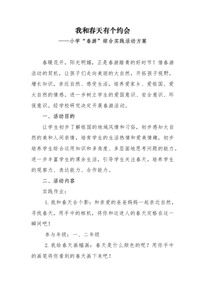 我和春天有个约会一一小学“春游”综合实践活动方案春暖花开,阳光明媚,正是春游踏青的好时节!借春游活动的契机,让孩子们走向美丽的大自然,开拓孩子视野,增长知识,亲近自然、感受生活,培养爱家乡、爱祖国、爱大自然的情感。进一步树立学生的爱国意识、安全意识、环保意识。经学校研究决定开展春游活动。一、活动目的让学生初步了解祖国的地域风情和习俗,初步感知大自然的美和人间亲情,培育学生的生活热情和爱美情趣,初步培养学生综合运用知识和多角度、多层面地思考问题的能力。进一步丰富学生的课余生活,引导学生关注春天,培养学生的观察力、表达能力、合作能力。二、活动内容实践作业:1.我和春天合个影:和亲爱的爸爸妈妈一起亲近自然,寻找春天,用手中的相机,将你和这迷人的春天定格在这一瞬间吧!参与年级:一、二年级2.我给春天画幅画:春天是什么颜色的呢?用你手中的画笔将你看到的春天画下来吧!