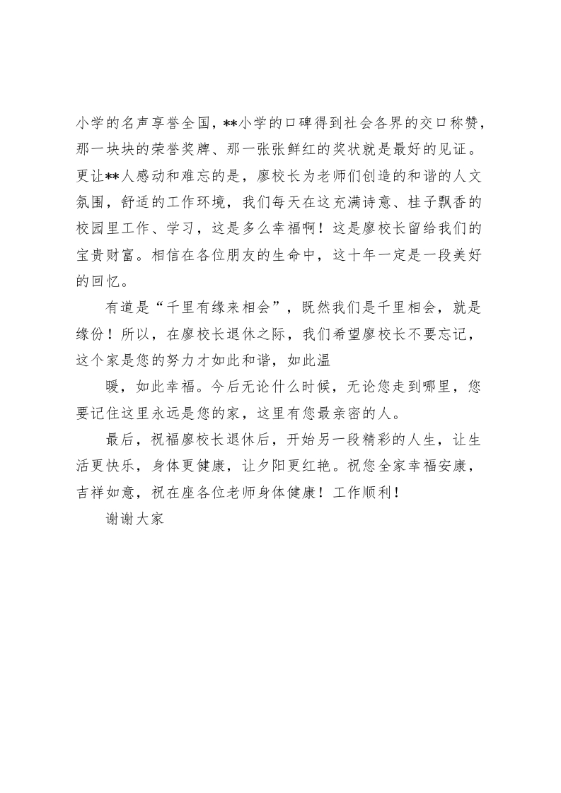 在退休老校长欢送会上,新校长发言祝贺光荣退休尊敬的廖校长、学校领导、老师们:大家下午好!今天我们在这里召开欢送会,欢送我们的好领导、好大姐廖校长光荣退休。首先,请允许我代表*小学全体教师,向廖校长表示真诚的敬意和美好的祝福!廖校长从秀丽的小姑娘到娴熟端庄的美女,从山清水秀的xx到繁华热闹的xx,从一名普通的教师到一位令人德高望重的校长,三十多年如一日,以教师职业为荣,以教育事业为重,倾注全部心血教书育人,为*小学的发展出谋献策,为*小学的教育呕心沥血。三十多年来爱岗敬业,默默耕耘,工作勤勤恳恳,任劳任怨,不图名利,不计得失,给我们展现了一代师表的崇高形象。我们都真切地感受着您心系教育、心系xx的热烈情怀;我们都为您始终对事业的满腔热忱、执着追求所感动:我们都为您的谦虚谨慎、勤奋工作、锐意进取、真诚坦率的人格魅力所钦佩;更为您为Xx、Xx教育事业发展做出贡献而折服。时间过得太快,转眼间十年已经过去了。今天,我们不得不为我们尊敬的廖校长举行欢送会,心中真的有许多眷恋。回首十年来,廖校长在*小学期间,带领我们游览了华山、三清山的迷人风光;参观了延安、井冈山近代史的遗迹,欣赏了xx、xx的秀丽山水,品尝了xx乃至全国各地的美食,购买了各地不少的土特产,真可谓收获多多。但这些只是其次,更重要的是,**小学在您的领导下,*小学的教育质量取得了质的腾飞,**