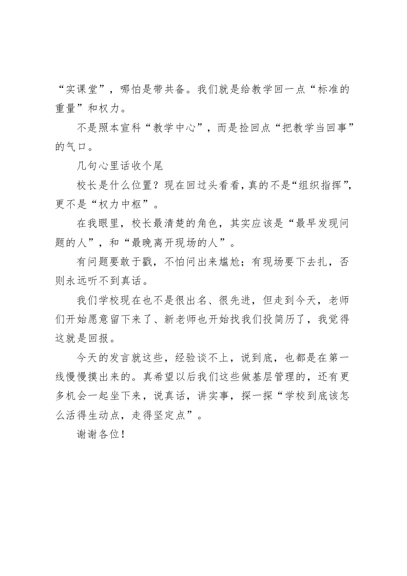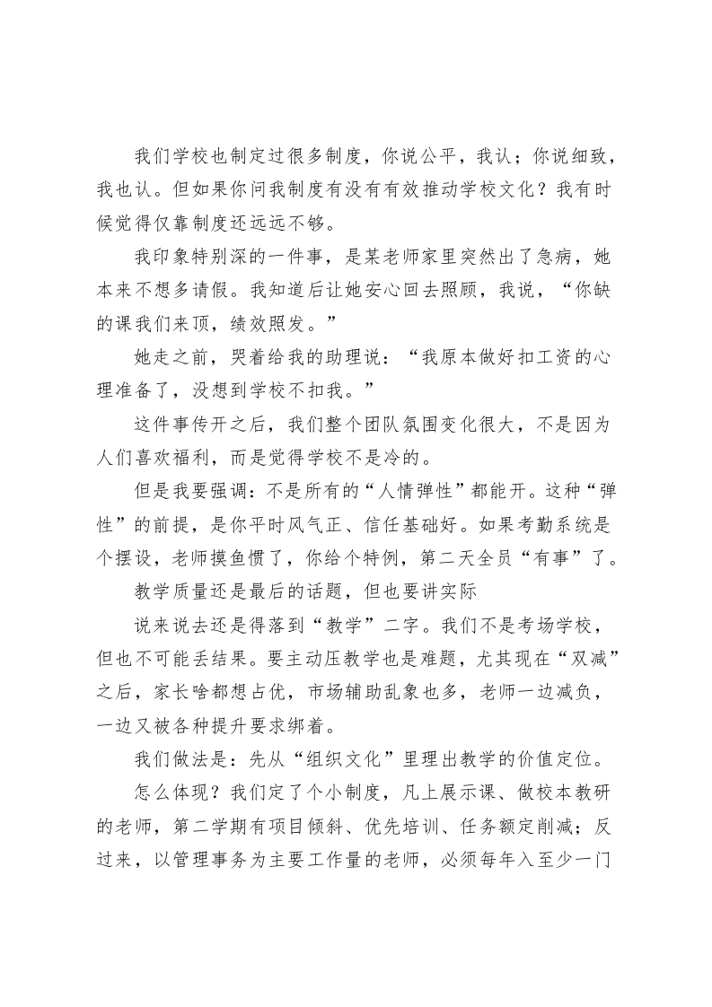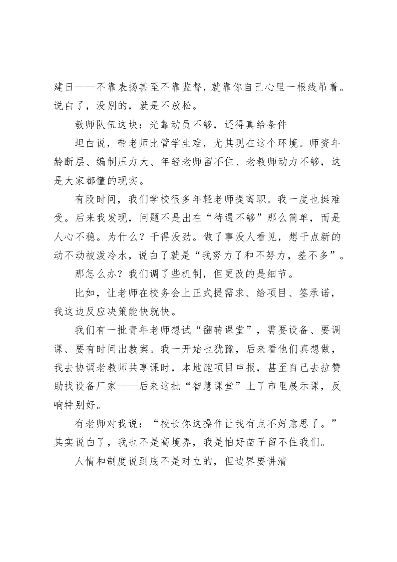 中小学校长论坛会上,校长讲话:重大突破!校长不是官,是服务员!尊敬的各位领导、同行们:大家好,我是XX学校的XX。能在这个场合和大家做个交流,很感激。刚才几位校长的分享听得特别认真,讲得都很实在,也挺触动人的。我这边讲的也不复杂,甚至大家一听可能也没新鲜劲,但确实是我这几年带学校、管队伍、盯教学的一些亲身经历和脑子里的那点“反复琢磨”。我就不分那么齐整的“一二三四”了,边讲边说,各位听听也帮我挑挑问题,看我们这点做法成不成样。先讲点基层事:管校真没啥秘籍,都是磨别说经验,你真要让我回答“你们学校靠什么慢慢变好的”,还真说不上有什么特别的“招数”。我觉得归根到底就是四个字:“事事上心”。我接手学校的时候,情况不算理想,最直观的,一个校园到处是杂草和破损。没法等拨款,没法抱怨,那就自己先把眼底下的事干掉。我带着几个老师先收拾场地,那天刷墙刷了一下午,一个老师开玩笑说:“咋整得像工地。”我是回他一句玩笑,但也真心实意:“要真想学生觉得学校是个地方,那总不能让他们天天在墙皮斑驳的地方读书。”这事你能一次两次做,容易。难的是,你整整维护三年,坚持每周巡一次楼道、每月一次环境抽查、每学期一次师生共