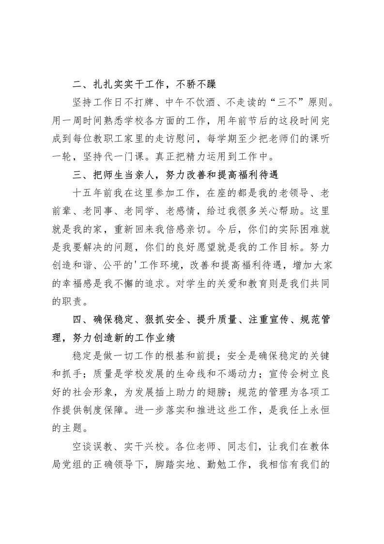 中学新校长上任讲话空谈误教、实干兴校各位领导、各位同仁:大家好!刚才Xx局长宣读了对我的任命。感谢教体局党组和中心学校对我的信任,把我放在这个重要的工作岗位上。职务对我而言,不是地位和荣誉,而是压力,更是责任。xx二中在教体局、中心学校的正确领导下,以Xx书记为班长的领导班子勤勉务实,全体教职工克难奋进,创造了辉煌的工作业绩。中考招生工作多年在全区领先;中考质量持续在全区居中上游;课堂教学改革获得市局表彰:各项创建在区内有位置,镇内列前茅;学校管理严格规范,受到上级认可和群众赞誉是Xx教育乃至xx教育的一面旗帜。这是xx书记得以提拔交流到异地任职的政绩。同时,也是我肩上的压力。如何迅速适应角色转变,实现顺利过渡?如何保持学校发展的良好势头?如何带领大家创造新的工作业绩?如何保护和调动广大教师的积极性?如何得到同事和领导的认可?这些就是我的责任。当然,压力和责任都是我前行的动力。借这个机会我也向教体局、中心学校领导和全体教师表个态,请大家监督:一、保持工作连续性,不烧所谓“三把火”领导班子分工保持不变,各类人员岗位不做调整,各项制度继续推行。保持人员、工作、制度等方面的连续性和稳定性。工作过程中发现的新情况、新问题,再根据实际研究解决。