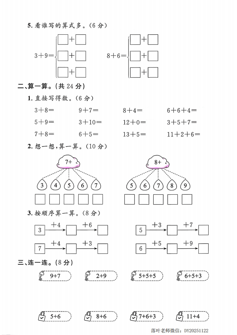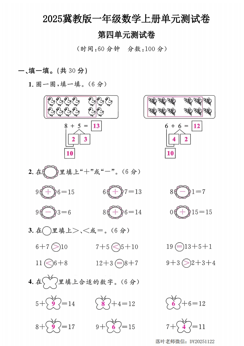 2025冀教版一年级数学上册单元测试卷第四单元测试卷(时间:60分钟分数:100分)一、填一填。(共30分)1.圈一圈,填一填。(6分)8882观爱观呢耀848妮提魂观艰妮8+5=6+6=2.在里填上“+”或“-”。(6分)9○6=1567=1381=793=686=14015=153.在○里填上>、<或=。(6分)6+7○107+5○5+1019○13+5+111○6+812+3○8+79+3○2+3+44在的里统上合道的数宇。6分)5+为-14+4=12次+6=128+次=179+女=157+的-11落叶老师微信:DY20251122
