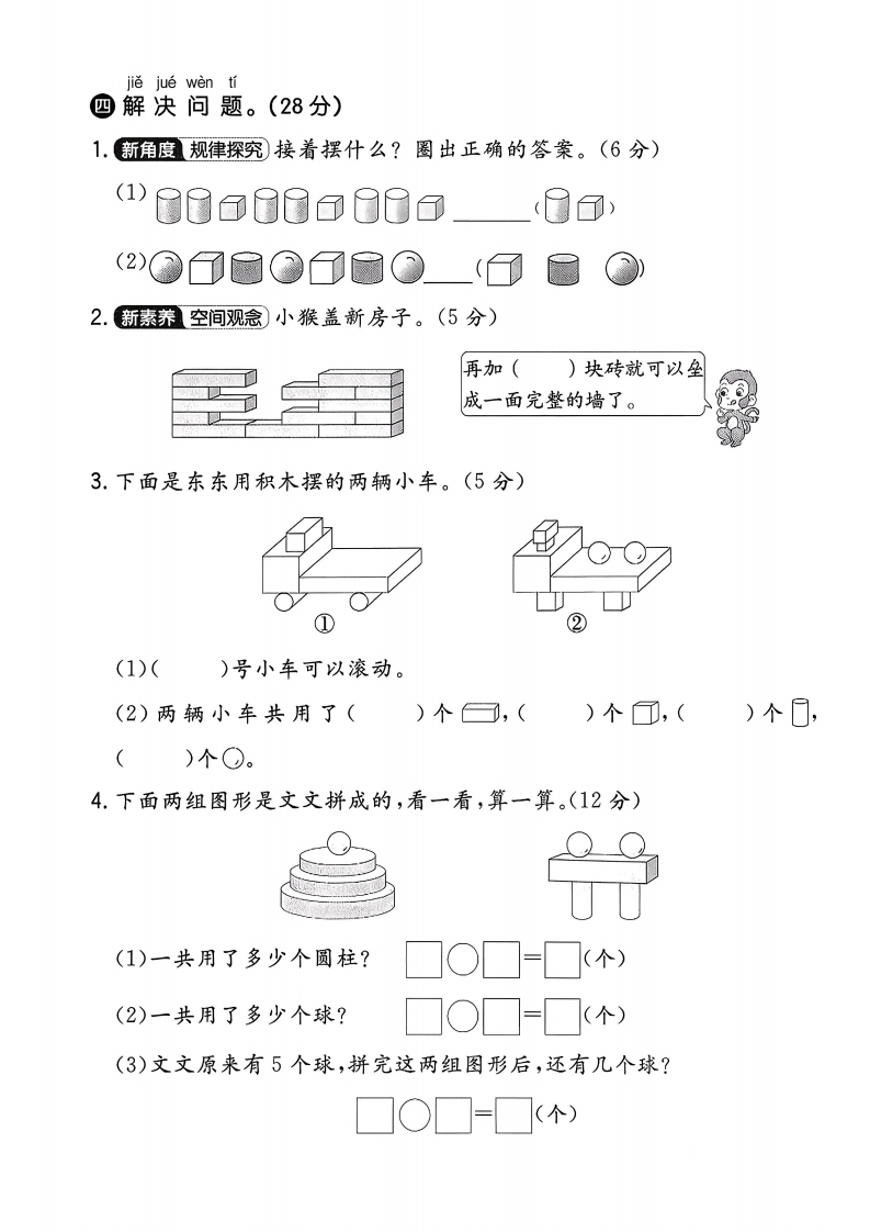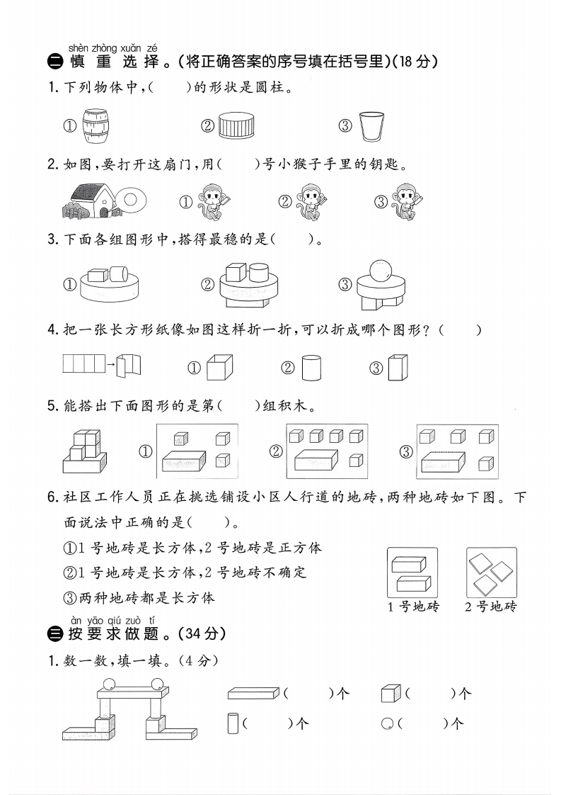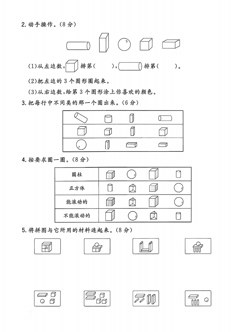 2025年人教版一年级上册数学第三单元数学测试卷tangqi883小时前发布关注私信2.68MB4页0226 第1页 / 共4页 第2页 / 共4页 第3页 / 共4页 第4页 / 共4页 已完成全部阅读,共4页 2025年人教版一年级上册数学第三单元数学测试卷此内容为付费资源,请付费后查看¥9.9¥19.9VIP会员免费立即购买您当前未登录!建议登陆后购买,可保存购买订单付费资源© 版权声明本站是一个信息分享及获取的平台,不确保部分用户上传资料的来源及知识产权归属,资料由老师投稿,公开渠道整理,网友上传,如果侵犯到您的权益,请联系客服删除THE END教师资料试卷资料 文本预览 2025年人教版一年级上册数学试卷露第三单元数学测试卷kan tu tian kong看图填空。(每空1分,共20分)1.分一分,填一填。肥皂闲製①②③④⑤⑦⑧(1)把序号填入圈内,并数一数。)个蜜)个()个)个(2)○比了多()个,日比○少()个。2.②③④赵不容易滚动的是()和();既能滚动又能立起来的是(能任意滚动的是()。(填序号)3.猜一猜,图中隐藏着的物体是什么?写出物体的名称。4.新素养空间观念下图中分别有多少个?)个)个)个)个 查看更多 收起部分 喜欢就支持一下吧点赞6 分享QQ空间微博QQ好友海报分享复制链接收藏