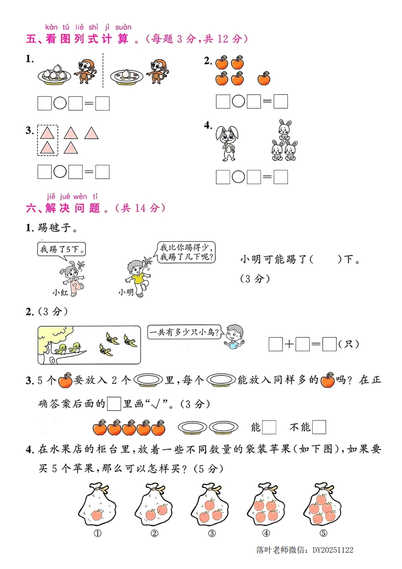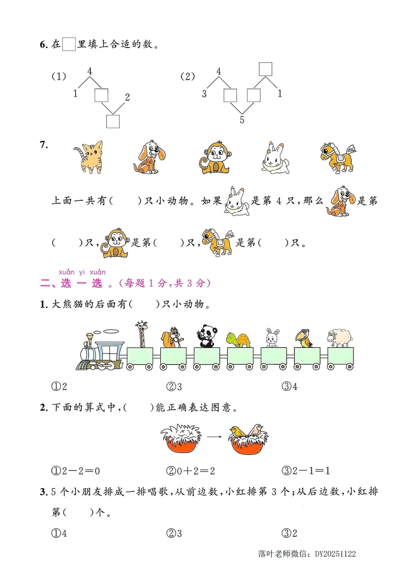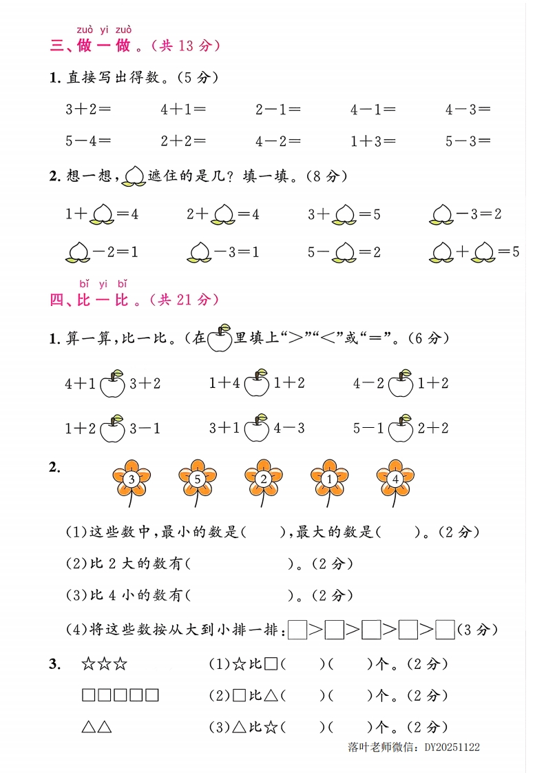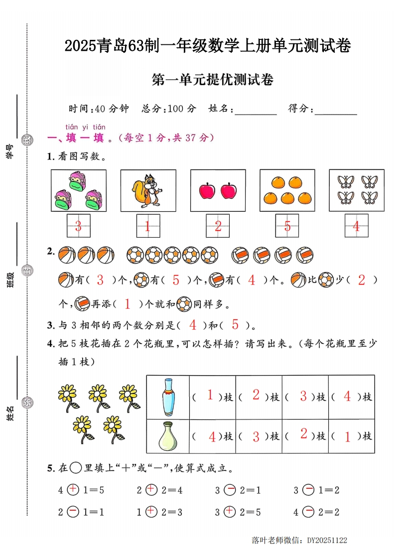 2025青岛63制一年级数学上册单元测试卷第一单元提优测试卷时间:40分钟总分:100分姓名:得分:tian yi tian一、填一填。(每空1分,共37分)》1.看图写数。溆溆2.)))⑤⑤®⑤童)有()个,⑤有()个,有()个。)比⑤少()个,再添()个就和过同样多。3.与3相邻的两个数分别是()和()。4.把5枝花插在2个花瓶里,可以怎样插?请写出来。(每个花瓶里至少插1枝))枝()枝()枝()枝毁)枝()枝()枝()枝5.在○里填上“+”或“一”,使算式成立。4○1=52○2=43○2=1○1=232○1=11○2=3○2=534○2=2落叶老师微信:DY20251122