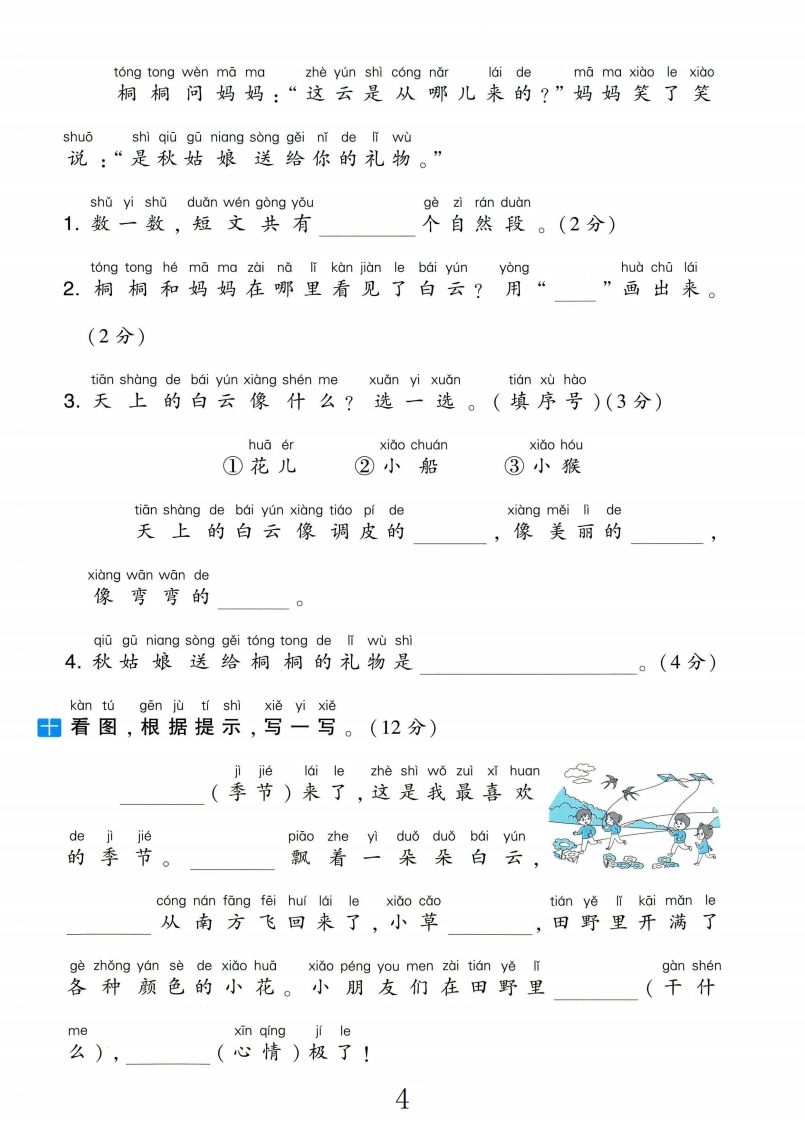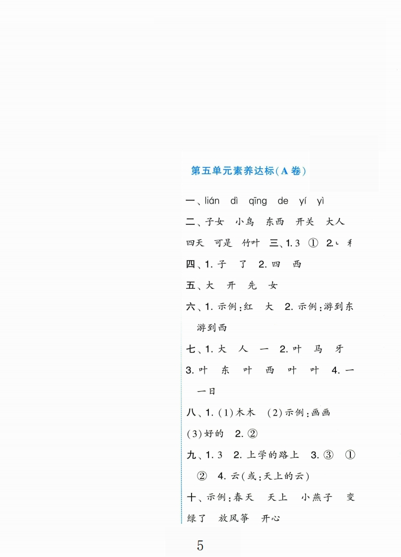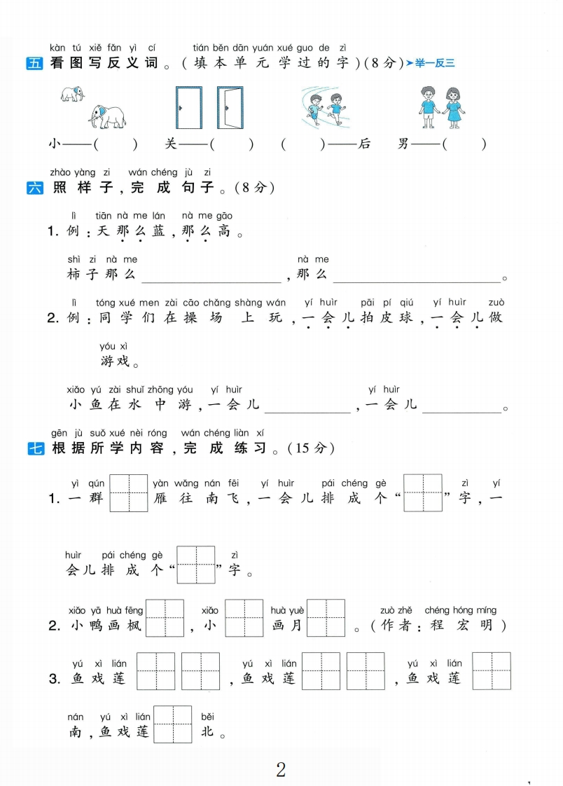 2025人教版一年级语文上册第五单元测试卷第五单元测试卷器时间:0分钟满分:100分yongei jia dian zi xuan ze zheng que de du yina用“√”给加点字选择正确的读音。(6分)yet拉wa密莲叶(Iidnnian)土地(dìde青蛙(qingginkai xinxiàogequn开心地笑(dide)封:个(Myi):群(y1yi)额du pin yinxiěcfyi日读拼音,写词语(16分)线zinǚxiǎoniaodongxkai guan内darensitiankěshi童zhúye不要tian yi tianxuan yi xuan目填一填,选一选。(8分)》答mǎgongbr必bi de ming cheng shi1.“马”共笔,第2笔的名称是(①shù家题tian xu haozhézhégou②héngzhéwan gou)(填序号)。X灯de dibr shiqiu zi de pian pang shi2.“西”的第5笔是,“秋”字的偏旁是br yi bi xuan yi xuan hua四比一比,选一选,画“V”。(8分)》yi pian pian yelezi cong shùshang luolexiàl6i☒1.一片片叶(了子)从树上落(了子)下来。di I you xisi ge yuan yuan de xigua2.地里有(西四)个圆圆的(西四)瓜。1