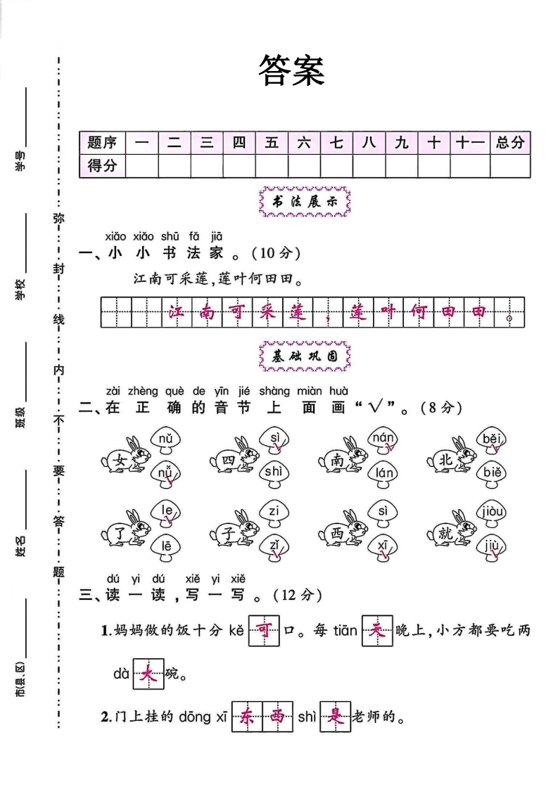2025人教版一年级语文上册单元测试卷第五单元测试卷时间:60分钟满分:100分题序二三四五六七八九十十一总分得分:书法展示弥克,xiao xido shūf6jia小小书法家。(10分)第江南可采莲,莲叶何田田。黛线:1·内:1。不1基础巩固础筑固zai zheng quedeyin jie shang mian hud二、在正确的音节上面画“V”。(8分)nǔSInanběi北nǚanbi道eA西盟就duyi duxiěyixiě三、读读写一写0(12分)1.妈妈做的饭十分kě口。每tian晚上,小方都要吃两o2.门上挂的d6ngX灯shi老师的。