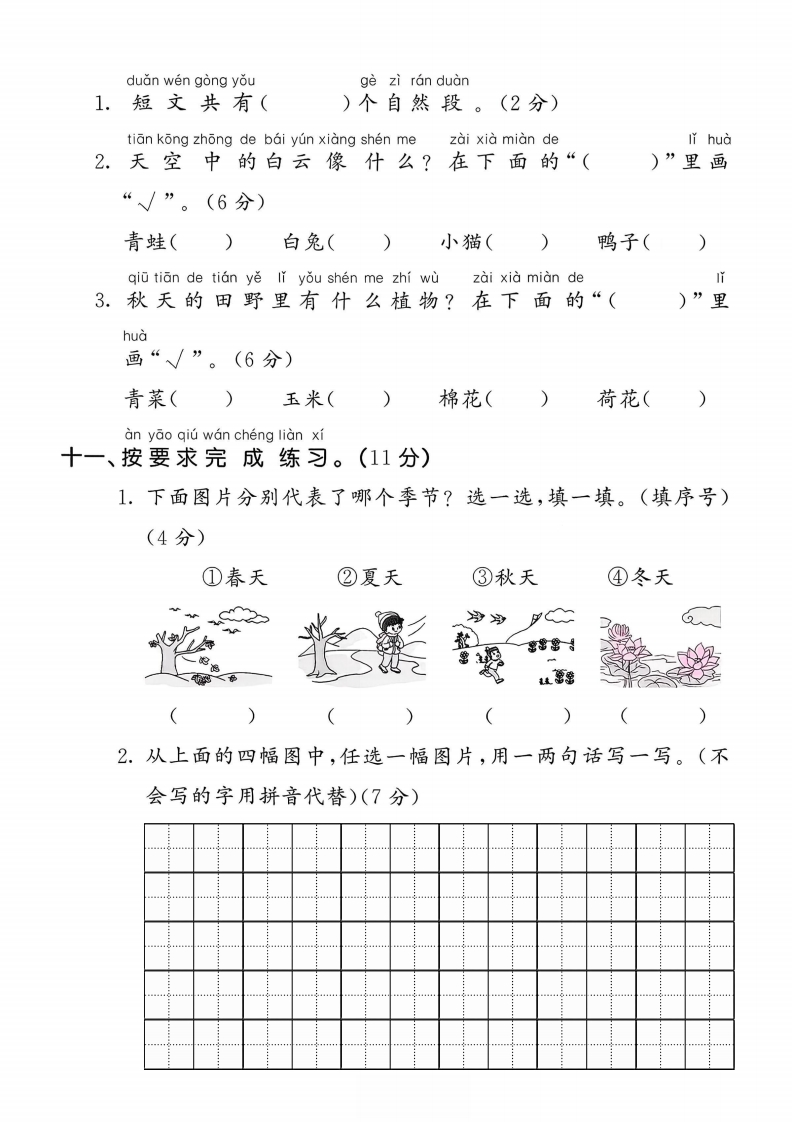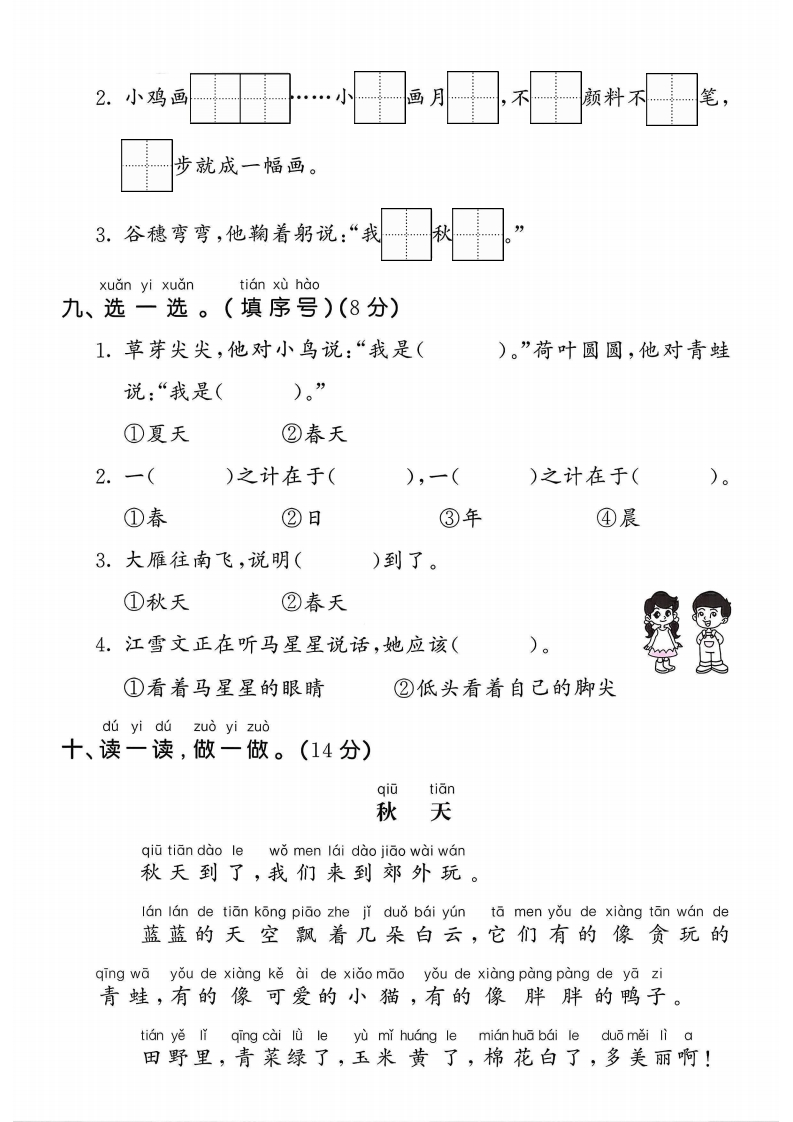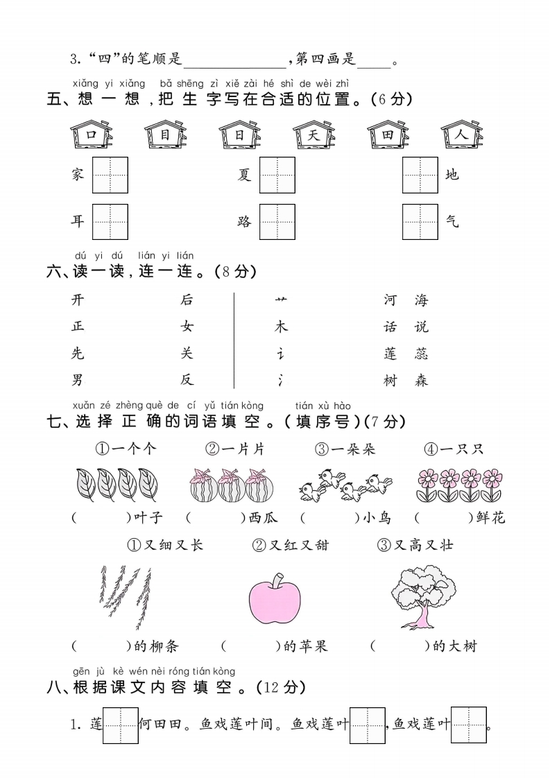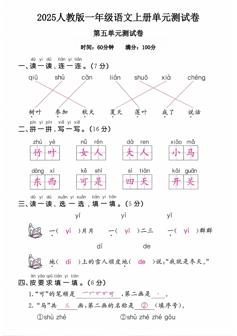 2025人教版一年级语文上册单元测试卷第五单元测试卷时间:60分钟满分:100分du yi du lian yi lian一、读一读,连一连。(7分)qiashùcanlianshuoxiacheng树叶参加秋天夏天莲叶成了说话pin yi pin xieěyixiě二、拼一拼,写一写。(16分)zhúyenǚrendàrenxiǎomǎdong xikěshisi tiankai guandu yi du xuan yi xuan tian yi tian三、读一读,选一选,填一填。(5分)yiyiyi)片片()二三.()群群dide地()上的雪人顽皮地()说:“我就是冬天。”an yao qiu tian yi tian四、按要求填一填。(6分)1.“可”的笔顺是,第二画是2.“马”共画,第二画的名称是(填序号)。①shùzhe②shùzhezhe gou