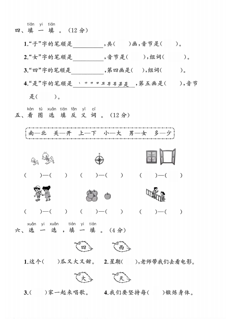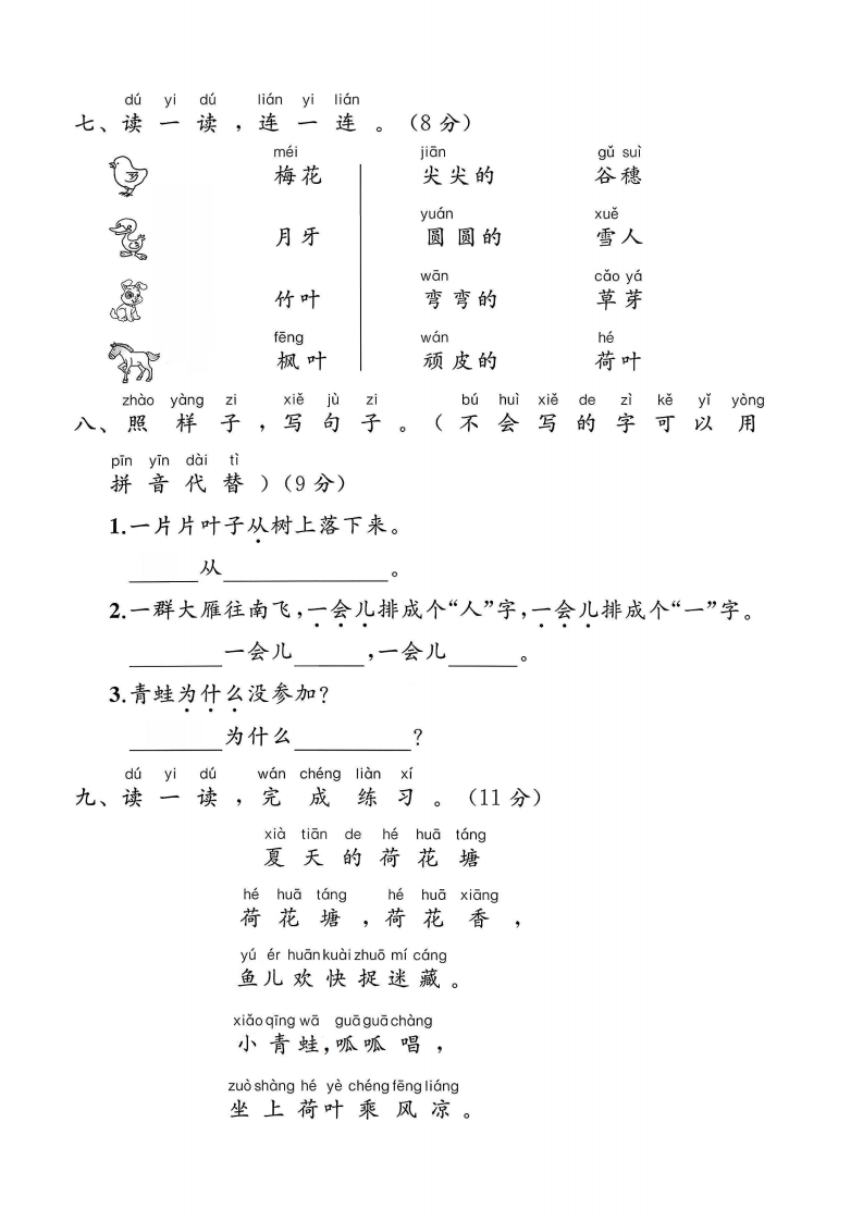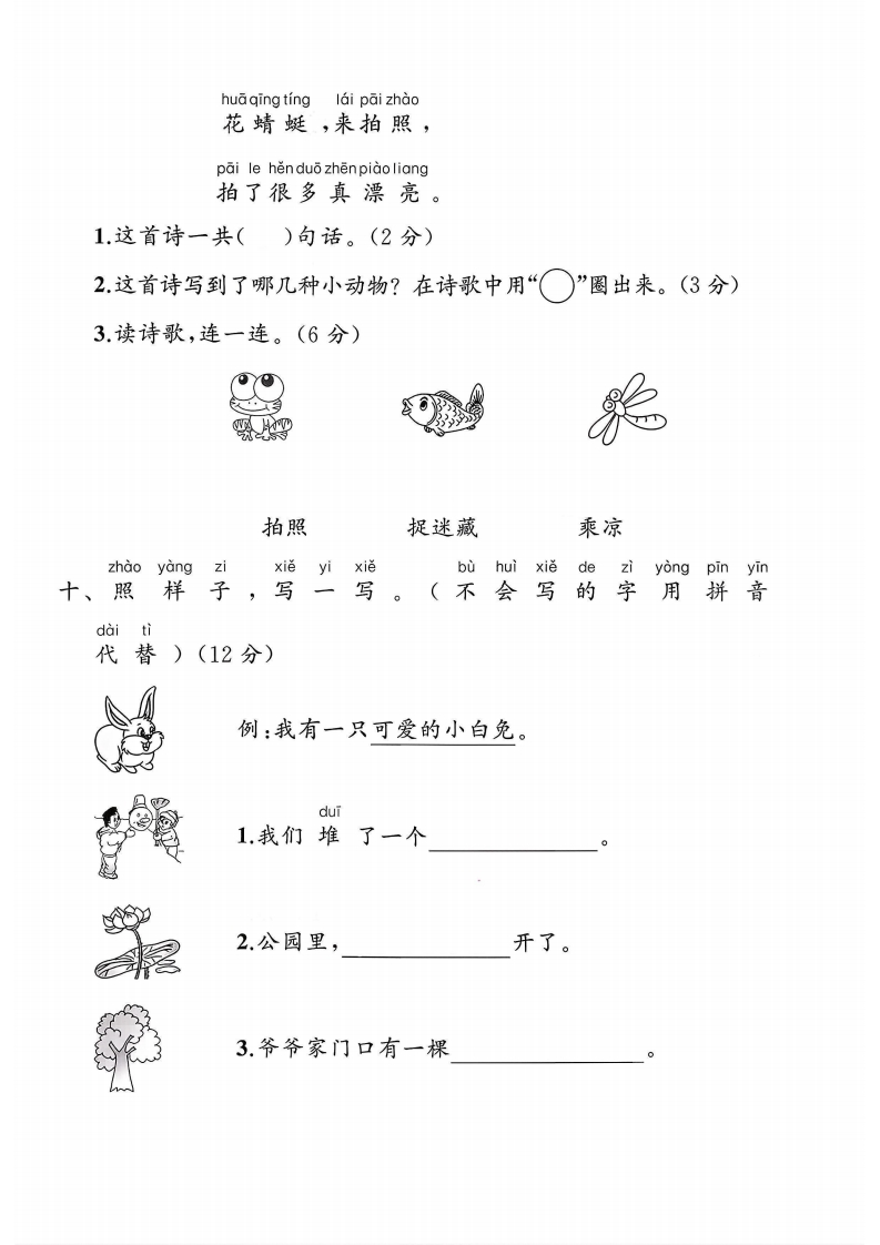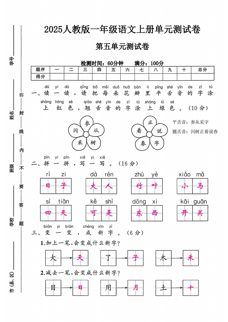 2025人教版一年级语文上册单元测试卷第五单元测试卷霸检测时间:60分钟满分:100分题序三四五六七八九十总分得分du yi duqing beǎměi duo hua ban li ping she yin dezitu弥一、读一读,请把每朵花瓣里平舌音的字涂shang hong se qiao she yin de zi tu shang lu se上红色,翘舌音的字涂上绿色。(10分)毁封参正线闪从着说采树春字内pinyipinxiěyixiě二、拼拼,写一写童。(16分)不rizidarenzhúyexiǎoma要答stiank色shidongxikai guan题bian yi bianchengxinzi三、变变成新字(6分)1,加上一笔,会变成什么新字?2.减去一笔,会变成什么新字?公电用