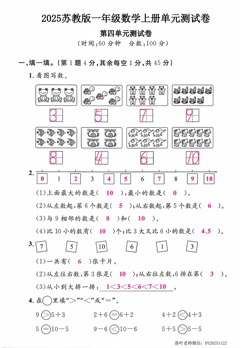 2025苏教版一年级数学上册单元测试卷第四单元测试卷(时间:60分钟分数:100分)一、填一填。(第1题4分,其余每空1分,共45分)1.看图写数。☆☆过母1A奇哥商酸1吵砂道时RR梦禁紧琴零砂砂砂8ore翠琴368□□(1)上面最大的数是(),最小的数是((2)从左数起,第6个数是();从右数起,第5个数是((3)与9相邻的数是()和()(4)比10小的数有()个;比3大又比6小的数是(3.751063(1)一共有()张卡片。(2)从左往右数,第3张是();从右往左数,6排在第()。(3)从小到大排一排:4.在○里填“>”“<”或“=”。9○5+32+6○6+24+2○4+35○10-59-6○10-65+5○5-5落叶老师微信:DY20251122