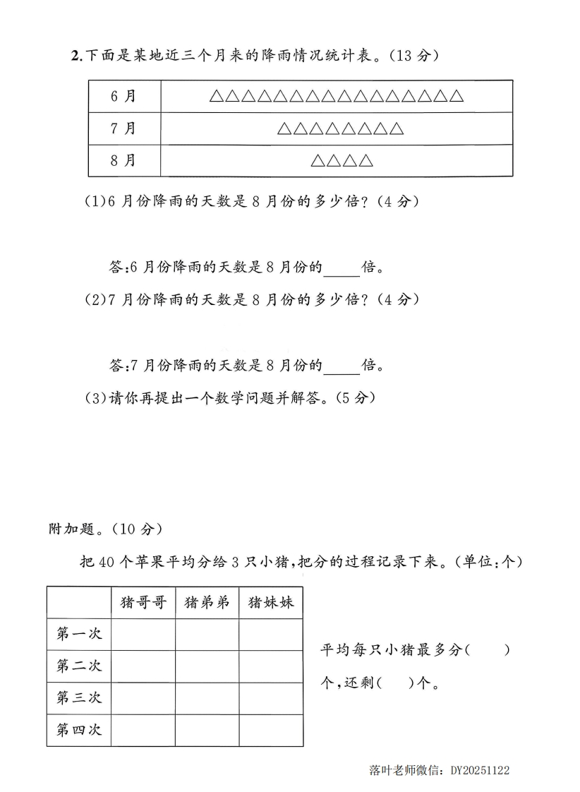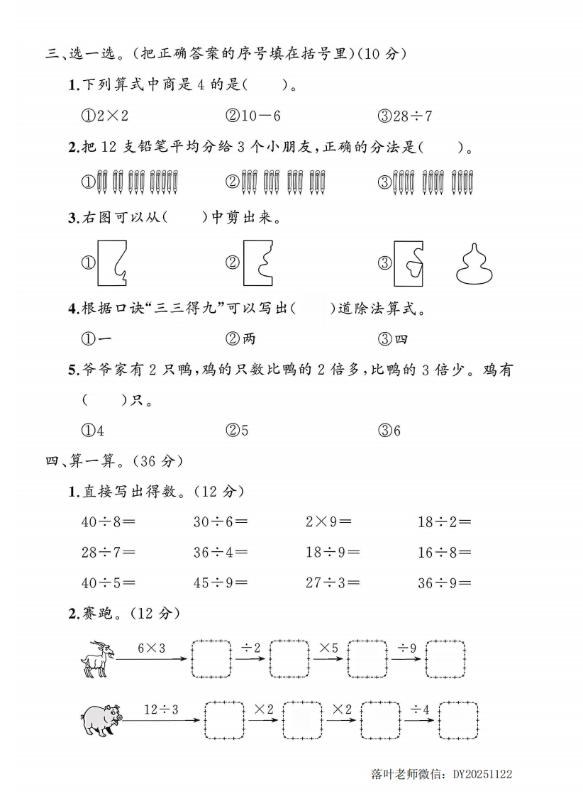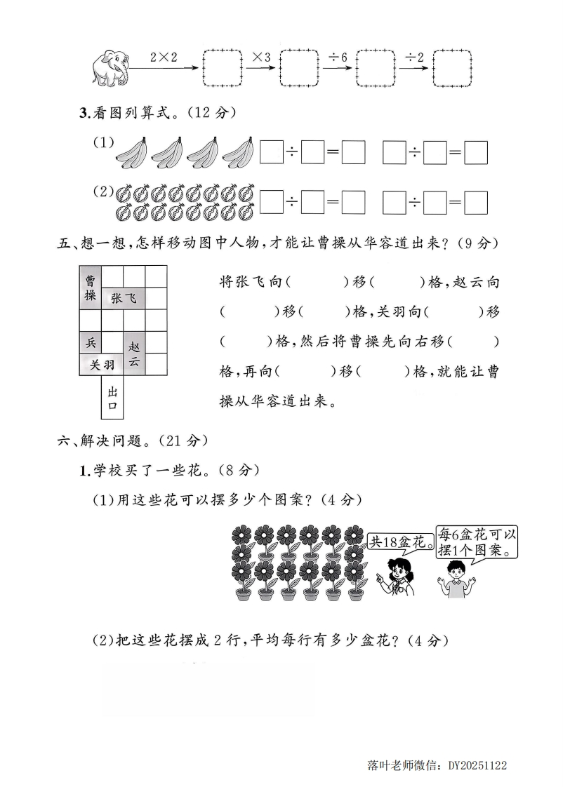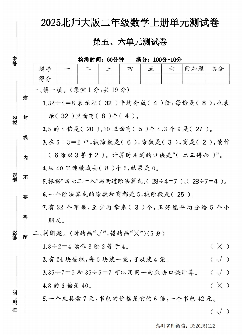2025北师大版二年级数学上册单元测试卷第五、六单元测试卷霸检测时间:60分钟满分:100分+10分题序三四五六附加题总分得分一、填一填。(每空1分,共19分)弥1.32÷4=8表示把()平均分成()份,每份是(),也表毁封示()里面有()个()。2.5的4倍是(),20里面有()个4,3个9是()。线3.在6÷3=2中,被除数是(),除数是(),商是(),读作内()。计算时用到的口诀是“()”。4.从40里连续减去()个5,结果是0。蕾不5.根据“四七二十八”写两道除法算式:()、()。要6.一个除法算式的除数和商都是5,被除数是(7.有22个苹果,至少再拿来()个,正好能平均分给5个小答朋友。第题二、判断题。(对的画“/”,错的画“X”)(5分)1.8÷2=4读作8除2等于4。)2.有24块蛋糕,每6块装一袋,可以装4袋。()3.35÷7=5和35÷5=7可以用同一句乘法口决计算。)4.8的6倍是40。()5.一个文具盒7元,书包的价格是它的6倍,一个书包42元。)落叶老师微信:DY20251122