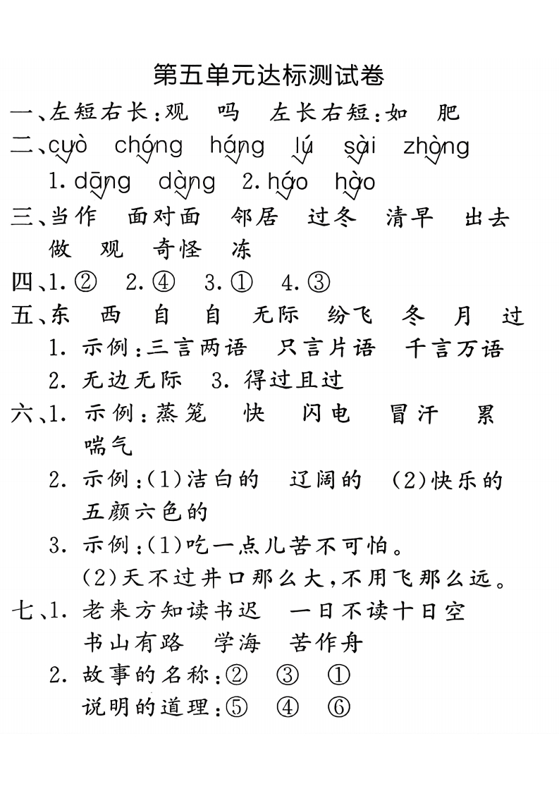 2025年人教版二年级语文上册五单元测试卷五单元测试卷一、将汉字按要求分类,写到下面的田字格里。(4分)》左短右长左长右短二、用“/”给下列加点字选择正确的读音。(5分)敬弄错(cuòchuo)重复(chóngzhòng)排行(xinghang)葫芦(úIǘ)比赛(saisai)种地(zhòngzhǒng)1.我们在外要当(dang dàng)心,避免上当(dangdang)。2.他在号(haohào)叫的大风中喊着号(haohào)子跑步。三、读语段,根据拼音写字词。(18分)dang zuomian duimian寒号鸟把崖缝自己的窝,喜鹊与它住着,linguòdōngqing zǒochu他们俩成了马上喜鹊飞Zuòguanqiguài东寻西找忙着窝,寒号鸟却在睡觉景。真寒号鸟dòng不怕冬天挨吗?四、下面的句子该用怎样的语气读呢?选一选。(填序号)(4分)①急切②不相信③期待④赞美1.天不过井口那么大,还用飞那么远吗?2.多么可爱的小葫芦啊!