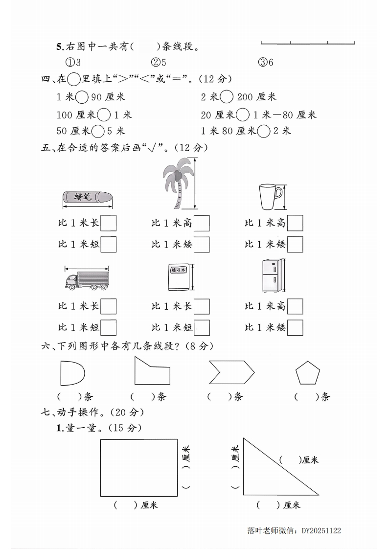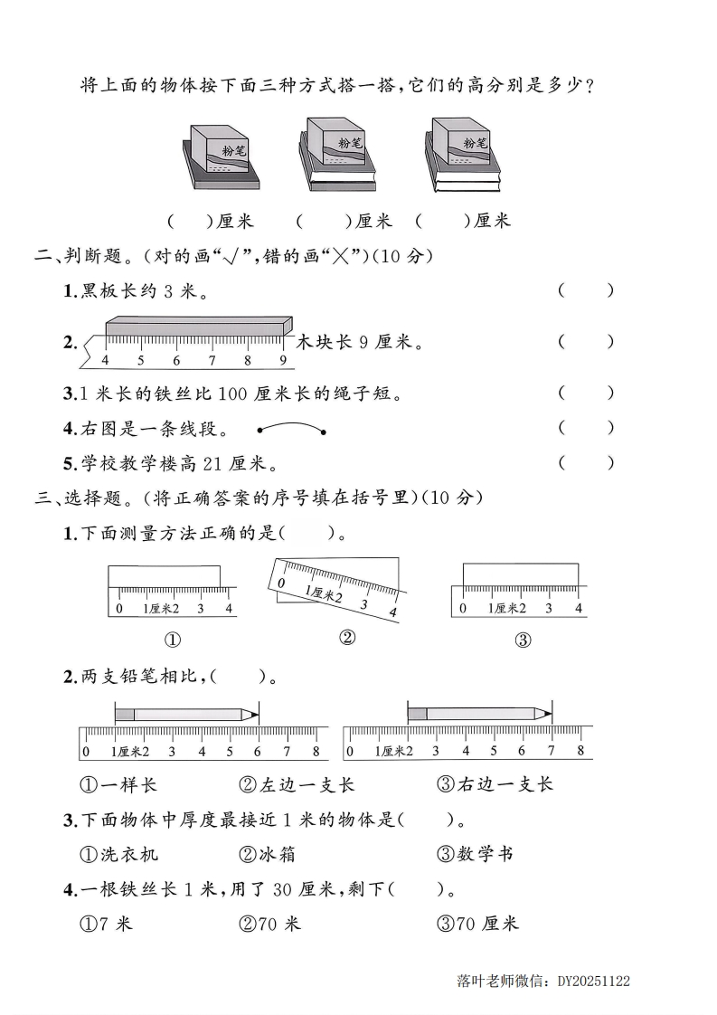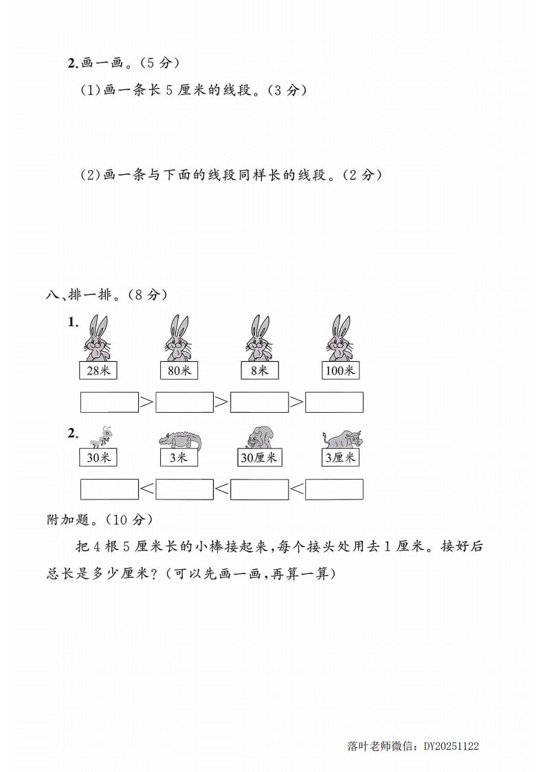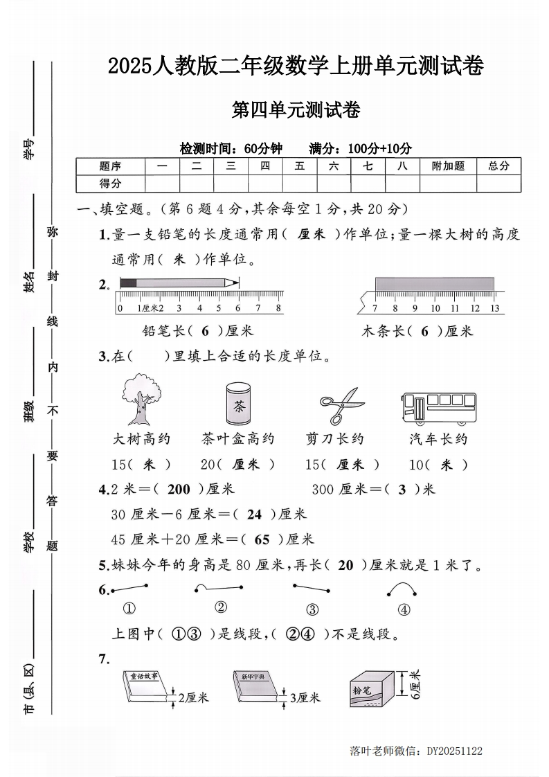 2025人教版二年级数学上册单元测试卷第四单元测试卷靠检测时间:60分钟满分:100分+10分题序二三四五六七八附加题总分得分一、填空题。(第6题4分,其余每空1分,共20分)弥1.量一支铅笔的长度通常用()作单位;量一棵大树的高度通常用()作单位。毁封2.T平中01厘米23456788910111213线铅笔长()厘米木条长()厘米3.在()里填上合适的长度单位。内蠻不茶大树高约茶叶盒高约剪刀长约汽车长约要15(20(15(10()4.2米=()厘米300厘米=()米答30厘米一6厘米=()厘米靠题45厘米+20厘米=()厘米5.妹妹今年的身高是80厘米,再长()厘米就是1米了。6.。①②③④上图中()是线段,()不是线段。7.话故2厘米3厘米粉笔落叶老师微信:DY20251122