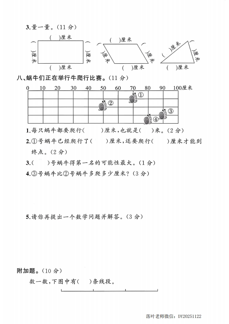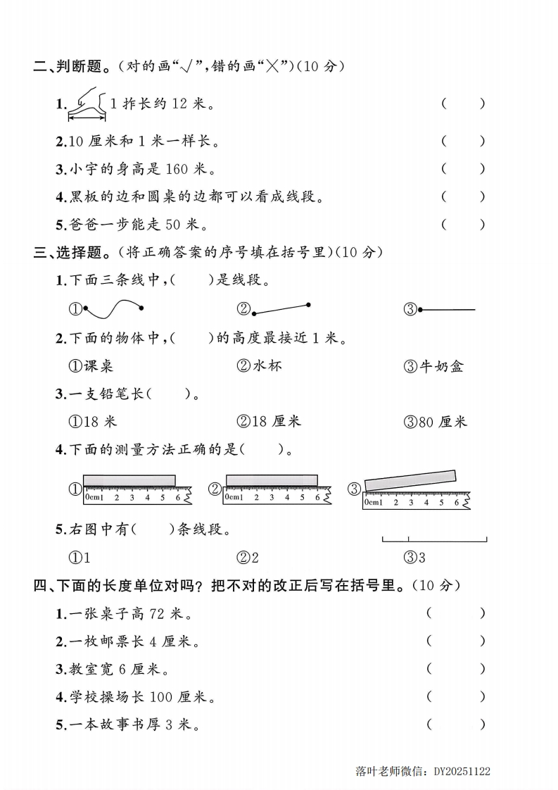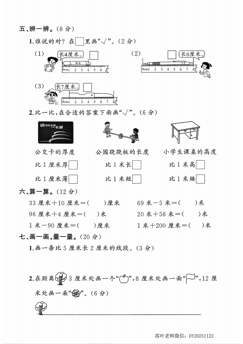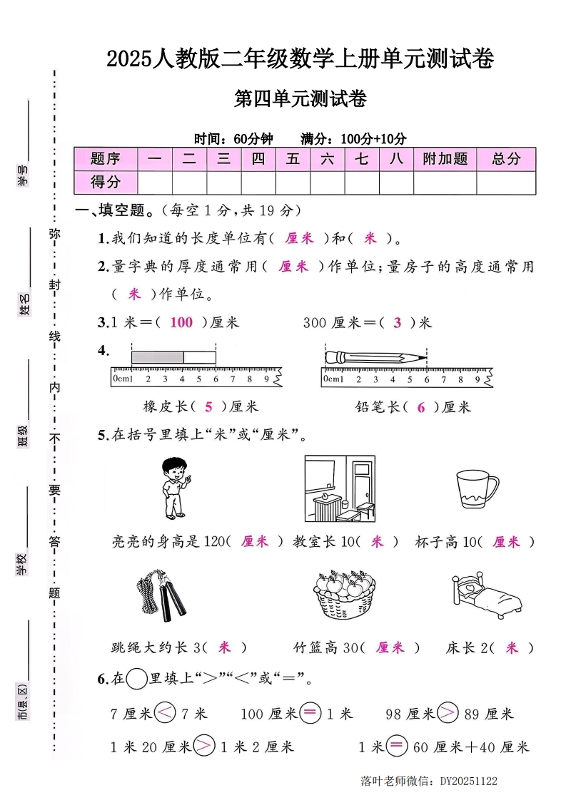 2025人教版二年级数学上册单元测试卷:第四单元测试卷:时间:60分钟满分:100分+10分题序三四五六七八附加题总分鄂得分一、填空题。(每空1分,共19分)弥1.我们知道的长度单位有()和()。2.量字典的厚度通常用()作单位;量房子的高度通常用封毁()作单位。3.1米=()厘米300厘米=()米线40cml23456789234567内橡皮长()厘米铅笔长()厘米不5,在括号里填上“米”或“厘米”。要亮亮的身高是120()教室长10(杯子高10(繁1题:跳绳大约长3(竹篮高30(床长2(:6.在()里填上“>”“<”或“=”。7厘米(○7米100厘米()1米98厘米()89厘米1米20厘米(○1米2厘米1米60厘米十40厘米落叶老师微信:DY20251122