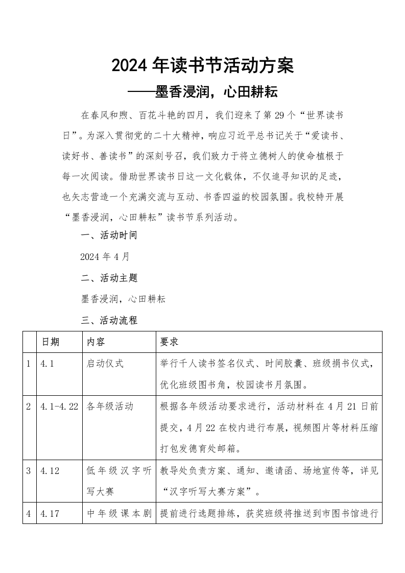 2024年读书节活动方案墨香浸润,心田耕耘在春风和煦、百花斗艳的四月,我们迎来了第29个“世界读书日”。为深入贯彻党的二十大精神,响应习近平总书记关于“爱读书、读好书、善读书”的深刻号召,我们致力于将立德树人的使命植根于每一次阅读。借助世界读书日这一文化载体,不仅追寻知识的足迹,也矢志营造一个充满交流与互动、书香四溢的校园氛围。我校特开展“墨香浸润,心田耕耘”读书节系列活动。一、活动时间2024年4月二、活动主题墨香浸润,心田耕耘三、活动流程日期内容要求14.1启动仪式举行千人读书签名仪式、时间胶囊、班级捐书仪式,优化班级图书角,校园读书月氛围。24.1-4.22各年级活动根据各年级活动要求进行,活动材料在4月21日前提交,4月22在校内进行布展,视频图片等材料压缩打包发德育处邮箱。34.12低年级汉字听教导处负责方案、通知、邀请函、场地宣传等,详见写大赛“汉字听写大赛方案”。44.17中年级课本剧提前进行选题排练,获奖班级将推送到市图书馆进行