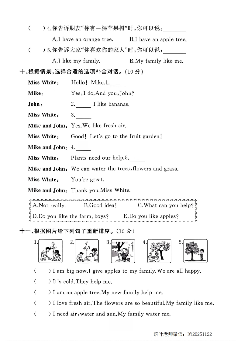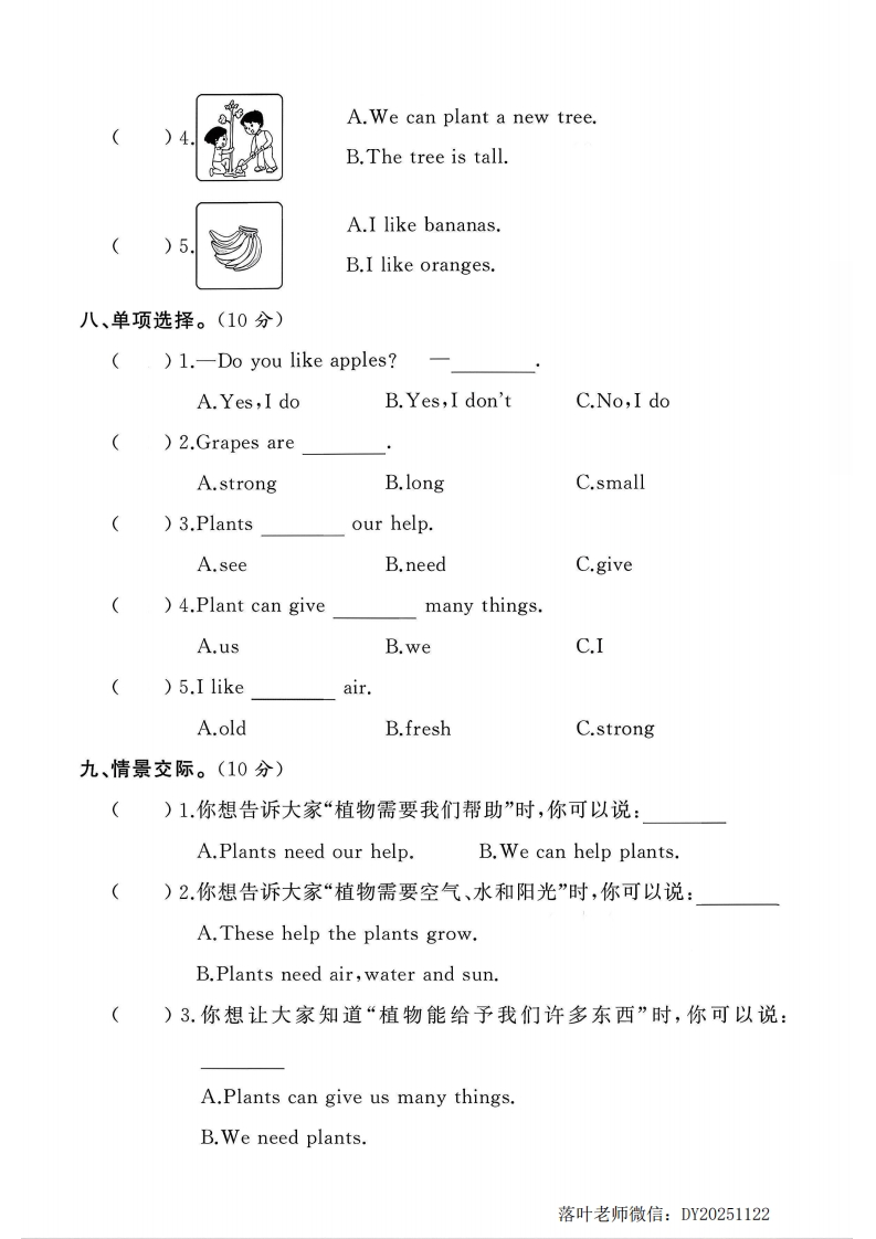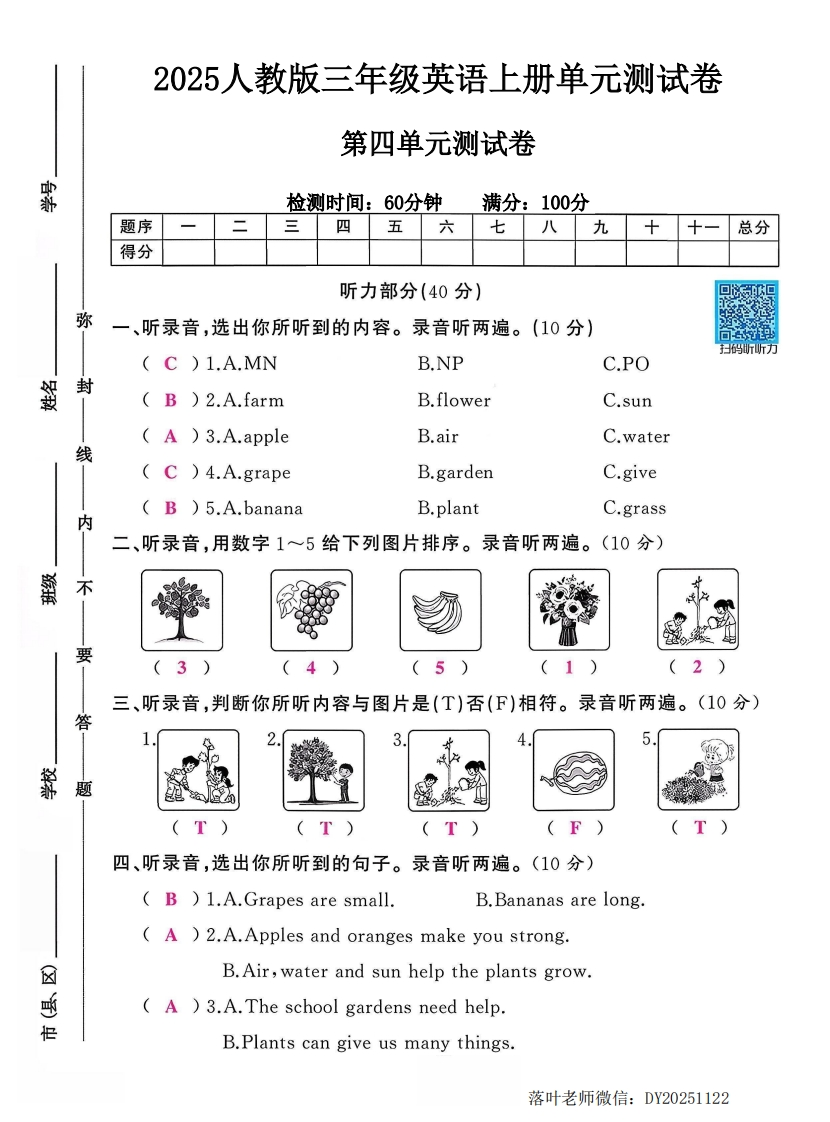 2025人教版三年级英语上册单元测试卷第四单元测试卷霈检测时间:60分钟满分:100分题序三四五六七八九+十一总分得分听力部分(40分)弥一、听录音,选出你所听到的内容。录音听两遍。(10分)】()1.A.MNB.NPC.PO毁封()2.A.farmB.flowerC.sun)3.A.appleB.airC.water线()4.A.grapeB.gardenC.give()5.A.bananaB.plantC.grass内二、听录音,用数字1~5给下列图片排序。录音听两遍。(10分)童不要三、听录音,判断你所听内容与图片是(T)否(F)相符。录音听两遍。(10分)答235荞题四、听录音,选出你所听到的句子。录音听两遍。(10分)()1.A.Grapes are small.B.Bananas are long.()2.A.Apples and oranges make you strong.B.Air,water and sun help the plants grow.)3.A.The school gardens need help.B.Plants can give us many things.落叶老师微信:DY20251122