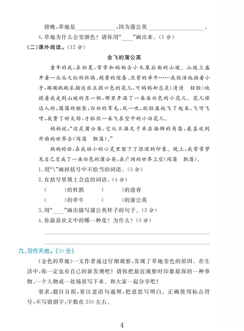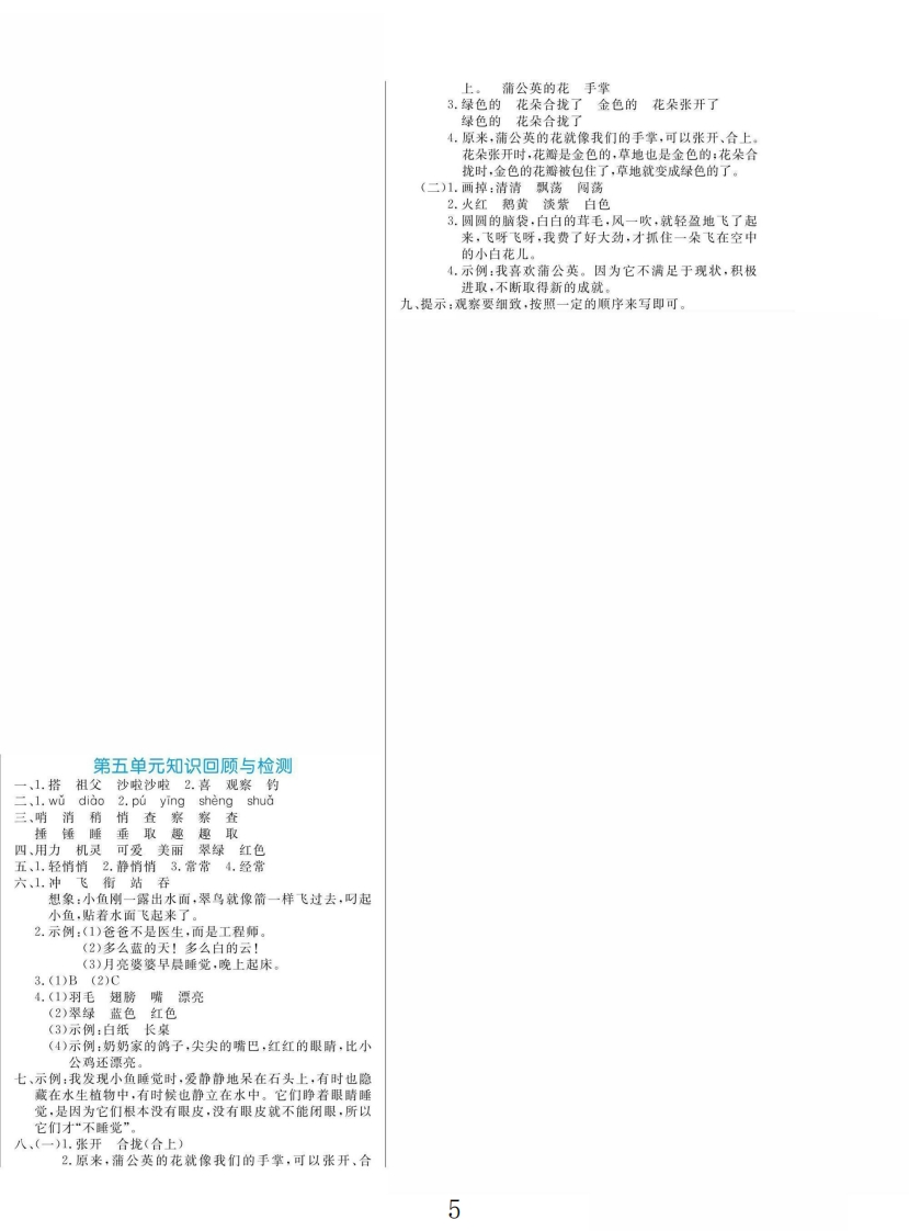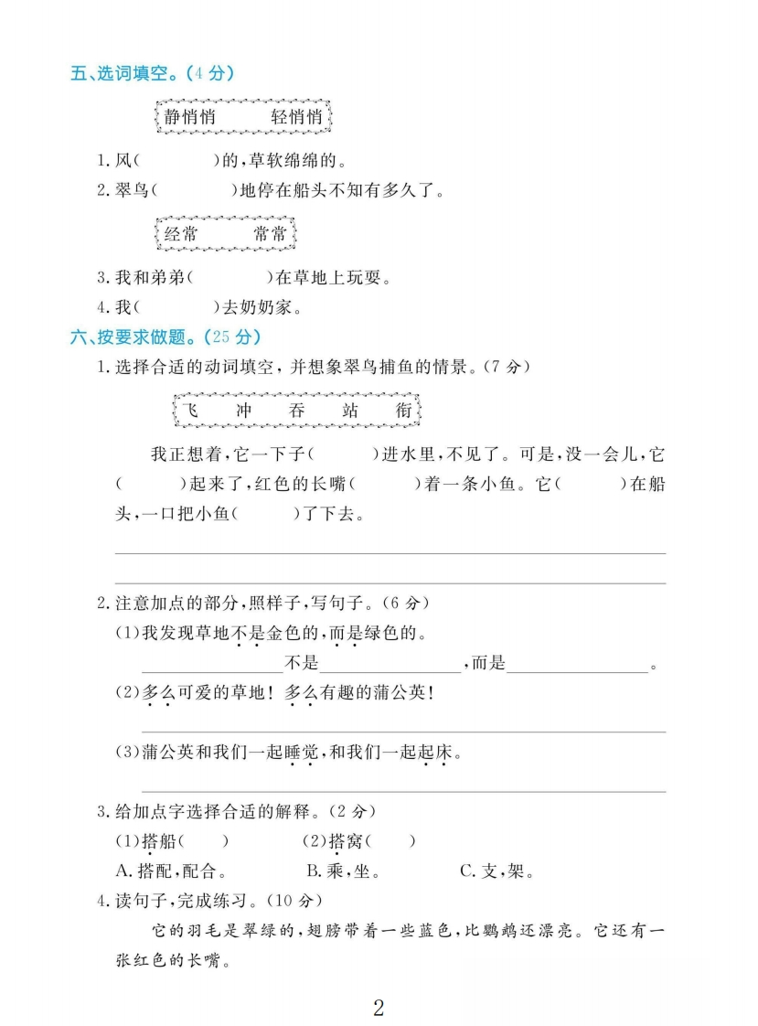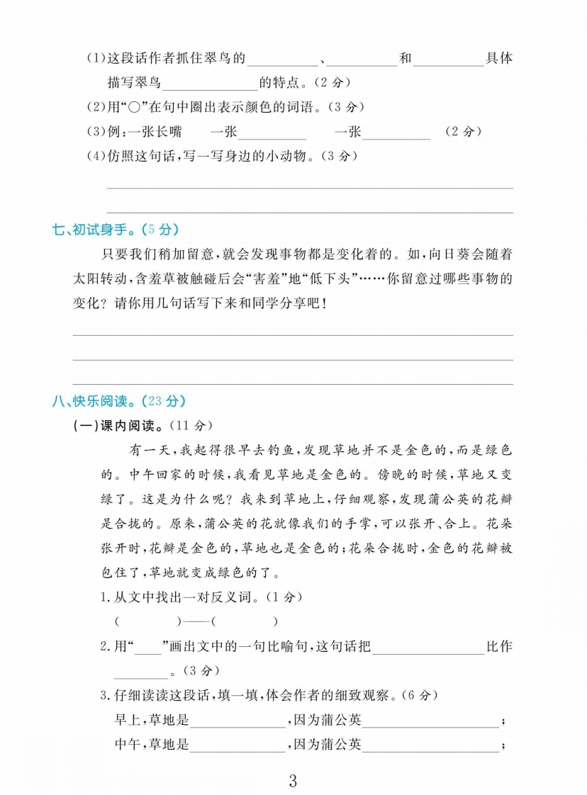 2025三年级语文上册第五单元测试卷第五单元测试卷时间:60分钟满分:100分题号三四五六七八九总分孙得分、读拼音,写词语。(6分)1.我和母亲d6()船去z心fù()家,我们坐在船舱里。雨点打在船篷上,shālā(sha la()地响。2.我xi()欢guan cha()爷爷dià0()鱼。T二、给加点的字选择正确的读音画“/”。(6分)拟杯1.一只比鹦鹉(wǔwu)还漂亮的翠鸟站在船头看我们钓(diàodào)鱼。2.蒲(púbú)公英(yingyin)盛(shengchéng)开的时候,我们在草地上玩耍(shuǎyào).三、易混字辨析组词。(8分)消稍哨察查条常口()灭)阅观()粗()息)然)觉)找睡锤垂捶取趣)背铁())乐有()(轻)觉)柳()味争()训四、在括号里填上合适的词语。(3分))地摇橹)的翠鸟)的草地()的花瓣()的羽毛)的长嘴1