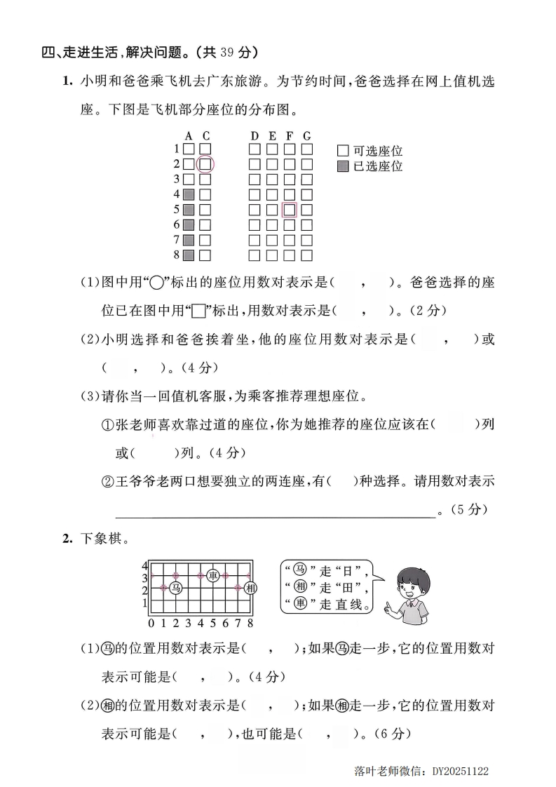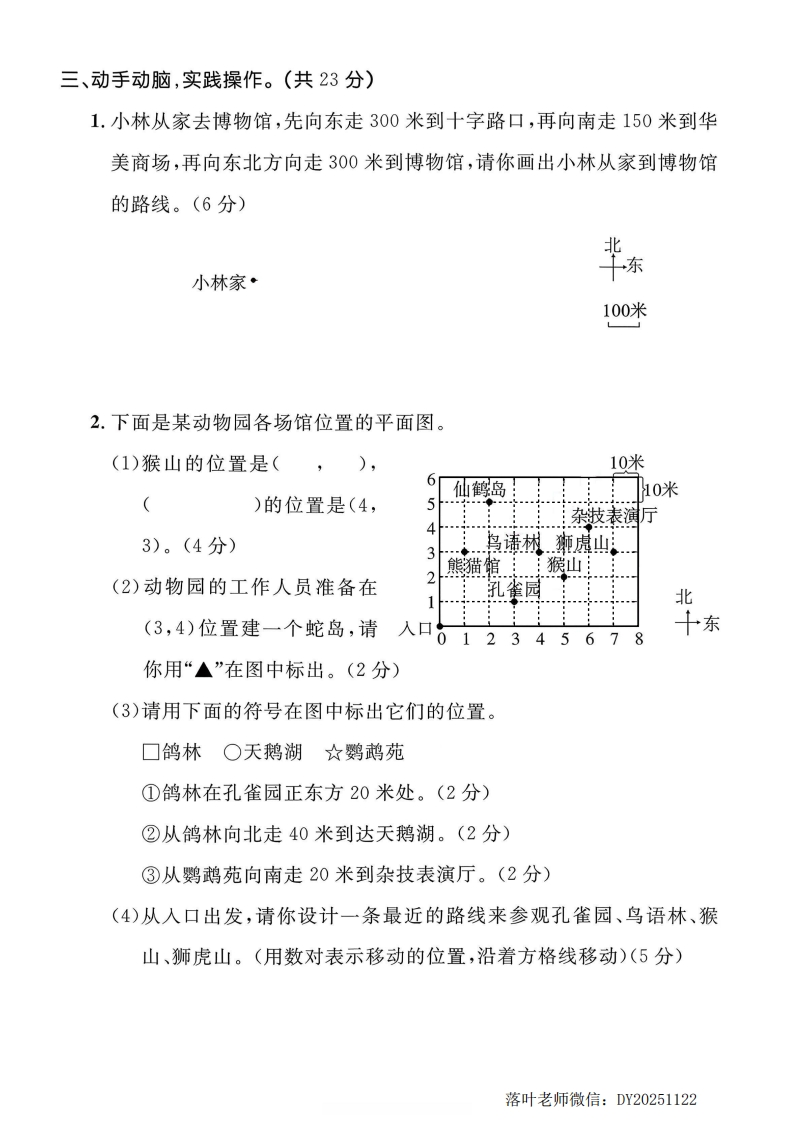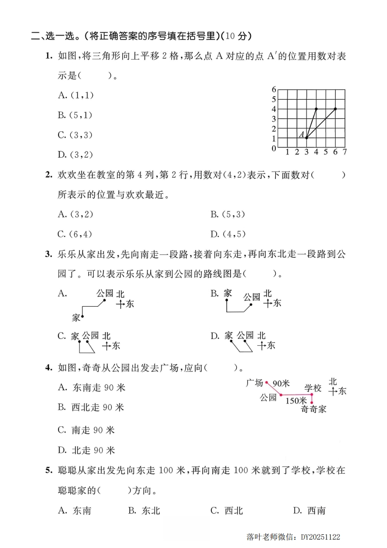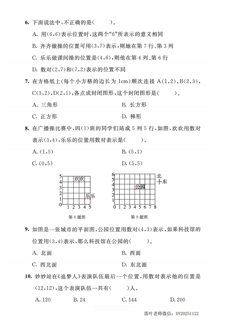 2025北师大版四年级数学上册单元测试卷第五单元测试卷(时间:90分钟分数:100分+10分)一、填一填。(每空1分,共28分)1.明明坐在教室的第2组第6排,用数对表示是(,),丽丽坐在第4组第3排,用数对表示是(,)。2.小米买的音乐会门票是“4排5号”用(4,5)来表示,那么(13,7)表示的位置是()排()号。3.欢欢去图书馆看书,他从家出发向东走200米到影视城,再向东北走120米到图书馆;如果按原路回家,他从图书馆出发向()走()米到影视城,再向()走()米回到家。4.根据公交车路线图回答下面问题。501路北62路停车场新民小学→东书店博物馆“广场商场。动物园电影院体育馆图书馆医院“科技馆(1)501公交车的行车路线:从停车场出发,先向()行驶2站到新民小学,再向()行驶()站到图书馆,最后向()行驶()站到()。(2)62路公交车的行车路线:从停车场出发,先向()行驶2站到体育馆,再向()行驶2站到(),最后向()行驶()站到()。985.五子棋的规则是先形成五子连线者获胜。6(1)请你用数对分别表示图中六颗黑棋的位置(,),(,),(,),(,),、3(,),(,)。2(2)如果下一步轮到黑棋来下,黑棋要想赢得23456789这一局,应该把棋子放在(,)或(,)的位置。落叶老师微信:DY20251122