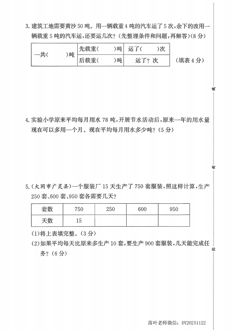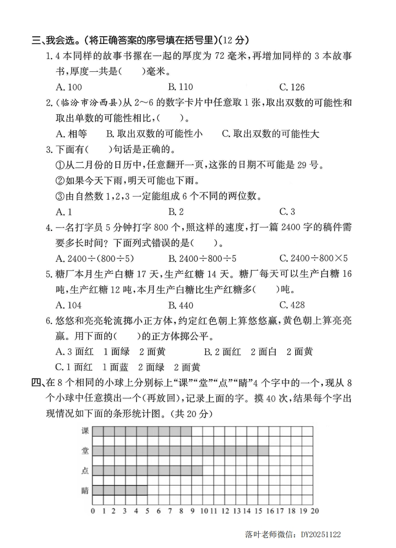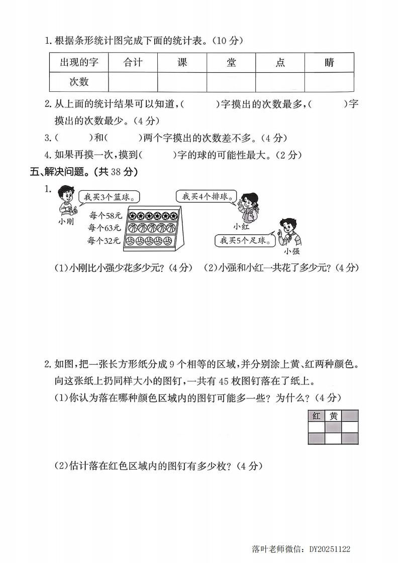 2025苏教版四年级数学上册单元测试卷第五、六单元综合测试卷(时间:90分钟分数:100分)一、我会填。(每空2分,共20分)1.口袋里有5块红色橡皮,3块黄色橡皮,橡皮的形状、大小相同,从中任意摸一块橡皮,摸到()色橡皮的可能性大,如果想使摸到两种颜色的橡皮的可能性相等,需要再往口袋中放人()色橡皮()块,如果想使摸到黄色橡皮的可能性大,至少要往口袋中放入()色橡皮()块。2.王阿姨去花店买花,买3盆郁金香,一共用去69元,买2盆玉树,一共用去52元,一盆玉树比一盆郁金香贵()元。3.某林场计划栽800棵树,已经栽了3天,每天栽140棵,剩下的打算用2n天栽完,剩下的平均每天要栽()棵。4.手工小组做一批工艺品,6个人10天完成,照这样计算,如果增加4人,()天就能完成。5.用一个杯子向空瓶里倒水,倒进3杯水后,连瓶重380克,倒进8杯水后,连瓶重680克,一杯水的质量是()克,这个空瓶的质量是)克。二、我会判断。(对的打“√”,错的打“×”)(10分)想1.乐乐抛一枚1元硬币,正面朝上与反面朝上的可能性相等。()2.每包袜子6双,每双5元,60元能买12包。3.洋洋打篮球时常常“十投九中”。在某场比赛中,他前9次投球全部投中,看球的小明说“太可惜了,下一次投球他就投不进了。”()4.一根木头被锯成3段共用了8分钟,照这样计算,如果把这根木头锯成6除段,需要20分钟。()5.四(1)班有48人,其中男生26人,班里投票选1名同学当劳动委员,那么这个劳动委员是女生的可能性比较大。()落叶老师微信:DY20251122