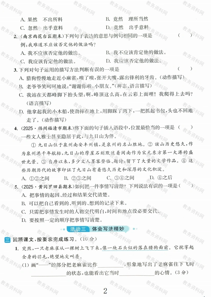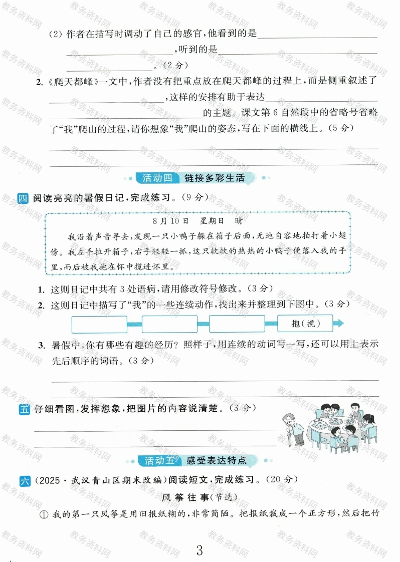 2025四年级语文上册第五单元测试卷第五单元测试卷时间:90分钟满分:100分如再高的山,一步步努力也能登顶;再矮的山,不迈开双脚也无法征服。下面让我们迈开步子,一起登上知识的高峰吧!。活动一分享生活日记亮点原创读语段,按要求完成练习。(18分)jiàri()里,爷爷带我pan()登黄山天都峰。起初,我激情满怀,脚步轻快地走在山路上。然而,当看着望不到尽头的shi ji()时,我的激情渐渐消退,shenqu()也愈发沉重,感觉失去了继续爬的iIiàng()。爷爷见状,笑呵(hehā)呵地摸着我的(辨辨)子,分明是看出了我的退缩,便说:“乖孙女,我们来爬山是为了征服自己,不是为了征服山峰。你看爷爷nian ji()很大,依然脚步轻盈。只要保持乐观,没有什么征服不了的。加油!”在爷爷的g心wǔ()下,我重新振作了起来,抓住铁iàn(·)继续往上爬。最终,我们登上了山顶,拍了一张相(xiang xicàng)片作为jiniàn()。站在顶峰,俯瞰云海,我有一种雄鹰(博搏)击长空、傲视天下的感觉。那一刻,深刻体会到了爷爷所说的话的含义。1.根据拼音写字词。(8分)鴼2.用“√”画出括号里正确的字或加点字的正确读音。(4分)3.在语段横线处填入合适的关联词。(2分)4.加点词“分明”有两种解释(如右图),该词在语段中应选分明:①清楚;②明择第种解释。请你用另外一种解释写一个句子:明,显然。。(2分)5.画“一”的句子有语病,请你写出修改后的句子。(2分)活动二品析语言文字已选择正确的答案。(填序号)(10分)1.依次填入横线处的词语,最合适的一项是“老先生八十高龄了,居然能爬到顶峰,真让人敬佩。”句中的“居然”一词可以替换成近义词“”,同样给人的感觉。1