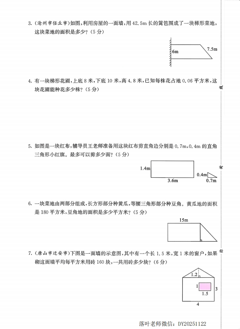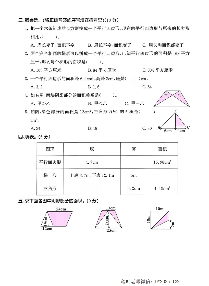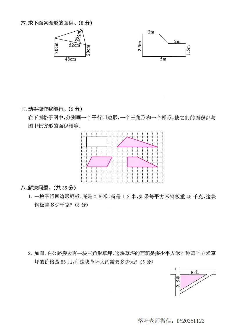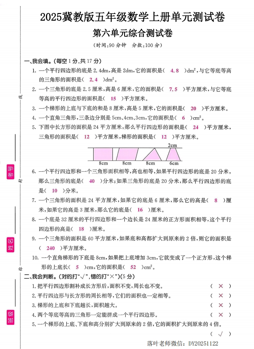 2025冀教版五年级数学上册单元测试卷第六单元综合测试卷(时间:90分钟分数:100分)一、我会填。(每空1分,共17分)1.一个平行四边形的底是2.4dm,高是2dm,它的面积是()dm,与它等底等高的三角形的面积是()dm2。2.一个三角形的底是2.5厘米,高是6厘米,它的面积是()平方厘米,与它等底等高的平行四边形的面积是()平方厘米。3.一个梯形的上底与下底的和是8厘米,高是5厘米,它的面积是()平方厘米。4.一个直角三角形,三条边分别是5cm、4cm、3cm,它的面积是()cm2。5.下图中长方形的面积是24平方厘米,那么平行四边形的面积是()平方厘米,三角形的面积是()平方厘米,梯形的面积是()平方厘米。2cm8cm8cm8cm6cmn6.一个平行四边形和一个三角形面积相等,高也相等,如果平行四边形的底是20分米,那么三角形的底是()分米;如果三角形的底是20分米,那么平行四边形的底是()分米。7.一个三角形的面积是24平方厘米,如果它的底是6厘米,那么它的高是()厘米,如果它的高是3厘米,那么它的底是()厘米。8.一个底是32厘米的平行四边形和一个边长是24厘米的正方形面积相等,这个平行四边形的高是()厘米。9.一个三角形的面积是60平方厘米,如果底和高都扩大到原来的2倍,则它的面积是拟()平方厘米。10.一个直角梯形的下底是8cm,如果把上底增加3cm,它就变成了一个正方形,这个梯的形的上底长()cm,它的面积是()cm。二、我会判断。(对的打“√”,错的打“×”)(5分)1.把平行四边形割补成长方形后,面积不变,周长也不变。)2.平行四边形与长方形的周长相等,它们的面积也一定相等。()3.梯形的上底和下底越长,面积越大。()4.两个等底等高的三角形一定能拼成一个平行四边形。(5.一个梯形的上底、下底和高分别扩大到原来的2倍,它的面积扩大到原来的4倍。(落叶老师微信:DY20251122