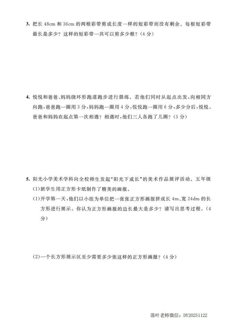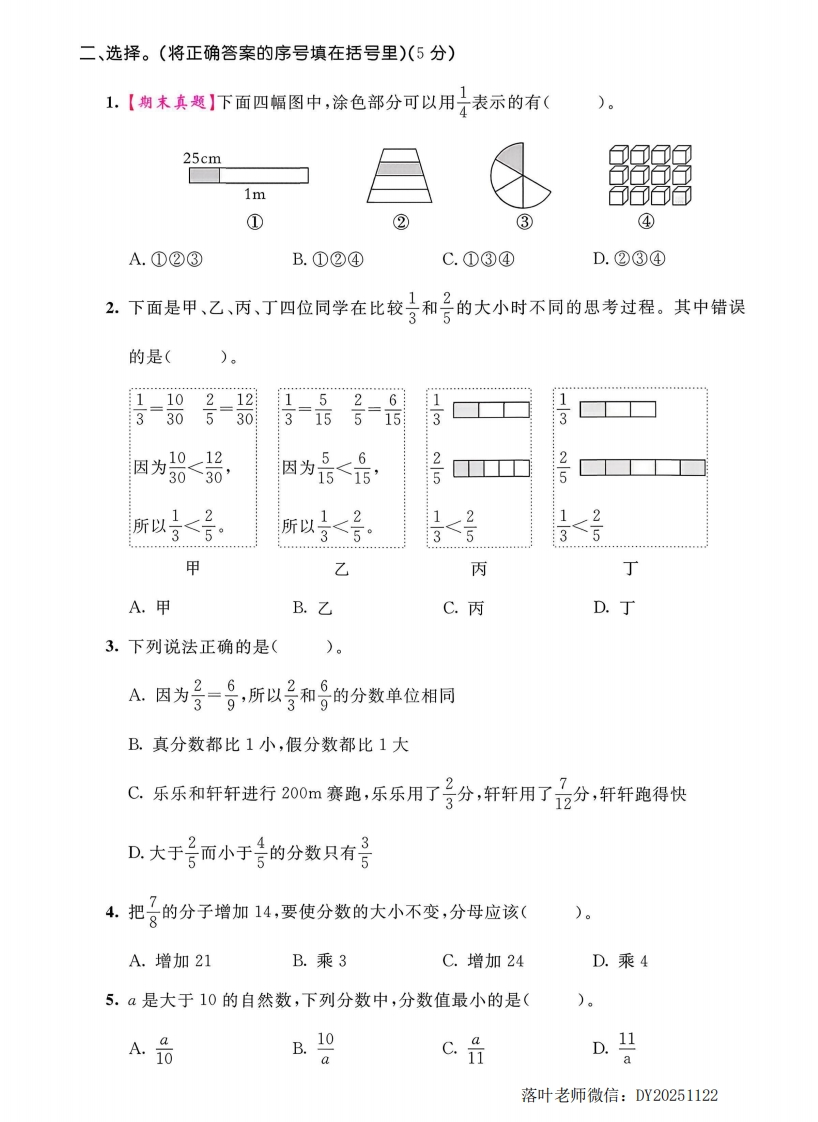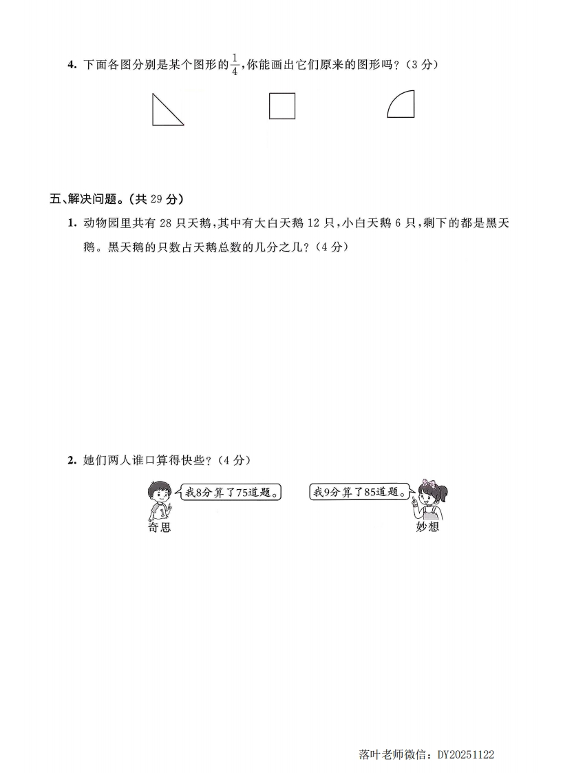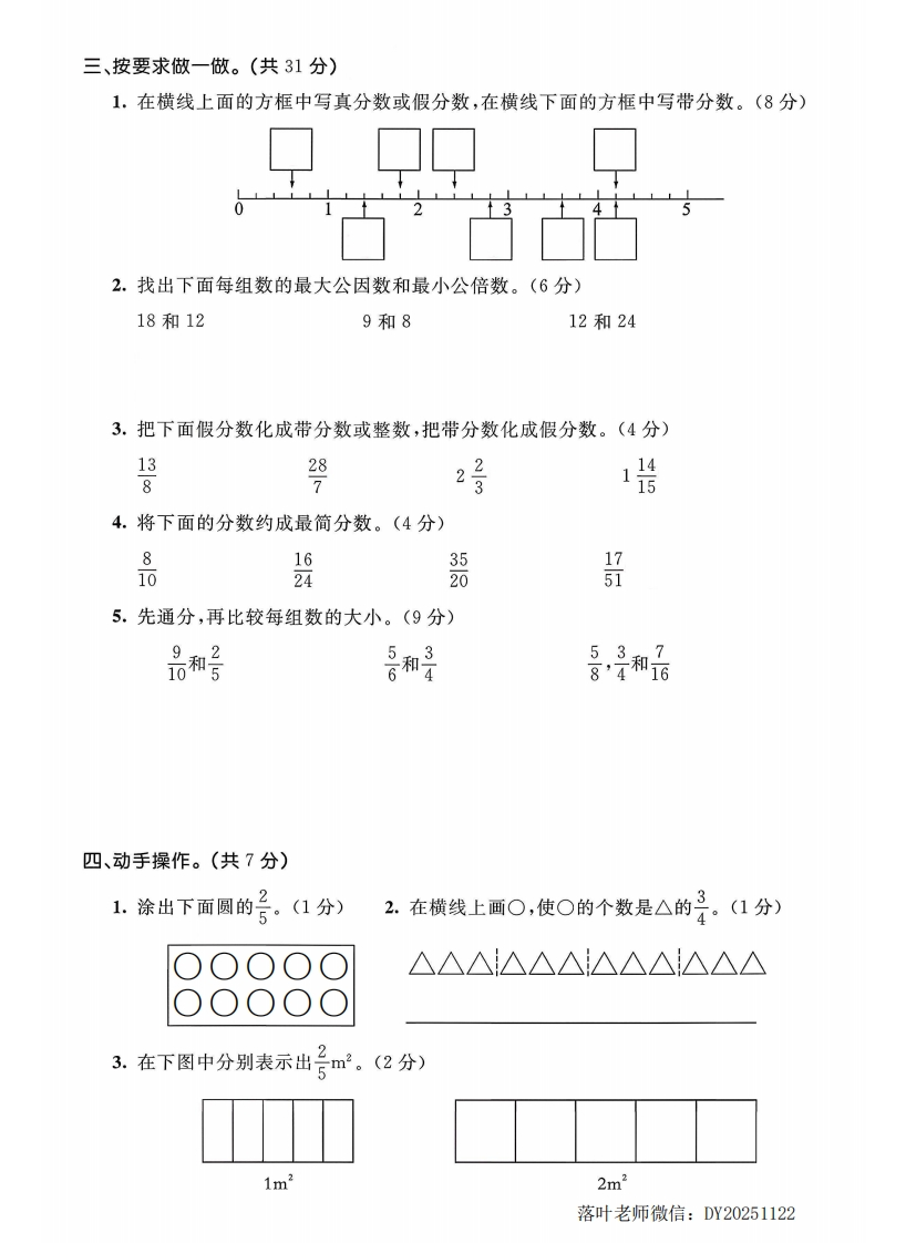 2025北师大版五年级数学上册单元测试卷第五单元测试卷时间:90分钟分数:100分+10分一、填空。(每空1分,共28分)1.用最简分数表示下面各图的阴影部分。口田2.在下面的括号中填上最简分数。40分=()时600千克=()吨8时=()日3.分数表示把一个整体平均分成()份,取其中的()份。4.把一根6m长的木棒平均分成7段,每段长()m,每段是6m的(),每段是1m的(5.在()里填上“>”“<”或“=”。○品○是○98O品6.分数单位是的最大真分数是(),最小假分数是()。7.()÷10==152=2015()。8.小明看-本180页的书,已看了30页,看了全书的号,还剩号没看。9.9是一个假分数,0是一个真分数,a=();a=()时,号是最小假分数;a=()时,品能化成最小带分数。10.五(1)班有男生26人,女生22人,女生人数是男生人数的(一),女生人数占全班总人数的(一)。落叶老师微信:DY20251122