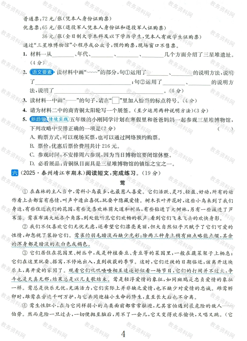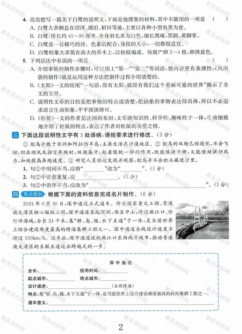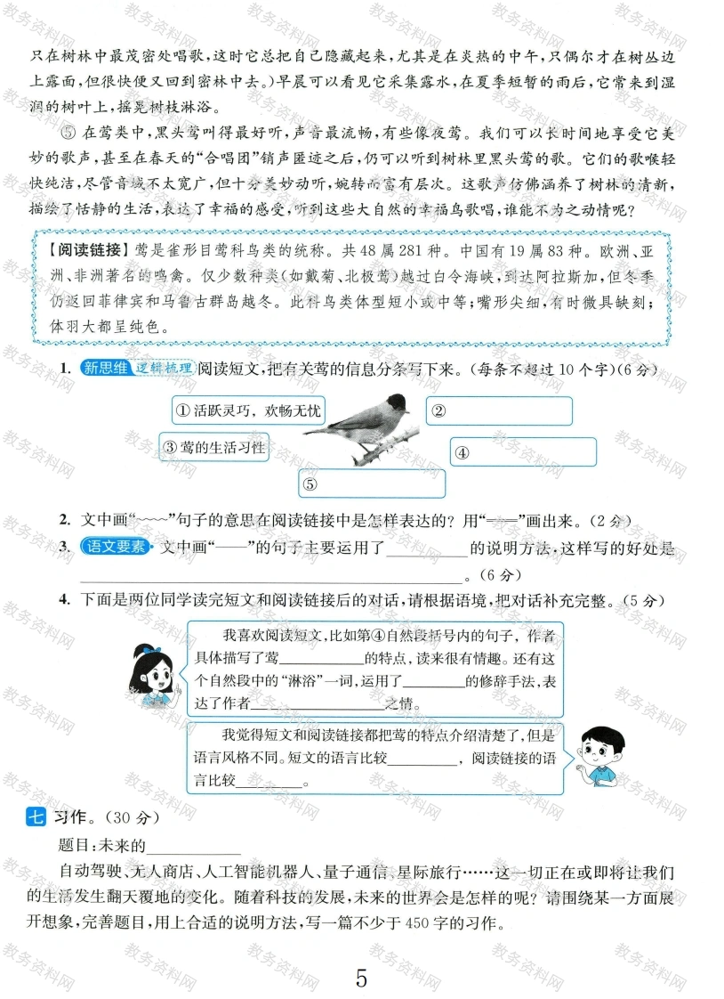 2025五年级语文上册第五单元测试卷第五单元测试卷时间:90分钟满分:100分中的新趋势语段综合读语段,按要求完成练习。(13分)松鼠面孔ling long()、ging xiu(),身体矫【jiāojiǎo】健,很讨人喜欢。尽管阳光有shājūn()的作用,但它们白天躲在窝里xiēidng(),晚上才出来活动。松鼠的窝通常搭在树枝分权【chāchà】的地方,既干净又暖和。窝口朝上,十分狭窄,勉【miǎnmǎn】强可以进出。窝口有一个圆锥【zui zhui】形的盖,把整个窝遮蔽起来,雨水不会落在窝里。松鼠fan zhi()能力较强,一胎大约生三四个。它们在秋天拾榛子,储备Iidgshi(),留到冬天吃。它们用爪子和牙齿shūi()全身的毛,身上总是千干净净的。1.给加点字选择正确的读音,打“√”。(4分)毁2.根据语境和拼音写词语。(7分)3.下列句子中的加点词语与语段中的“勉强”意思相同的一项是(2分)A.这点儿竹子,只勉强够一只成年熊猫吃一天B.你列举的理由很勉强,恐怕难以令人信服。C.当你不能胜任一件事的时候,越勉强自己去做反而越做不好。D.他不去算了,不要勉强他了。日选择正确的答案。(填序号)(10分)1.下列各组词语中搭配有误的一项是)巢A.吸收热量动作敏捷密切的关系严肃的态度B.捕捉信号阳光剧烈美丽的尾巴严谨的纪律C.治疗疾病微风吹拂清朗的夏夜严格的要求D.撑开袋口声音嘹亮矫健的步伐严厉的批评2.(广州海珠区月考)下列句子中,去掉加点字词后句意不变的一项是(A.松鼠不躲藏在地底下,经常在高处活动,像飞鸟一样住在树顶上。B.太阳大得很,约一百三十万个地球的体积才能抵得上一个太阳。C.鲸的寿命很长,一般可以活几十年,有的甚至能活近一百年。D.鲸生活在海洋里,因为体形像鱼,许多人管它叫鲸鱼。3.语文要素·下面的语段中,没有运用到的说明方法是(在静谧的海面上,会突然出现一个巨大的、深陷的深蓝色圆形水域,从高空看,仿佛是大海的瞳孔,它散发着神秘、深邃、奇异的蓝光,被人们称为蓝洞。以迪恩斯蓝洞为例,它深达202米,当潜水员进入其中时会严重缺氧。这样神秘的自然现象又会藏着怎样的秘密呢?A.举例子B.列数字C.打比方D.作比较1