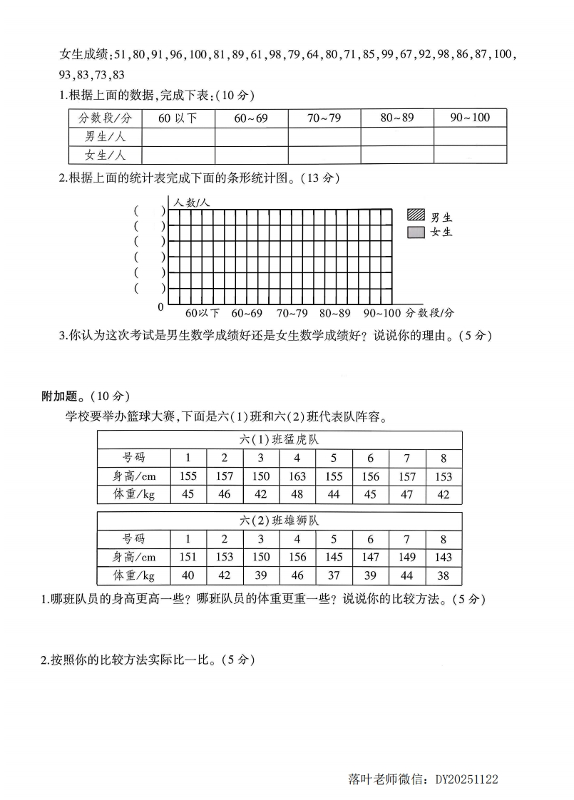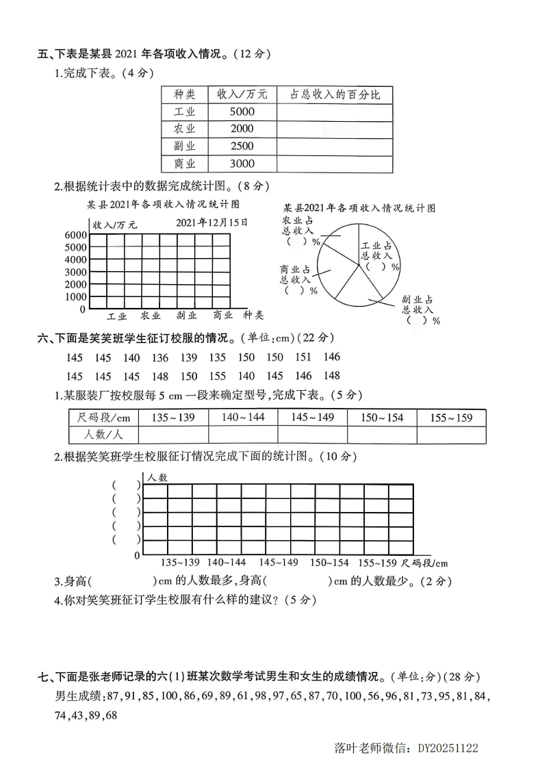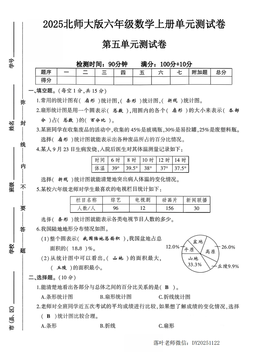 2025北师大版六年级数学上册单元测试卷第五单元测试卷检测时间:90分钟满分:100分+10分题序三四五六七附加题总分得分一、填空题。(每空1分,共15分)》弥1.常用的统计图有()统计图,()统计图,()统计图。2.扇形统计图是用一个圆表示(),用圆内的各个()的大小来表示(封)占()的()。製3.某班同学在收集废品的活动中,收集的45%是玻璃瓶,30%是易拉罐,25%是废塑料瓶。选择()统计图就能表示出各种废品所占的百分比情况。线4.某人9月23日生病发烧,人院后医生对其体温测量记录如下:时间6时8时10时12时14时内体温39°39.538°37°37.5°选择()统计图就能清楚地突出病人体温的变化情况。不5.某校六年级老师对学生最喜欢的电视栏目统计如下:栏目名称综艺电视剧动画片新闻联播要人数/人961215630选择()统计图就能表示各类电视节目人数的多少。答6.我国陆地地形分布情况如图。(1)整个圆表示(),我国盆地占总盆地荞题面积的()%。12.0%平原26.0%高原(2)从统计图中可以看出,()的面积最大,山地)的面积最小。33.3%(丘陵9.9%二、选择题。(10分)1.能清楚地看出各部分与总体之间的百分比关系的是(A.条形统计图B.扇形统计图C.折线统计图☒2.老师对全班同学近五次考试的平均成绩进行比较,如果想了解成绩的变化情况,选择()统计图比较合理。侣A.条形B.折线C.扇形落叶老师微信:DY20251122