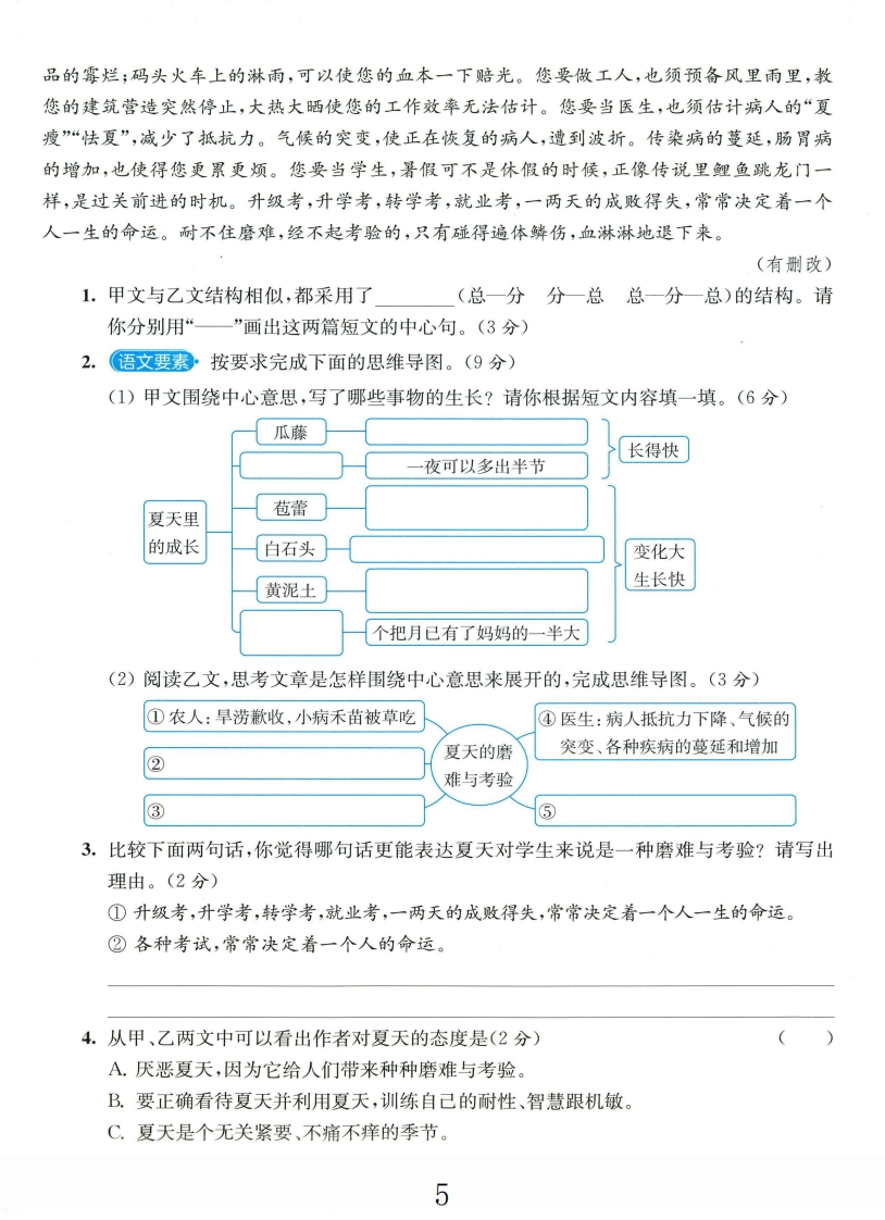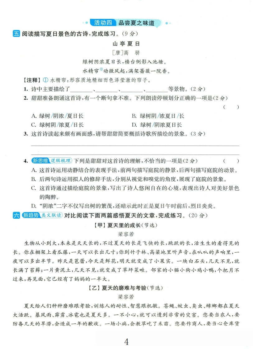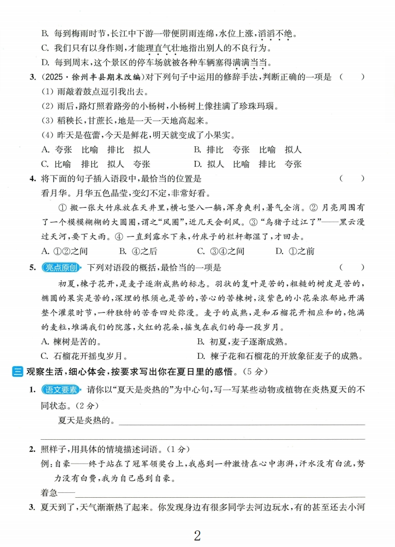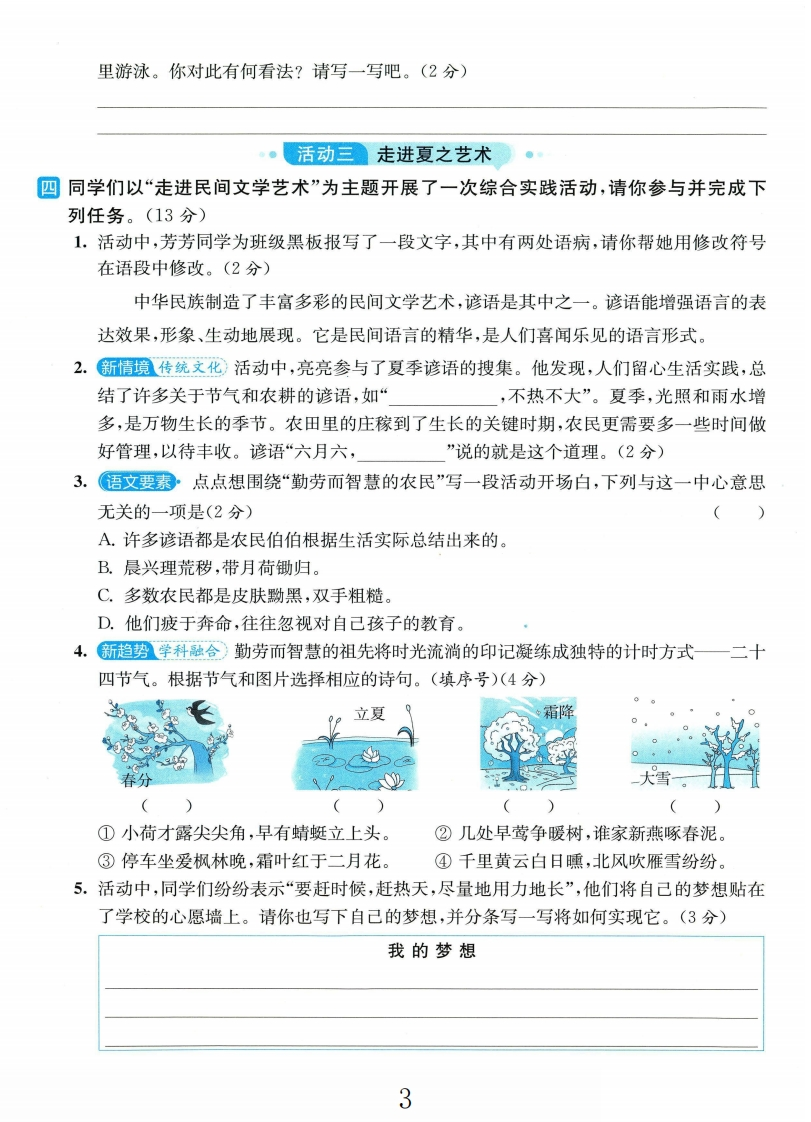 2025六年级语文上册第五单元测试卷第五单元测试卷时间:90分钟满分:100分4夏天是万物生长的季节,是生机盎然的季节,是热情洋溢的季节,也是历经考验的季节。夏之滋味,耐人寻味。六年级(1)班开展了“夏之韵”主题活动,请你一起参与吧!·活动一欣赏夏之画卷。·新趋势语段综合随着立夏节气的到来,夏日气息扑面而来,同学们就“邂逅夏日之美”展开了讨论。读下面的对话,完成练习。(13分)聪聪:我最喜欢的季节是夏天。在夏天,我可以穿上yTgu()里我最喜欢的那件xùzi()上带哪吒图案的T恤去划船、漂流,特别开心。毁依依:我喜欢夏天的万物。wǎIan()的天空、壮观的pùbù()、茁壮成长的n6ngzuòwù()…这一切都让我陶醉。楠楠:夏日的早上,我喜欢到郊外散步。走在桥上,我发现了石头缝里长了一层薄(b0b6)薄的苔藓,河边是碧绿的草坪(pin ping),还有许多美丽的花儿正在竞相开放。在这里,我远离了xuan nào(),shuai diào()了烦恼,感受到前所未有的舒畅。1.用“√”给加点字选择正确的读音。(1分)2.根据拼音在括号里写出相应的词语。(7分)3.东东分别通过“猜、查、选”三种方法对汉字“缝"”进行了研究。(5分)第一步:【猜】根据形旁,他猜测这个字的意思与有关。第二步:【查】用音序查字法查字典,应先查大写字母,再查音节第三步:【选】根据字典中的解释,“石头缝”中的“缝”应选第种解释。缝(缝)fg①(一子、一儿)缝隙,裂开或自然露出的窄长口子:裂~墙~。②(一儿)物体接合的地方:这道一儿不直。活动二寻访夏之文化。二同学们与书相约,寻访夏之文化,开展了“夏之韵”知识竞赛。请你选择正确的答案。(填序号)(10分)1.下列词句中,书写有误的一项是A.遮盖软绵绵B.棚架嘴唇C.蝉噪林逾静,鸟鸣山更幽。D.处署不出头,割谷喂老牛。2.下列句子中的加点词语使用不恰当的一项是A.冒着四月的细雨,我们小心翼翼地走进苗圃,去亲近雨中的花朵。1