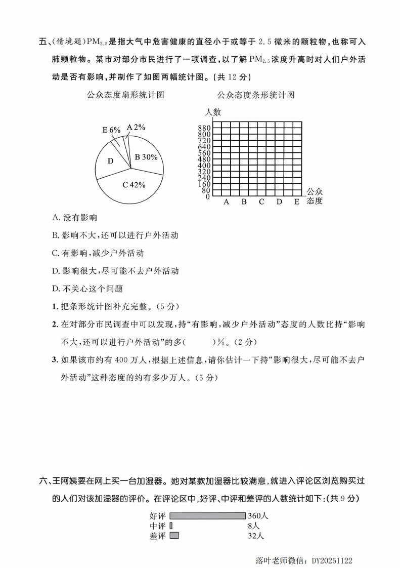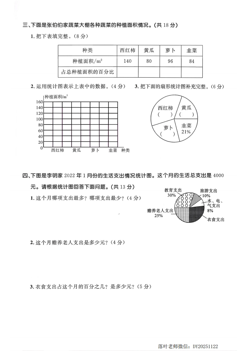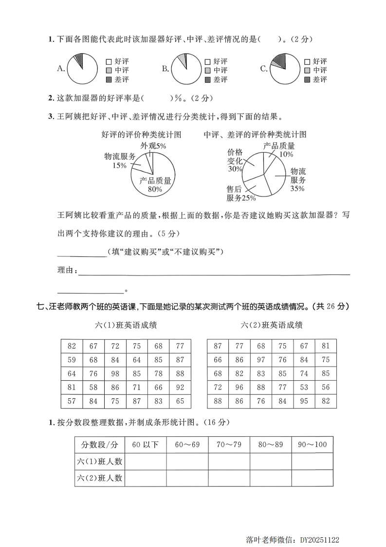 2025北师大版六年级数学上册单元测试卷第五单元测试卷(时间:90分钟分数:100分十10分)一、填空。(每空1分,共20分)1.西河村种着不同品种的水稻,为了反映某品种水稻的产量占所有水稻品种总产量的百分比,应选择()统计图;为了反映各品种水稻产量的具体数目,应选择()统计图,为了反映某品种水稻的产量这几年的变化情况,应选择()统计图。2.如图是阳光小学六年级学生视力情况统计图。视力假性(1)用整个圆表示(),用圆内各个扇形正常近视30%表示()占总人数的百分比。33%近视37%(2)()的人数最多,占六年级学生总数的()%(3)如果视力正常的人有90人,假性近视的有()人。3.绘制一幅条形统计图时,如果用2厘米长的直条表示80千克,那么5厘米长的直条就表示()千克。4.右图是六(1)班学生某次数学考试成绩的情况统计图。人数2420171643优良中不及格等级(1)不及格的有()人,及格率是()%(2)良以上(包括良)的有()人,占全班总人数的()%。(3)考试成绩为优的比良的多占全班总人数的()%。5.在一个扇形统计图中,表示乳脂成分含量的扇形的圆心角是108°,则乳脂成分的含量占这种奶粉总成分含量的()%。6.右图是某水果店香蕉,西瓜,苹果的销售情况统计图,三种水果香蕉共售出1200kg,苹果的销量占总销量的()%,售出苹果30%)kg,西瓜的销量是苹果的()%西瓜45%落叶老师微信:DY20251122