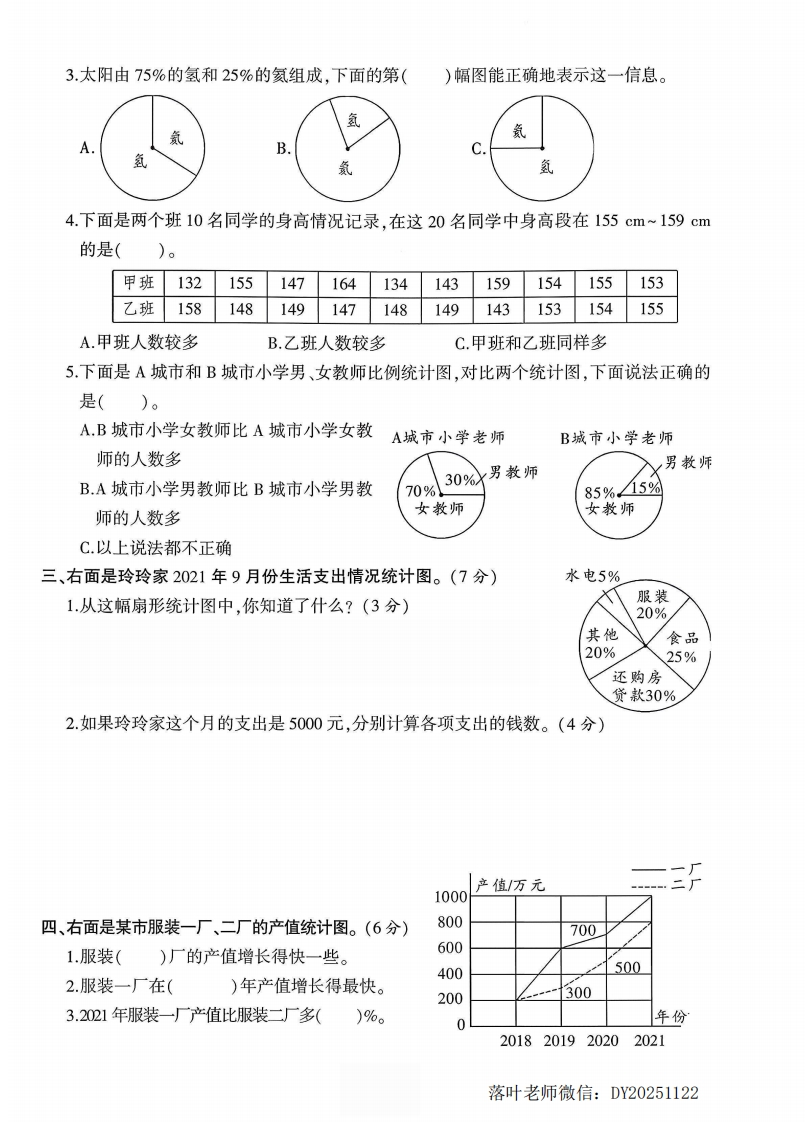 2025北师大版六年级数学上册单元测试卷第五单元测试卷检测时间:90分钟满分:100分+10分题序三四五六七附加题总分得分一、填空题。(每空1分,共15分)》弥1.常用的统计图有()统计图,()统计图,()统计图。2.扇形统计图是用一个圆表示(),用圆内的各个()的大小来表示(封)占()的()。製3.某班同学在收集废品的活动中,收集的45%是玻璃瓶,30%是易拉罐,25%是废塑料瓶。选择()统计图就能表示出各种废品所占的百分比情况。线4.某人9月23日生病发烧,人院后医生对其体温测量记录如下:时间6时8时10时12时14时内体温39°39.538°37°37.5°选择()统计图就能清楚地突出病人体温的变化情况。不5.某校六年级老师对学生最喜欢的电视栏目统计如下:栏目名称综艺电视剧动画片新闻联播要人数/人961215630选择()统计图就能表示各类电视节目人数的多少。答6.我国陆地地形分布情况如图。(1)整个圆表示(),我国盆地占总盆地荞题面积的()%。12.0%平原26.0%高原(2)从统计图中可以看出,()的面积最大,山地)的面积最小。33.3%(丘陵9.9%二、选择题。(10分)1.能清楚地看出各部分与总体之间的百分比关系的是(A.条形统计图B.扇形统计图C.折线统计图☒2.老师对全班同学近五次考试的平均成绩进行比较,如果想了解成绩的变化情况,选择()统计图比较合理。侣A.条形B.折线C.扇形落叶老师微信:DY20251122