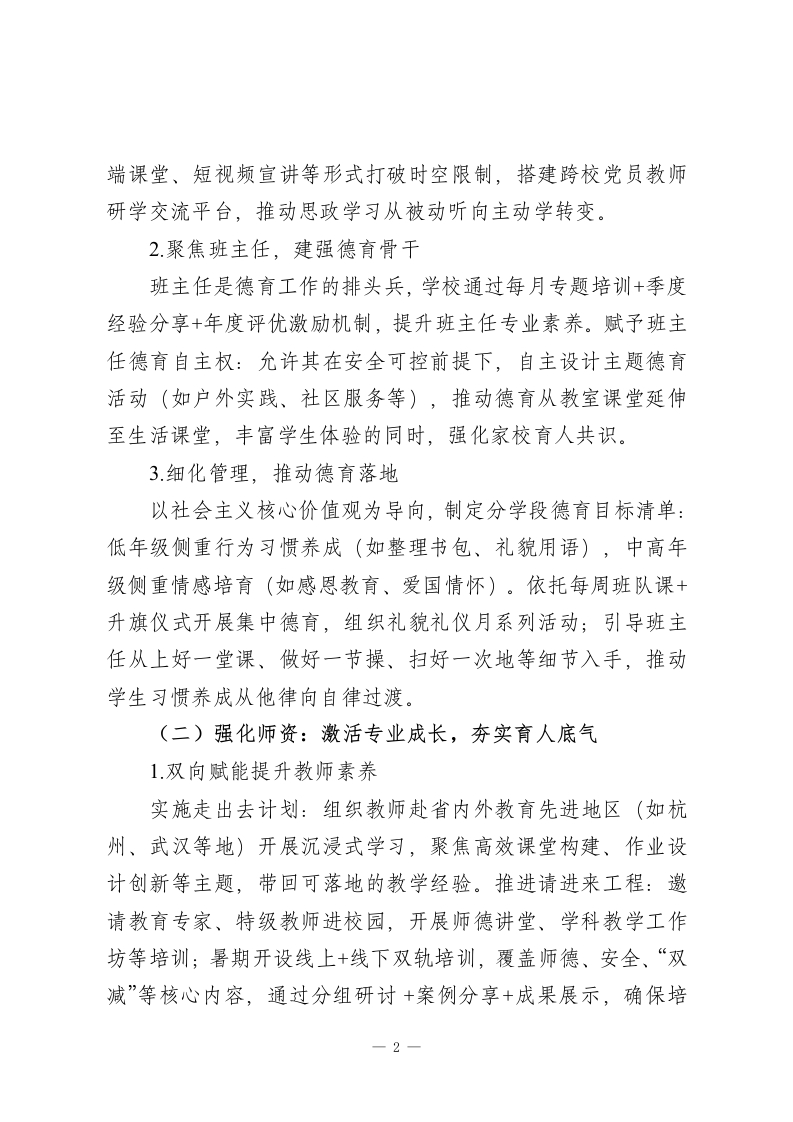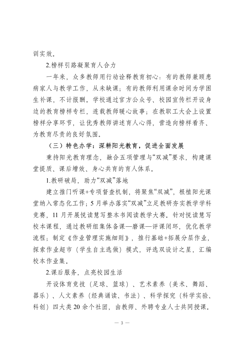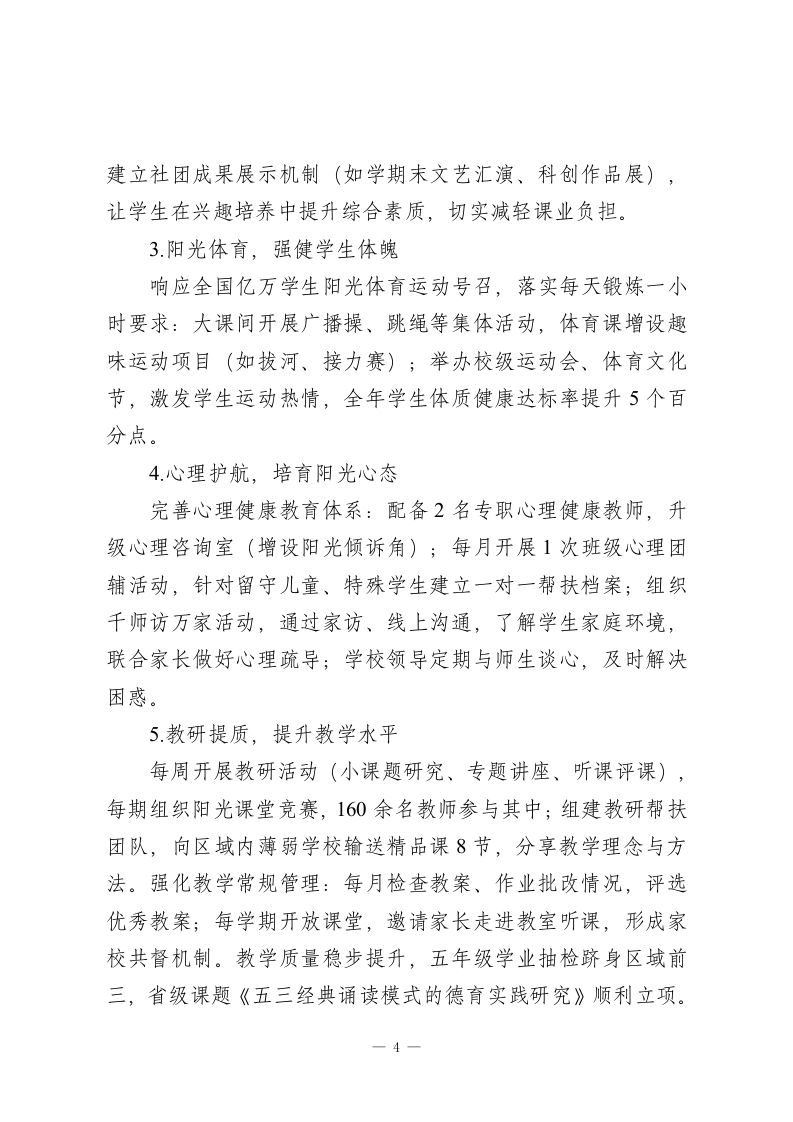 2025年度校长述职报告:做有思想的校长,办有文化的学校尊敬的各位领导、各位老师:大家好!时光镌刻奋斗足迹,2025年在全体师生的共同耕耘中落下帷幕。一年来,在上级教育主管部门的引领下,在全体教师的悉心指导下,全校师生以守正创新为行动纲领,凝心聚力推进各项工作。我们始终把安全教育抓在日常、把教学质量落在实处,全面践行五育并举育人理念,实现全年零安全事故,工作成效获得上级肯定、家长认可与社会好评。在此,我谨向给予工作指导的上级领导、全力支持的师生及家长,致以最诚挚的感谢!下面,我就2025年度个人及学校工作情况汇报如下,恳请各位批评指正。一、年度工作要点(一)立德树人:锚定教育根本,筑牢育人根基1.党建领航,精准赋能德育学校以党组织为核心,构建党建+德育融合机制:一方面优化党建活动的频次安排、辐射范围及线上线下载体,开发党员教师示范课、红色教育专题课等特色党建课程,通过五个一(带头结对帮扶、带头参与家访等)举措树立典型,营造比学赶超的党建氛围;另一方面创新思政学习模式,依托社群打卡、云