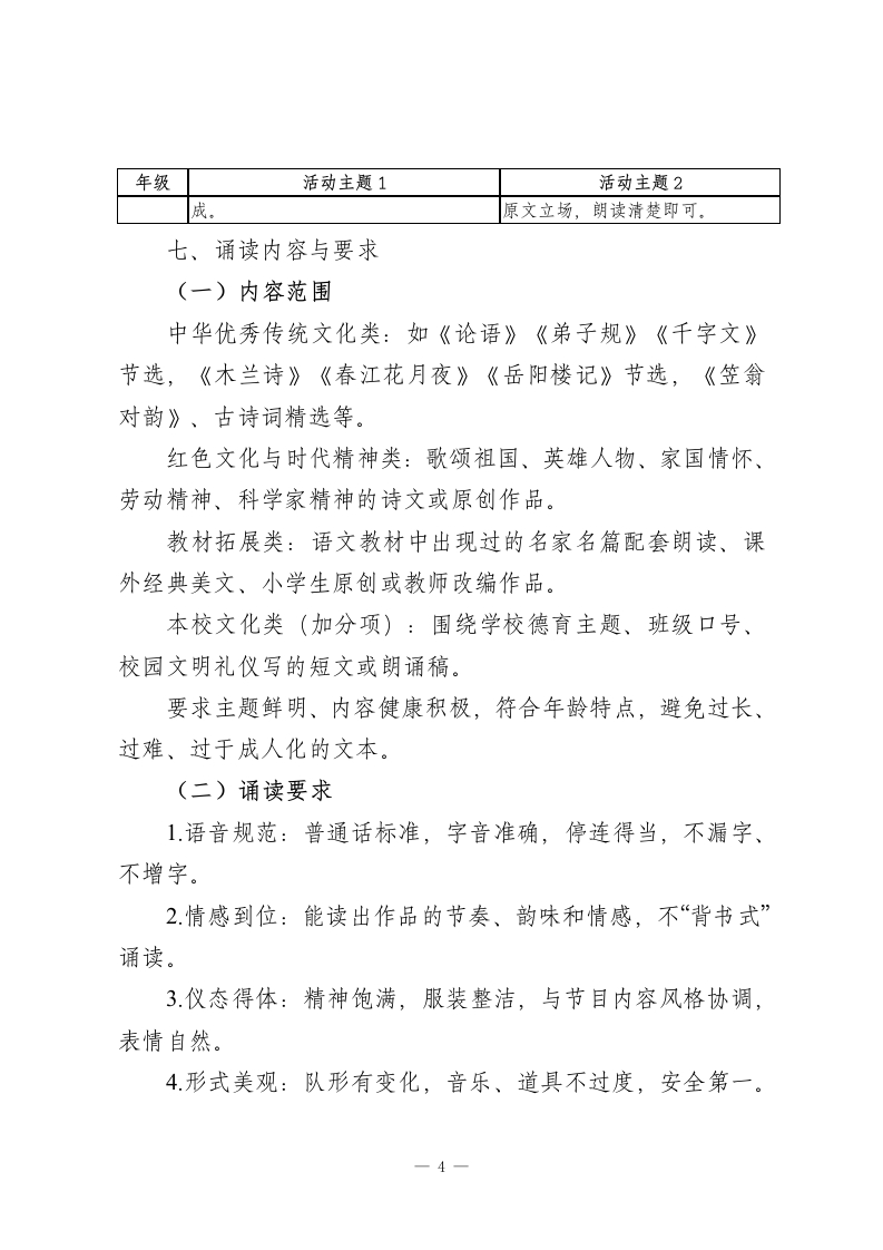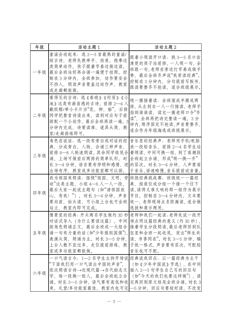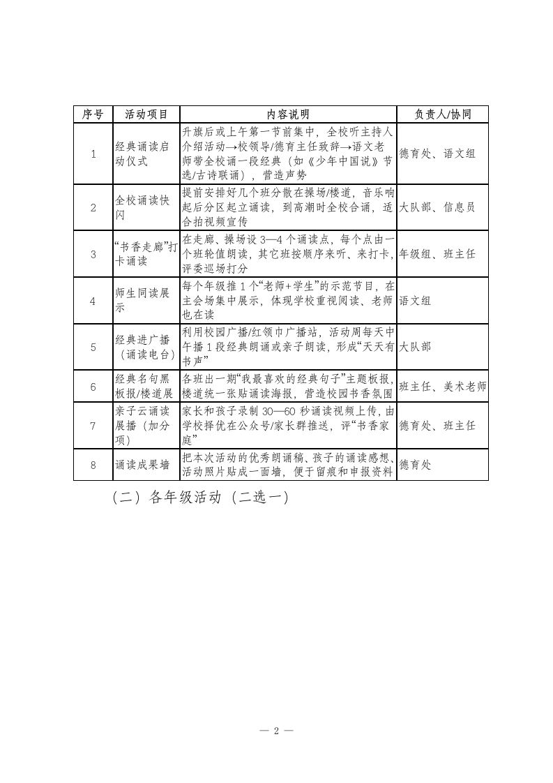 2025年经典诵读比赛活动方案一声入人心,经典向新一、活动背景为让经典真正“走进课堂、走进孩子、走进家庭”,营造人人会读、班班有声的书香校园氛围,进一步提升学生的语言文字素养和审美表达能力,培养学生的文化自信和民族自豪感,学校决定开展“声入人心,经典向新”经典诵读展示活动。通过这次活动,引导学生:会读一正确、规范、富有感情地朗诵经典;爱读一在诵读中感知中华优秀传统文化的美;乐读—在表演、配乐、情境中体会读书的快乐;常读一把“天天有书声、人人能开口”变成班级常态。二、活动主题声入人心,经典向新三、活动时间2025年11月21日(周一)下午第1一2节四、活动地点学校操场(或报告厅、多功能室,根据天气和设备调整)五、参加对象全体学生,以班级为单位参加;语文教师、班主任全程参与,可安排年级组长、家长代表观摩。六、活动形式(一)全校性活动形式一览表一1