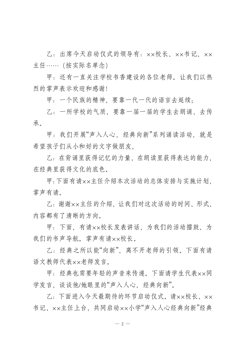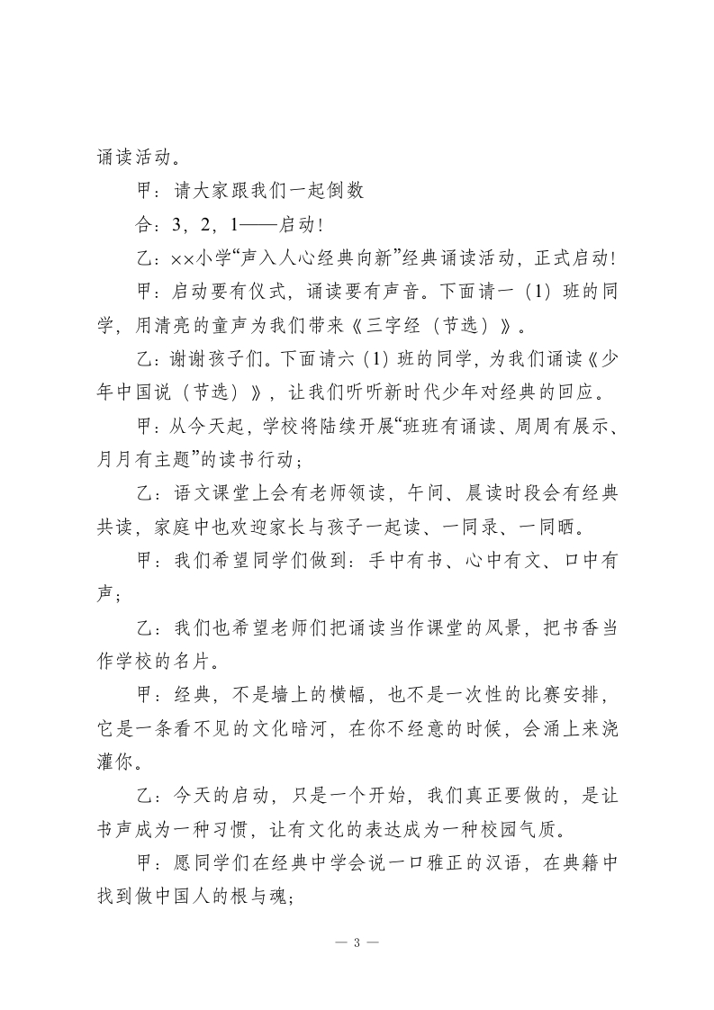 2025年经典诵读启动仪式一声入人心,经典向新甲:声可以抵达耳畔,乙:也可以抵达人心。甲:经典可以铭刻岁月,乙:也可以焕然一新。甲:尊敬的各位领导、各位老师,乙:亲爱的同学们合:大家好!甲:今天,我们在这里举行××小学经典诵读活动启动仪式,主题是合:“声入人心,经典向新”。乙:这八个字,说的是两件事:一是“声入人心”我们要把汉语说得清澈、说得有分寸、说得有温度,让每一次朗诵都落到心上;甲:二是“经典向新”经典并不陈旧,它可以和今天的课堂、今天的校园、今天的孩子重新发生联系,在新的时代焕出新的光。乙:中华文字,源远脉长;甲:读书之声,历久弥新。乙:今天这场仪式,是我们向经典的致敬,甲:也是我们向未来的一次庄重发声。-1