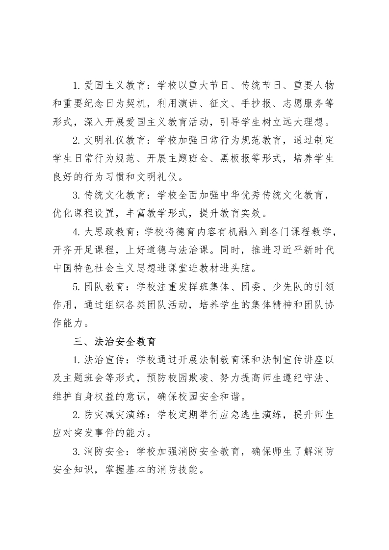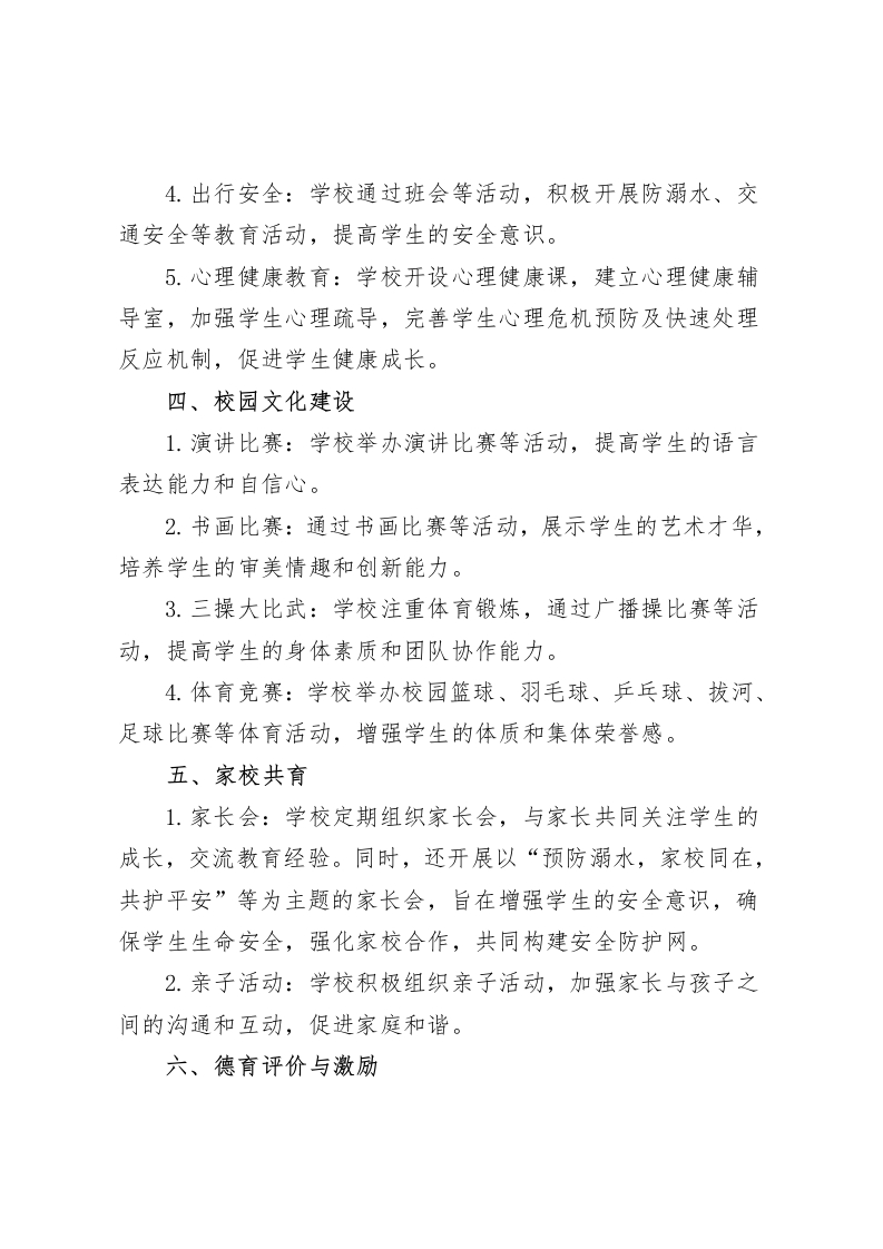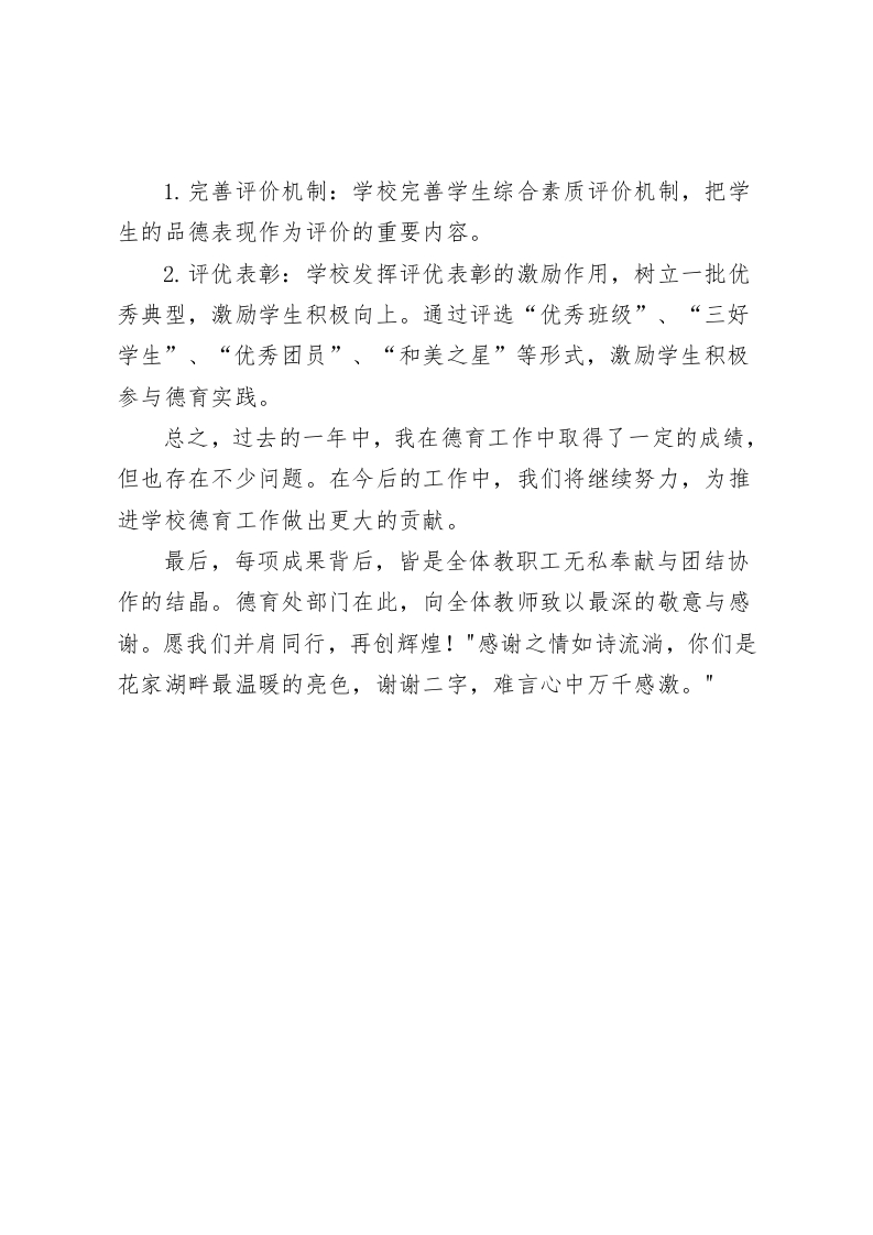 2025年学校德育工作总结过去一年,在上级领导的关心支持下,在全体教职工的共同努力下,我校的德育工作取得了显著成果。现就本年度德育工作进行总结:一、德育队伍建设1.健全领导小组:学校建立了健全的德育领导小组,明确了工作职责,制定相应的措施。2.班主任队伍建设:班主任是学校德育工作的主力军,学校通过定期召开班主任工作例会,加强理论学习,总结班级管理经验,不断提高班主任的业务素质和管理水平。同时,对班主任日常工作的考评也更具体有效,起到了表彰先进、激励大家的作用。3.学生自管会:学校充分发挥班集体、团委、少先队的作用,进一步建立和完善了学生自我教育、自我管理、自我评估的机制。4.师德师风:学校持续开展师德教育活动,组织教师学习《教师职业道德规范》,并开展“办人民满意的教育,做家长和学生满意的教师”主题教育活动。师德考核方面,学校成立了专门的考核小组,从依法治教、团结协作、爱岗敬业、严谨治学、热爱学生、尊重家长、廉洁从教、为人师表四个方面对教师进行考核,确保教师队伍的高素质和良好师德。二、思想品德教育