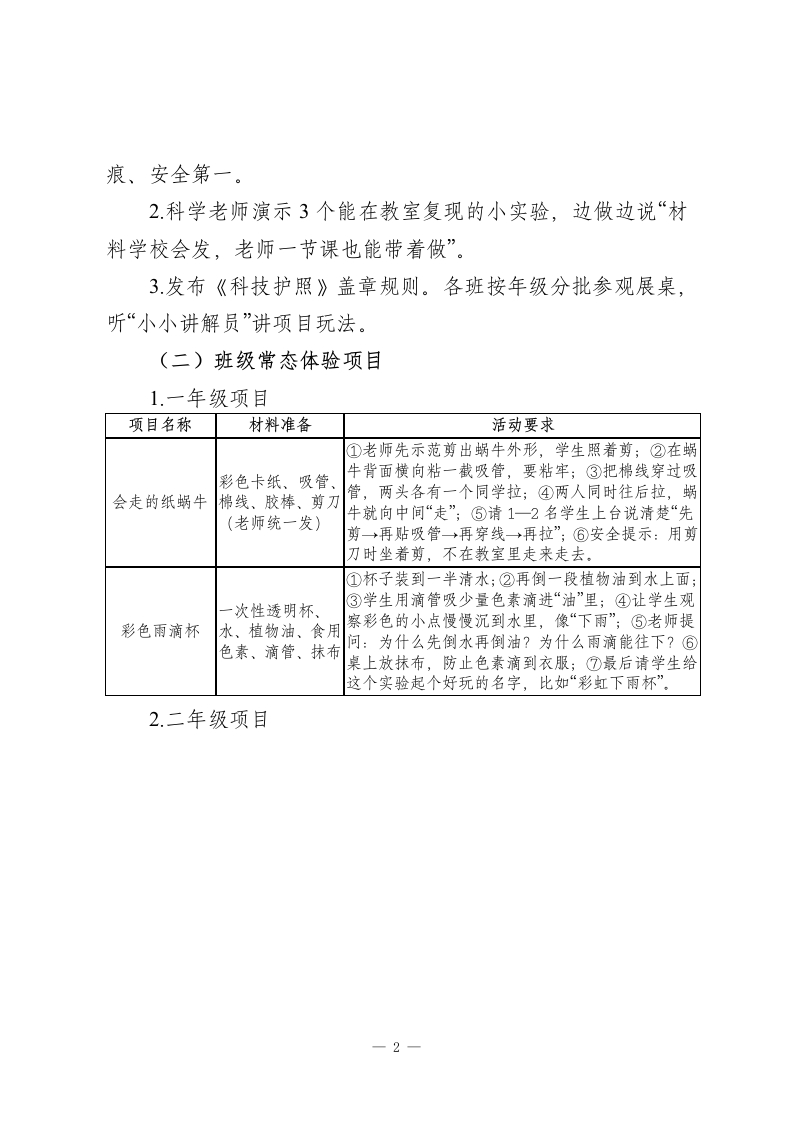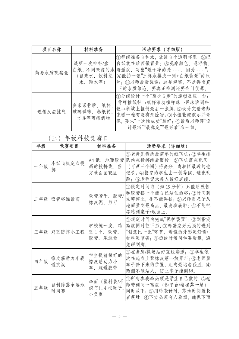 2025年学校科技节活动方案一用童心丈量科技的温度一、活动背景科技节,就是要给孩子这样一个集中、热闹、可操作的平台。学校一直坚持“做中学、玩中学、探中悟”的科学教育路径,科学课、信息技术课、综合实践课和少先队活动课都有各自的亮点,但日常课堂分散,学生感受不到“科学是一整片的”。本学期举办科技节,就是要把这些分散的科学活动集中呈现,把年级项目做成“可复制脚本”,让每个班、每个孩子都能真正参与进来,有作品、有记录、有展示。二、活动主题用童心丈量科技的温度三、活动时间集中开幕:2025年11月10日(周一)班级常态体验:11月10日一11月21日(各班按课表安排)年级科技竞赛日:11月中上旬由各年级组统筹排定成果整理与展示:11月下旬四、活动内容(一)开幕活动(校级)时间:2025年11月3日(周一)上午第1一2节地点:操场+科技展廊流程简要:1校长讲话:讲“科技节三句话”一人人能参加、过程要留一1