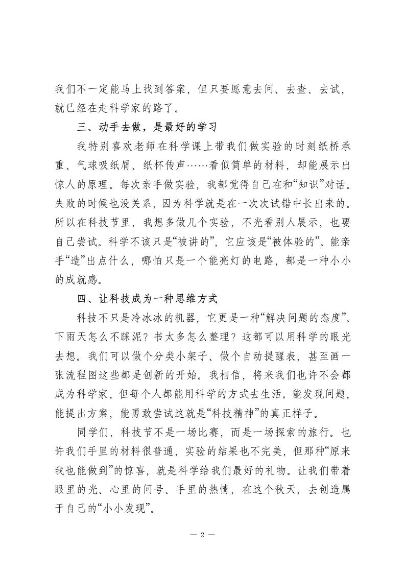 2025年学校科技节学生讲话稿一用童心丈量科技的温度尊敬的老师们、亲爱的同学们:大家好!我是×年级×班的×××。今天,能作为学生代表站在这里,我心里特别激动。因为这个季节,不仅有清爽的秋风,还有一场关于“发现、创造、改变”的盛宴我们的科技节。一、科技让生活更聪明如果说过去的生活靠双手和力气,那么现在的生活,更多靠智慧和技术。每天早上,我爸妈不用掐点出门,因为手机上能看见地铁的实时到站;奶奶不会打字,也能用语音和我视频聊天;我家那台扫地机器人每天自己规划路线,比我扫得还干净。这些小小的变化,说明科技并不遥远它就藏在我们的生活细节里,让世界更高效,也更温柔。以前我以为“科技”就是科学家在实验室里发明火箭、造机器人;现在我知道,科技其实就是我们身边的“更聪明的办法”二、发现问题,也是科学的开始我记得有一次,我用吸管喝果汁,吸得太猛,果汁喷出来了;那天老师刚好讲“空气有压力”,我忽然明白了那是怎么回事。从那以后,我习惯了“多看一眼、多想一下”:为什么电梯能一层层停得那么准?为什么水壶烧开后会自动断电?为什么手机能识别人脸?其实,科学离我们只有一个“为什么”的距离。每一次好奇,每一次想搞清楚的冲动,都是通向科学的第一步。1