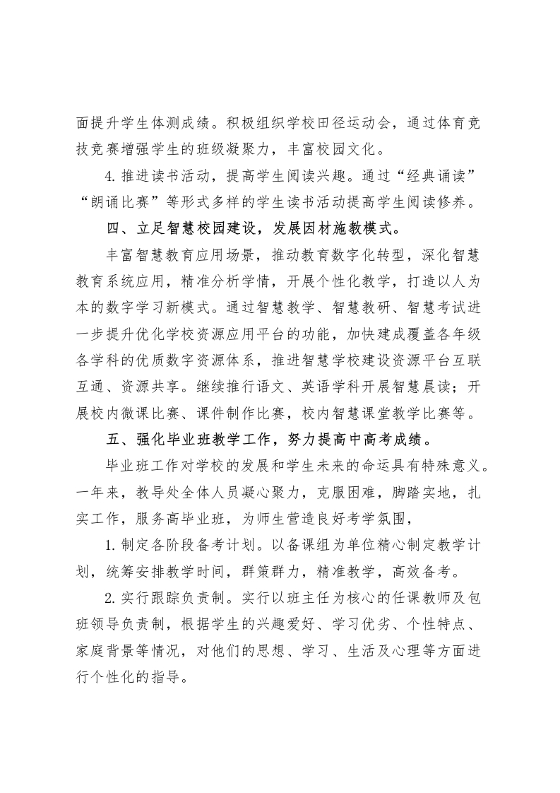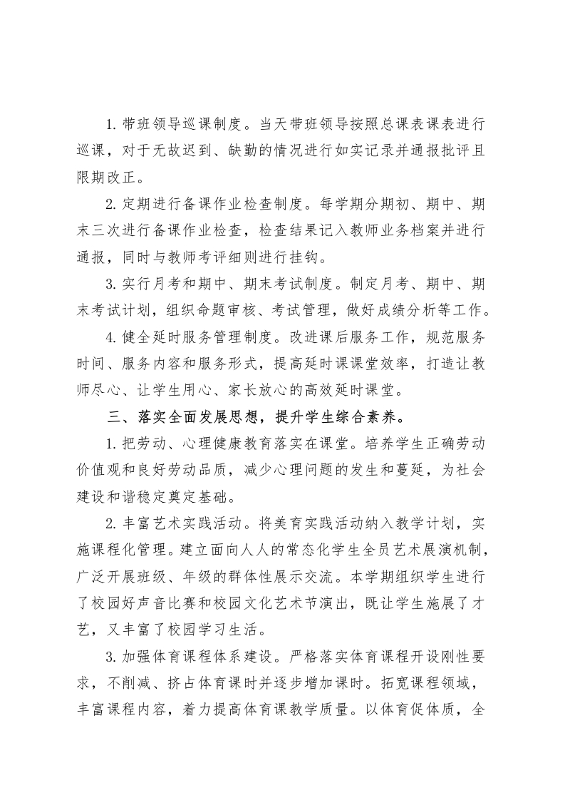 2025秋季学期初中教导处工作总结过去一年,在校长的正确领导下,教务处全体工作人员紧紧围绕立德树人中心任务,与各处室、各年级密切配合,积极组织实施学年度工作计划,大力推进课堂教学改革,克服困难,扎实工作,不断创新。坚持以服务教学为中心,以提高教育教学质量为主线,以加强内部管理、提高工作效率为重点,加强教学常规管理,增强服务意识,提升管理能力,顺利实现了各项目标。一、落实课程计划,抓实教学常规管理。1.要求每位教师认真做好所任学科的教学计划,按科目备课,按课表上课,确保教学任务,每位教师认真备课,上课,在不增加学生负担的同时,适当合理布置作业并认真批改,对学有困难的学生坚持耐心辅导,学校严禁教师组织学生购买其它辅导资料。学校在抓好教学工作的同时,认真抓好教研工作。2.开学时,学校制定了教研活动工作计划,并认真执行。坚持教师按计划进行集体备课及教研活动,教师从而达到互相学习,共同提高的目的。坚持教师考勤制度,坚持教师坐班制度、签到上下班制度,按时作息,坚持请假、批假制度,做到不随意请假,不随意调课。二、加强教学常规管理,以制度促提升。