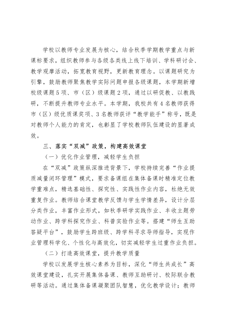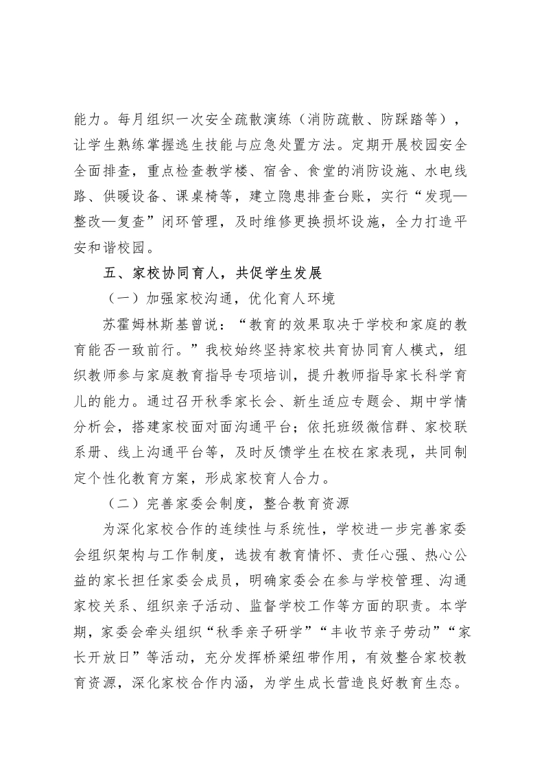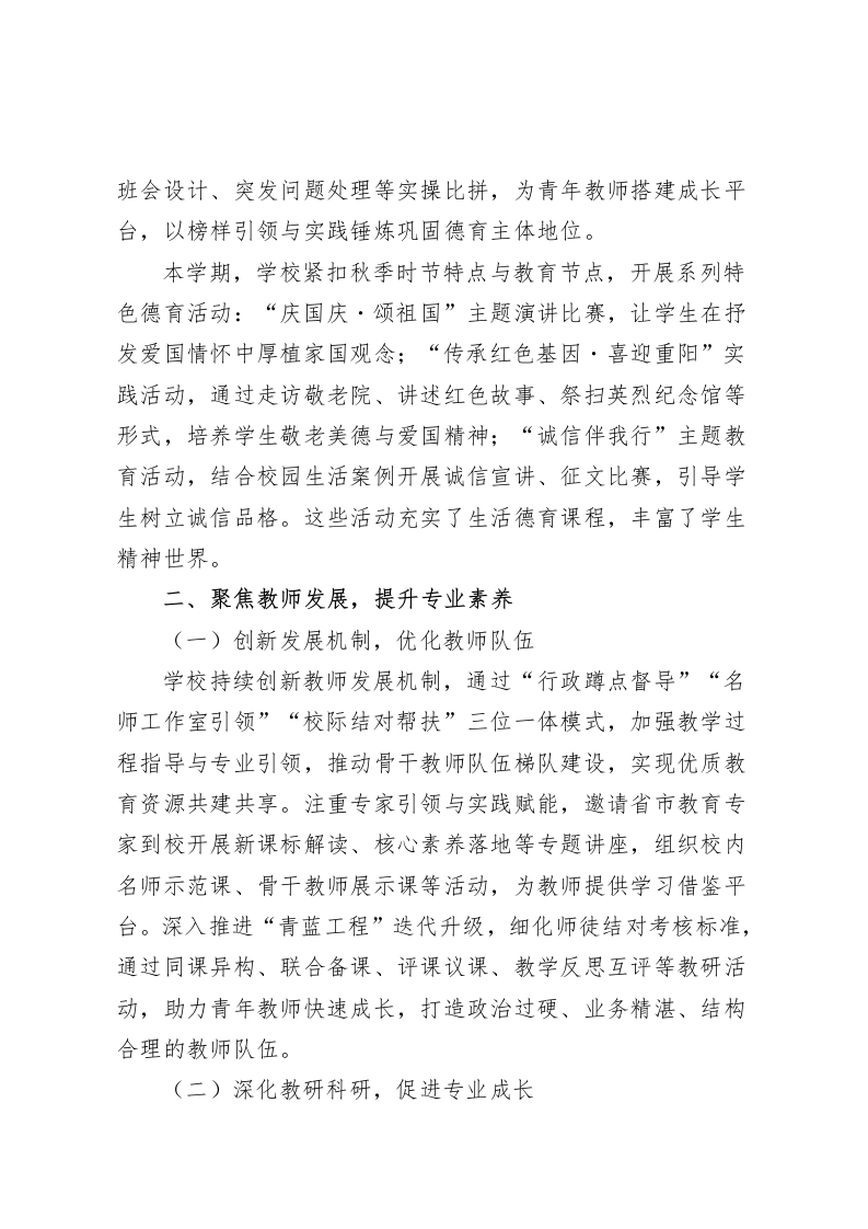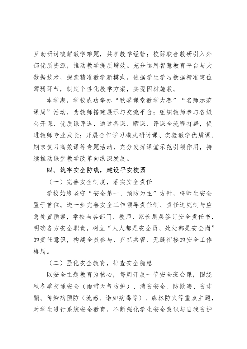 2025秋季学期学校整体工作总结时光荏苒,2025年秋季学期已顺利收官。在这一学期里,我校始终坚守教育初心,以立德树人为根本任务,以培养学生全面发展为目标,全体师生携手共进,在德育建设、教学改革、安全保障等方面开展了一系列扎实有效的工作,推动学校各项事业实现新提升。现将本学期整体工作情况总结如下:一、以德育人,筑牢学生成长根基(一)强化常规德育,规范行为养成学校将德育工作放在首位,以常规教育为抓手,持续深化学生养成教育。通过修订完善《学生行为规范细则》,从课堂礼仪、校园秩序、仪容仪表、志愿服务等方面对学生进行全方位引导。强化学生自主管理效能,优化学生自主管理委员会运行机制,让学生深度参与校园文明监督、环境卫生维护、活动组织协调等工作,助力良好行为习惯的固化。充分发挥评价激励作用,通过每周班级量化考核、月度“文明班级”“美德少年”评选等方式,激发学生集体荣誉感,提升自主管理与自我约束能力。(二)打造德育队伍,丰富德育活动为夯实德育队伍建设,学校开展“班主任经验分享会”“德育工作研讨会”等活动,邀请骨干班主任分享班级管理妙招与育人典型案例;组织青年班主任“技能比武”活动,通过主题