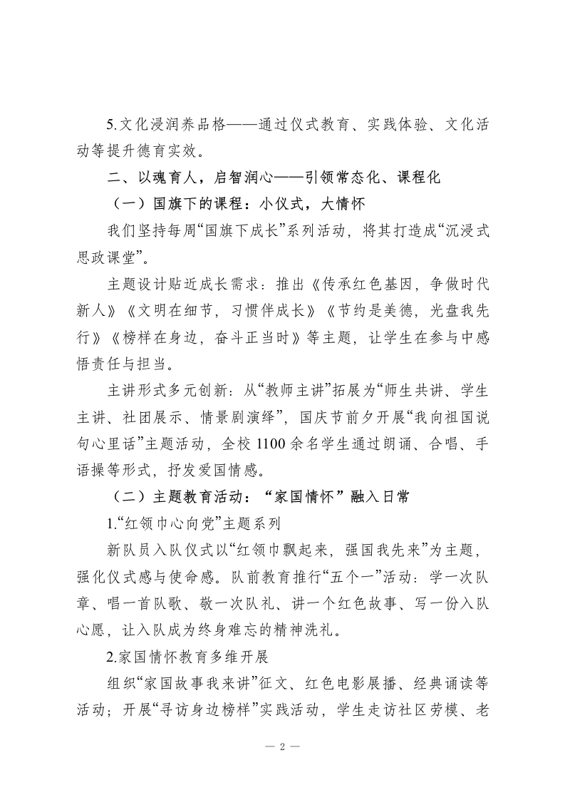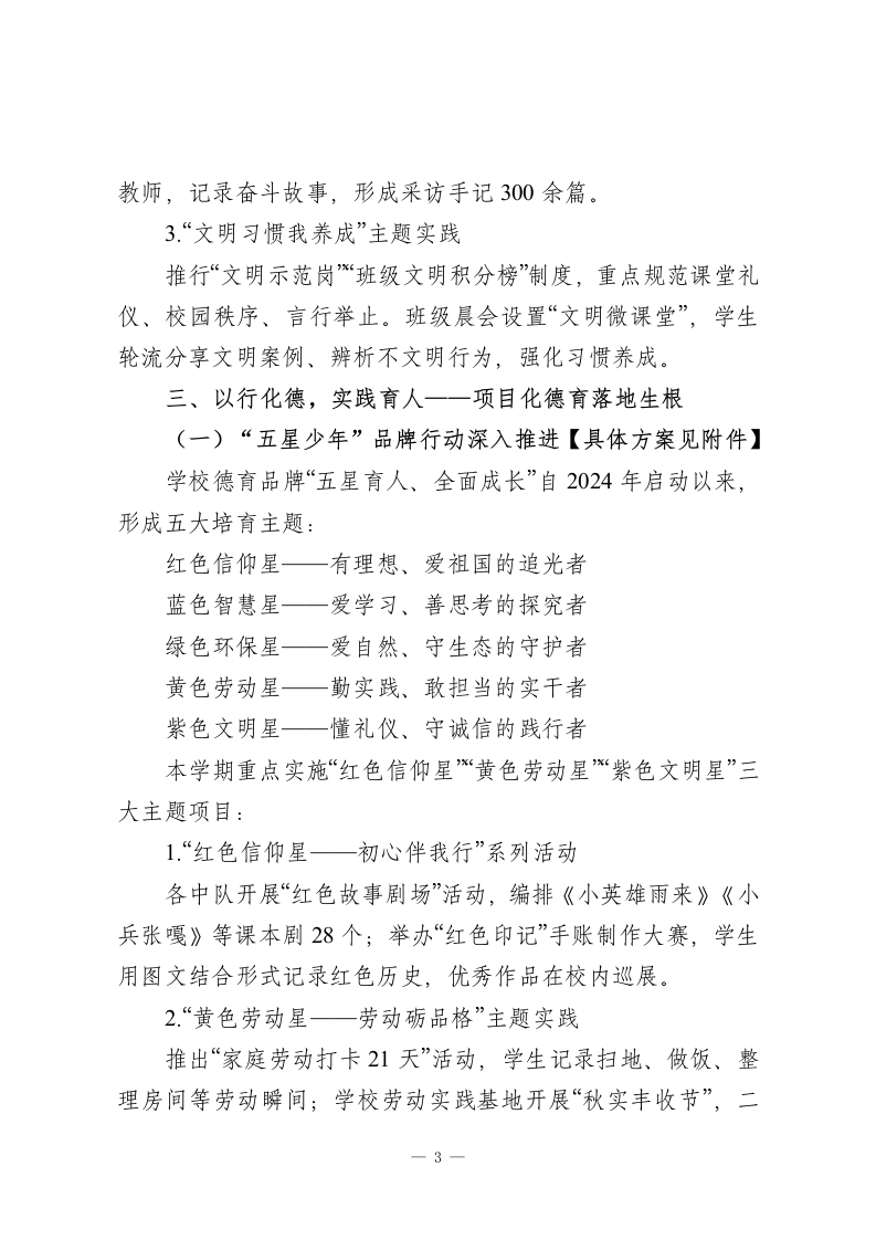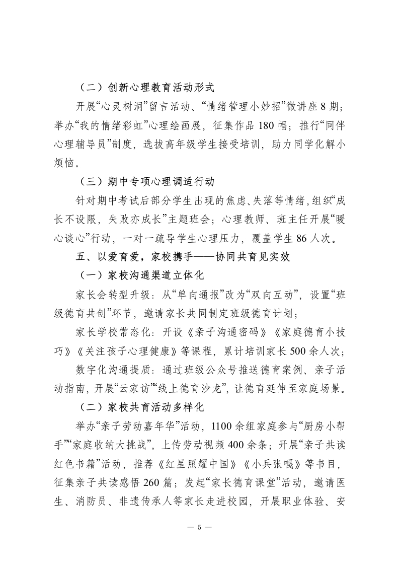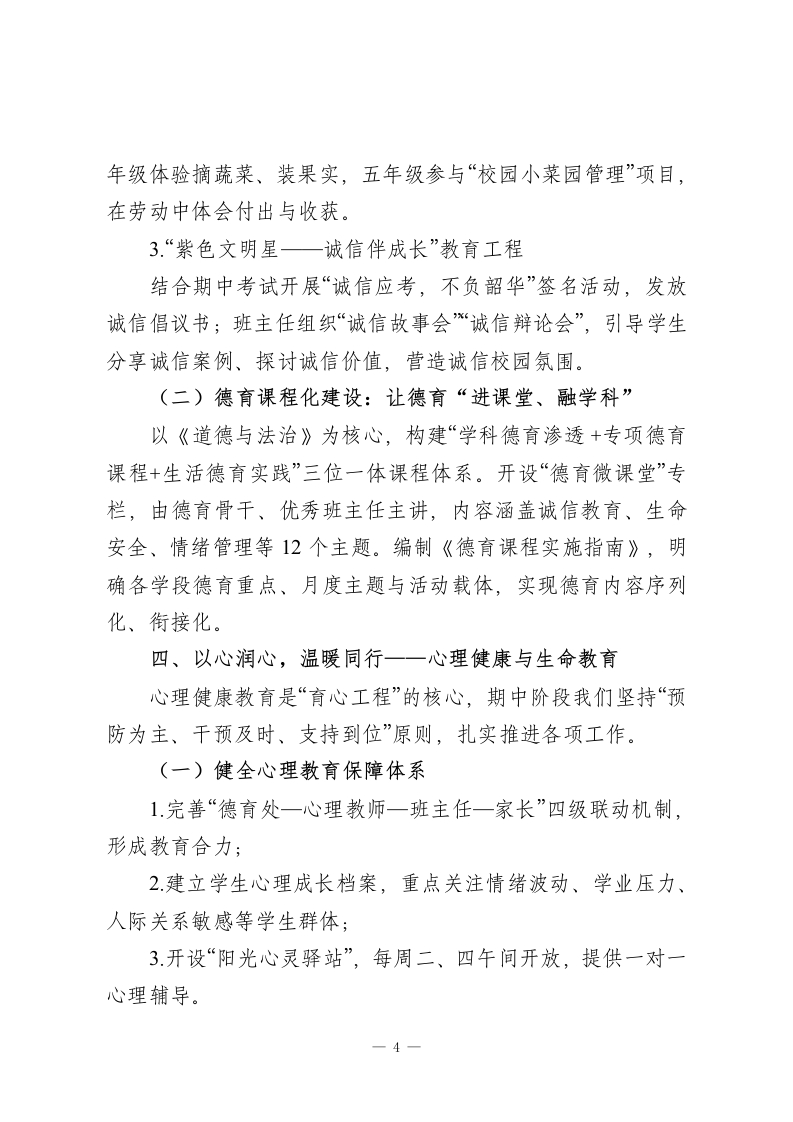 2025秋季学期中期德育工作汇报:培根铸魂育新人,家校协同启新程学校教育,是点亮心灵的火种;德育,是滋养成长的沃土。2025年秋季学期是学校“德育提质、品牌深耕”三年发展规划的攻坚之年。我们始终坚守立德树人根本任务,以“培根铸魂、启智润心”为核心理念,从日常抓起、从细节落脚,用陪伴守护成长、用文化浸润品格,让德育之光照亮校园每个角落、每个活动、每个生命。围绕“五星育人、全面成长”德育品牌建设,深入推进课程化德育、实践化德育、生活化德育,构建全员参与、全程渗透、全域覆盖的育人新格局。一、以德为基,坚守初心一一整体工作思路与目标本学期德育工作的总体目标是:让每一位学生在有情怀的校园生活中“学会感恩、学会自律、学会合作、学会创新”,让每一位教师成为学生成长的“点灯人”,让德育在实践中显内涵、创特色、树品牌。为此,我们立足“五育融合”格局,重点聚焦五大方向:1.思想铸魂强信念一深化理想信念教育,厚植家国情怀;2品牌育人创特色一以“五星少年”培育计划为载体,推进德育实践化;3队伍赋能保落实一班主任、德育导师、家长志愿者“三支力量”协同发力;4家校社协同提质一构建三位一体育人生态圈;一1