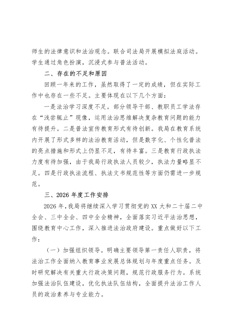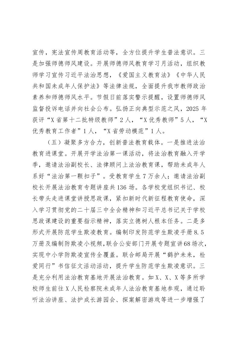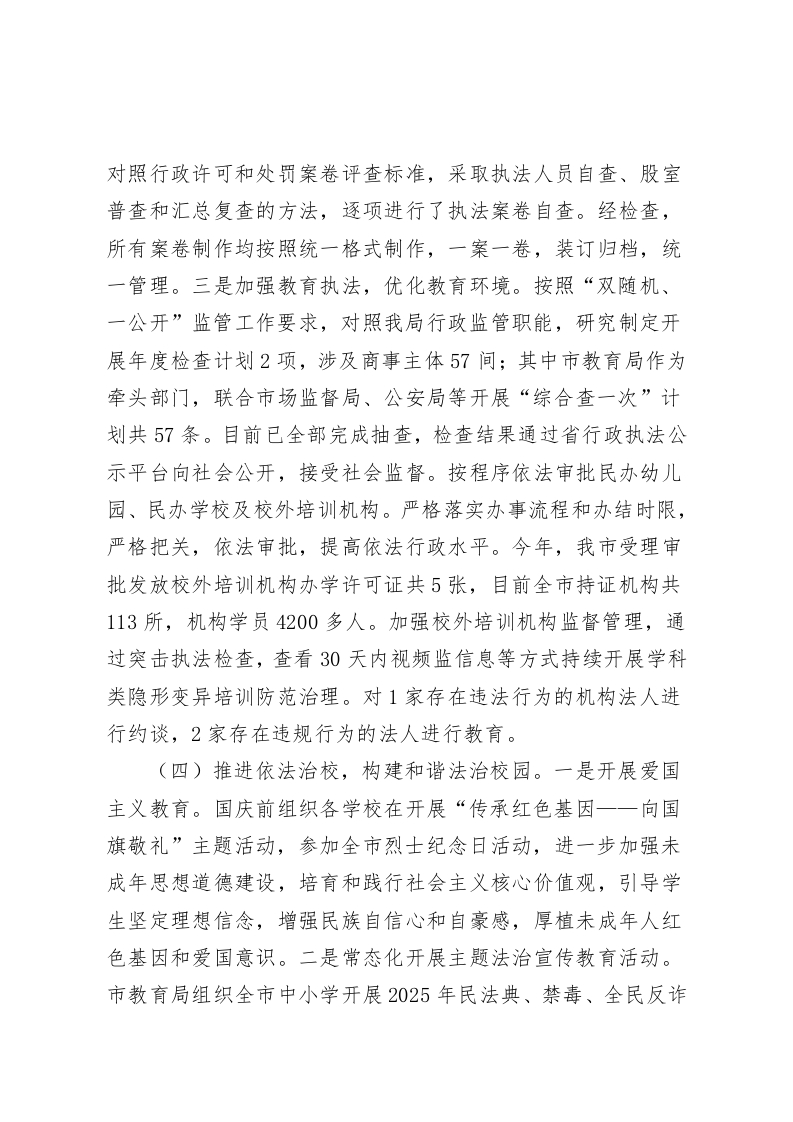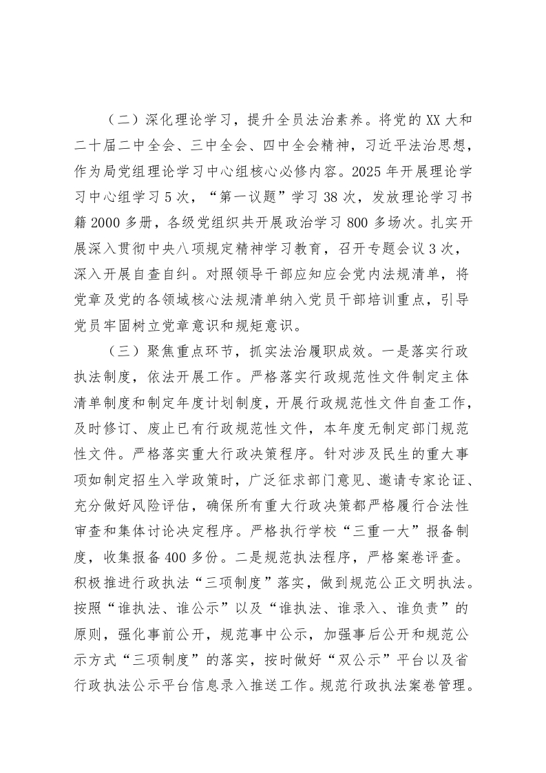 X市教育局关于2025年度法治政府建设情况的报告2025年,X市教育局始终坚持以习近平新时代中国特色社会主义思想为指导,深入学习贯彻党的XX大和二十届二中全会、三中全会、四中全会精神,习近平法治思想,全面贯彻落实《法治政府建设实施纲要(2021一2025)》精神,将法治建设与教育事业高质量发展深度融合,为全市教育高质量发展筑牢法治根基。现就2025年我局法治政府建设工作报告如下:一、主要工作及成效(一)强化组织引领,筑牢法治建设根基。一是坚持党政主要负责人履行法治建设第一责任人职责。对法治建设重要工作亲自部署、重大问题亲自过问、重点环节亲自协调、重要任务亲自督办。加强法治建设工作统筹,明确工作职责,压实工作责任,定期研究部署、推动解决法治建设工作中遇到的重点问题。领导班子和领导干部在年终述职报告中将法治学习情况、依法履职情况等纳入报告,将法治建设与教育教学工作同部署、同推进、同考核。二是持续加强队伍建设。加强行政执法队伍建设。教育局现共有10名行政执法人员,全部持证上岗。2025年共有5位机关人员报名参加行政执法证考试,将进一步充实执法工作队伍。配齐配强校园专业法治力量,全市68所学校均聘请公安法治副校长,其中15所初高中学校还聘请检察官担任法治副校长,实现初高中学校双法治副校长,保障学校依法决策、依法治校。