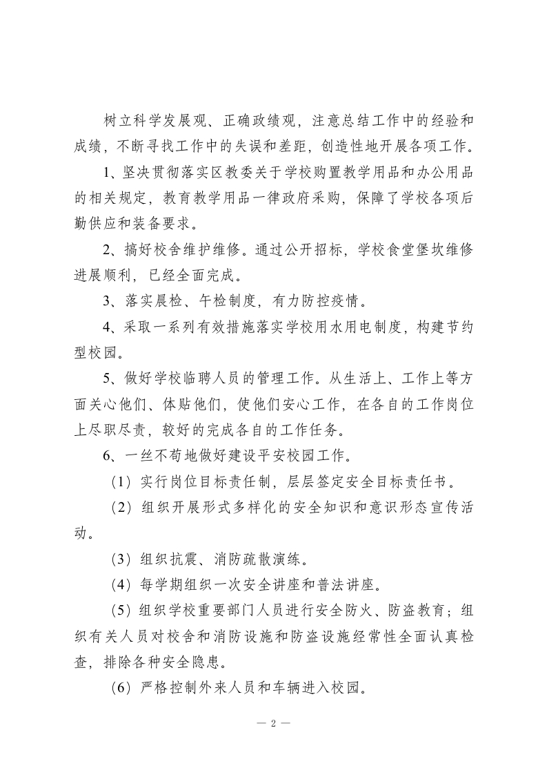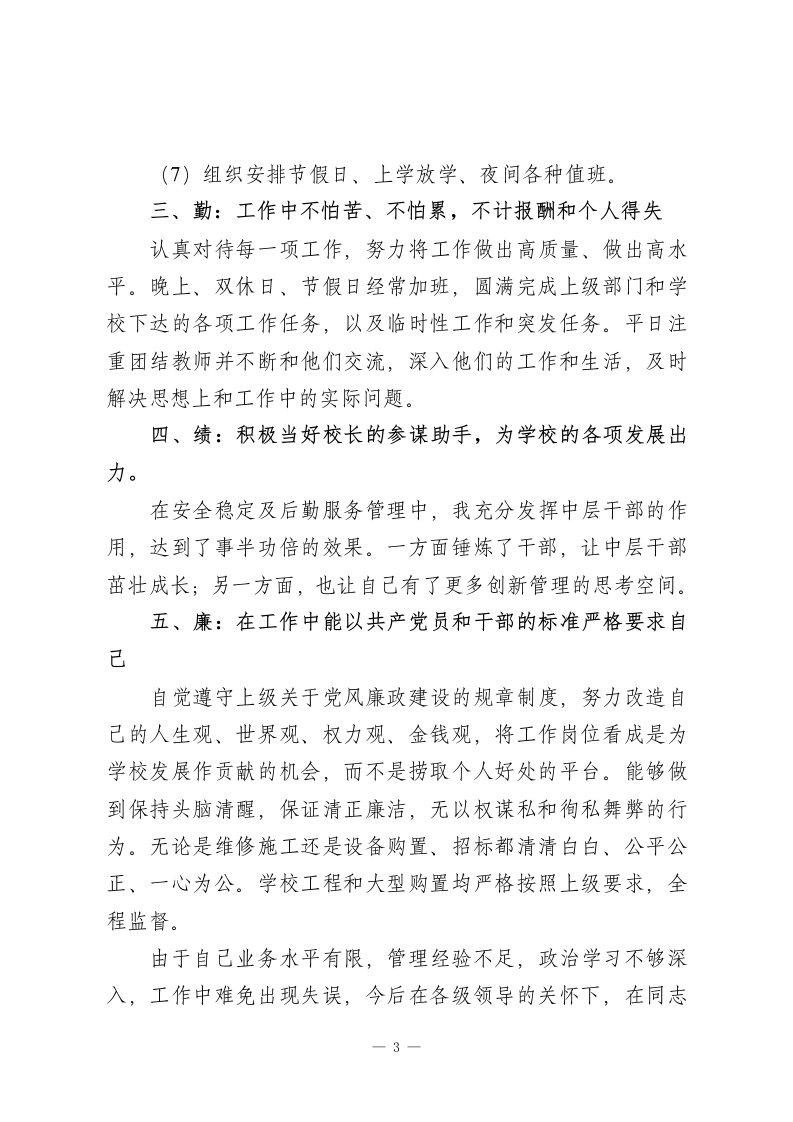 分管后勤、安全副校长个人总结,从德能勤绩廉做汇报尊敬的领导,各位同仁:大家好!20xx年,我担任XX学校副校长,分管学校后勤管理和学校安全工作。在学校党支部的正确领导下,坚持全心全意为教学和师生服务的宗旨,服务于学校的改革和发展,勤奋、扎实、细致的工作,使各项工作有条不紊的顺利进行,圆满完成了教学办公物品供应、设备购置、卫生防疫、学校环境综合治理、校舍维修、建设平安校园等各项任务。现将思想、工作情况汇报如下:一、德:注重学习,不断提高理论素养和工作能力本年度积极参加学校组织的各种政治学习和政治活动,深入学习实践科学发展观,模范履行党章规定的义务,努力做到“五带头”。在思想上始终和党中央保持一致,工作中严格按照党员标准去要求自己,时时处处充分发挥党员的先锋模范作用;工作中注意以身作则、团结同志、胸襟开阔、诚恳待人、公平公正、实事求是。家庭中发挥顶梁柱作用,做一个好儿子、好父亲、好女婿,对待双方老人和晚辈都尽职尽责。在社会生活中,注重自己教师和党员的形象,积极参加公益活动,热心为邻居社区服务。二、能:扎实勤奋,认真完成各项工作一1