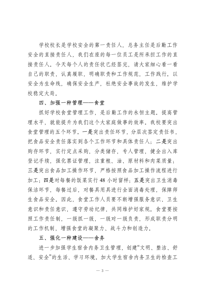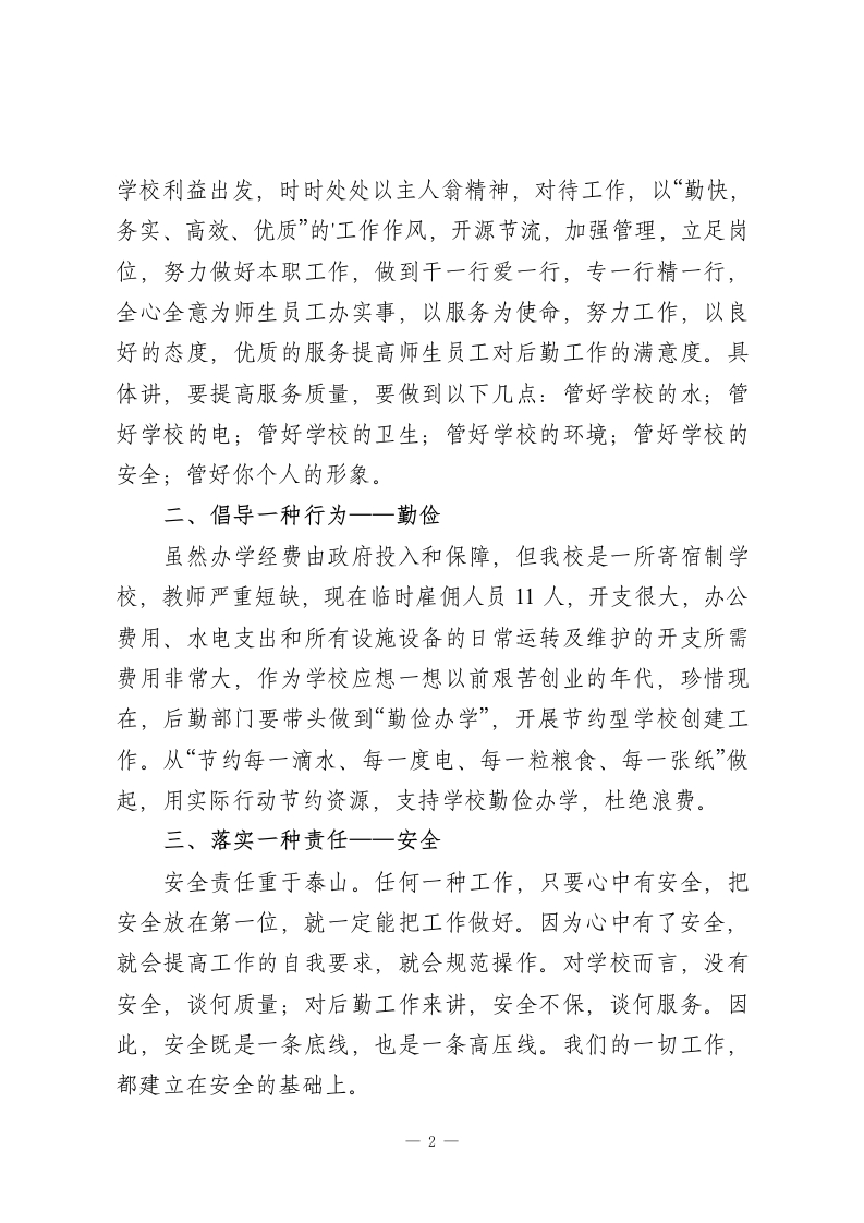 分管后勤副校长讲话希望大家尽职尽责,绷紧安全弦,严把质量关,为学校正常运行提供坚实可靠的后勤保障各位老师:大家下午好!今天我校召开全校后勤工作会议,目的是为落实后勤工作责任制,进一步加强后勤工作,提高学校后勤管理水平和服务质量。本学期开学这两个多月来,我校全面贯彻执行“教书育人,管理育人,服务育人”方针,坚持“后勤”为教育教学服务,为师生生活服务的方向,强化后勤内部各环节的管理,发扬“勤快、务实、高效、优质”的工作作风,努力提高自身素质,不断增强服务意识,提高服务质量和服务水平,通力合作,克服困难,锐意改革,使后勤服务工作取得了一定的成果。在此,我代表学校对一直以来辛勤工作、无私奉献在学校后勤系统的教职工表示感谢,你们为学校的建设和发展付出了辛劳,做出了贡献。下面根据我校后勤管理工作提出以下几点意见:一、强化一种思想一一服务后勤工作的目标是“管理育人,服务育人”,主要职责是为学校教育教学服务,为师生生活服务,为师生创设一个良好的学习,生活环境,热情主动帮助师生解决困难,及时提供必需的教育教学方面的物质资料。为此,本学期我们后勤员工要从1