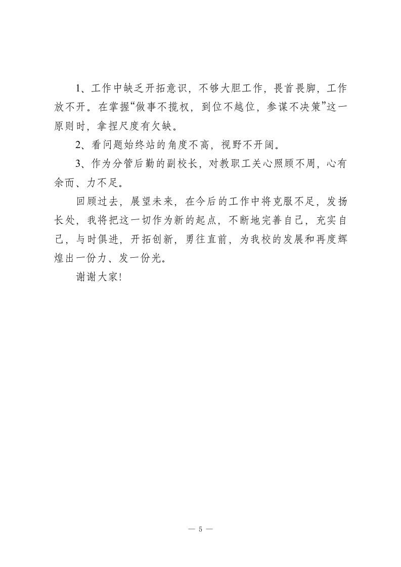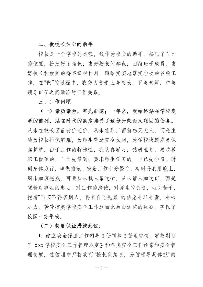 分管后勤副校长总结讲话今后的工作中将克服不足,发扬长处,我将把这一切作为新的起点,不断地完善自己,充实自己,与时俱进各位教职工:本学年度,我主要分管学校安全和后勤等工作。回首本年度的工作,繁杂而务实,忙碌而不失条理。“正直无私、廉洁奉公”是我的职业操守,“勤勉务实、脚踏实地”是我的工作作风,“开拓进取、求索创新”是我的不懈追求。在上级教育主管部门的领导下,有中心校领导的关心指导,校委班子的大力配合,更有广大教职工的热情关怀和帮助,在本职岗位上认真履行了自己的工作职责。下面就将我梳理、盘点和反思后的工作向各位领导、代表、老师们作一个简要的回顾和汇报:一、思想是人行动的指南在工作中,能坚持四项基本原则,全面贯彻执行党的教育方针,爱岗敬业,团结同志,联系群众,遵纪守法,廉洁自律,始终坚持以一个共产党员的标准严格要求自己,不断树立良好的个人形象。处处以身作则,恪尽职守,顾全大局,有较强的民主意识。坦率真诚,发现问题能及时地提出自己的意见和主张,不遮遮掩掩,不唯唯诺诺。始终坚持堂堂正正做人,坦坦荡荡做事,扎扎实实工作,兢兢业业履行职责。牢固树立为学生服务,为教师服务,为学校服务的思想。1