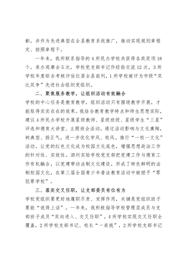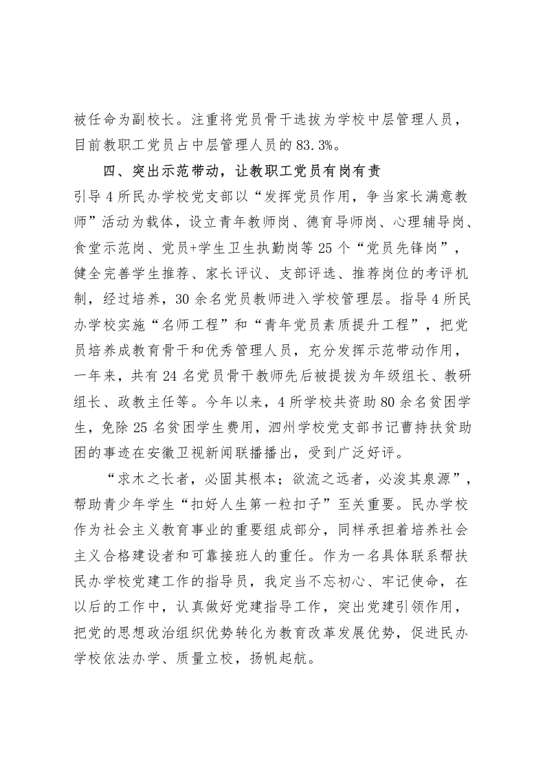 坚持党建引领助推民办学校教育事业扬帆远航一非公党建工作心得当被组织选派担任第五批非公党建工作指导员时,我感到非常荣幸,我负责联系指导灵童学校等4所民办学校的党建工作。在这里,将我一年来的非公党建工作情况和心得体会逐一汇报。一、推进章程修订,让学校党建有章可循章程是民办学校办学和管理的纲领性文件,在民办学校建设中具有根本性的规范和指导作用。2022年初,中共中央办公厅印发了《关于建立中小学校党组织领导的校长负责制的意见(试行)》,并发出通知,要求各地区各部门结合实际认真贯彻落实。通知要求,要把党建工作作为办学治校的重要内容,发挥基层党组织作用,加强党员队伍建设,使基层党组织成为学校教书育人的坚强战斗堡垒。因此,把党建工作纳入学校办学章程必不可少、迫在眉睫。指导之初,我就与各民办学校的出资人、校长逐个沟通,反复交流,晓以政策,统一思想,我在指导4所学校发展党员、组织换届时再三强调要突出党建引领,加强党的建设,最后四所学校都将党组织建设有关内容写入学校办学章程,并对党组织在学校法人结构中的地位进行明确。同时,我建议县委教育工委把党建工作尤其是章程修订及落实情况作为民办学校注册登记、年检年审、评估考核、管理监督的必备条件和必查内容,党建工作开展较好的民办学校优先表