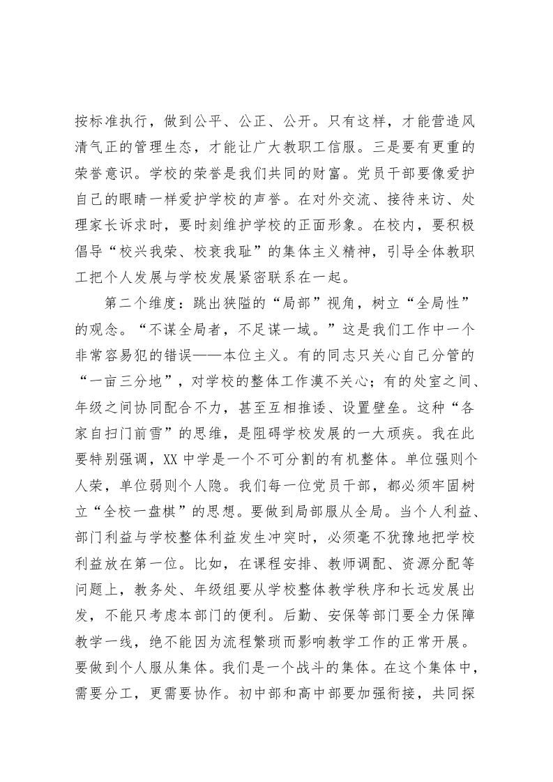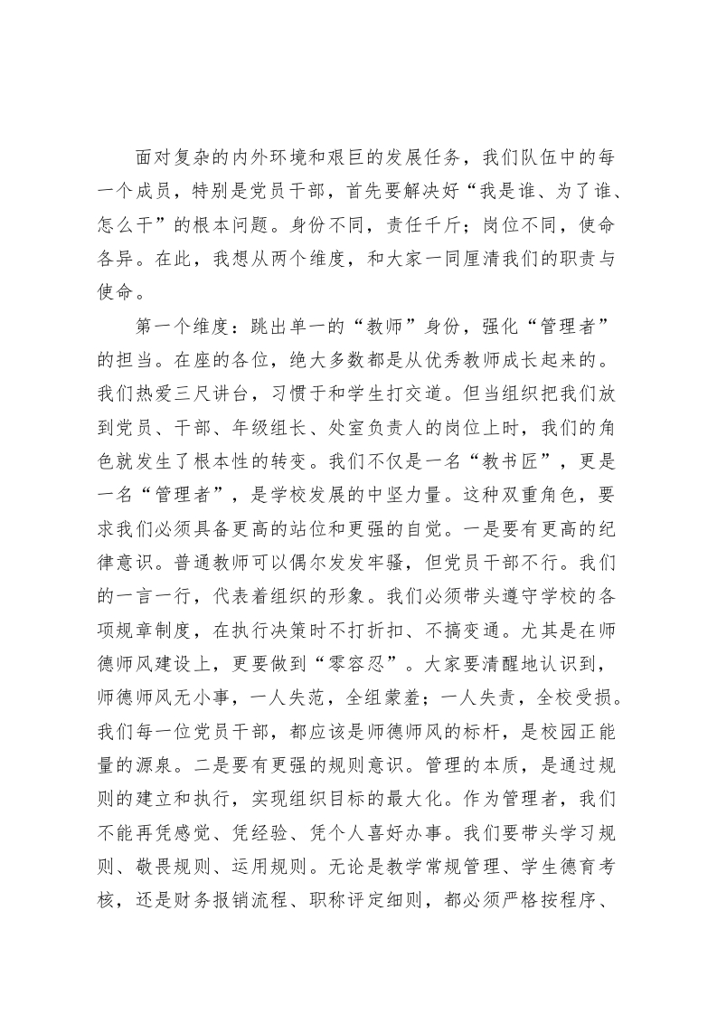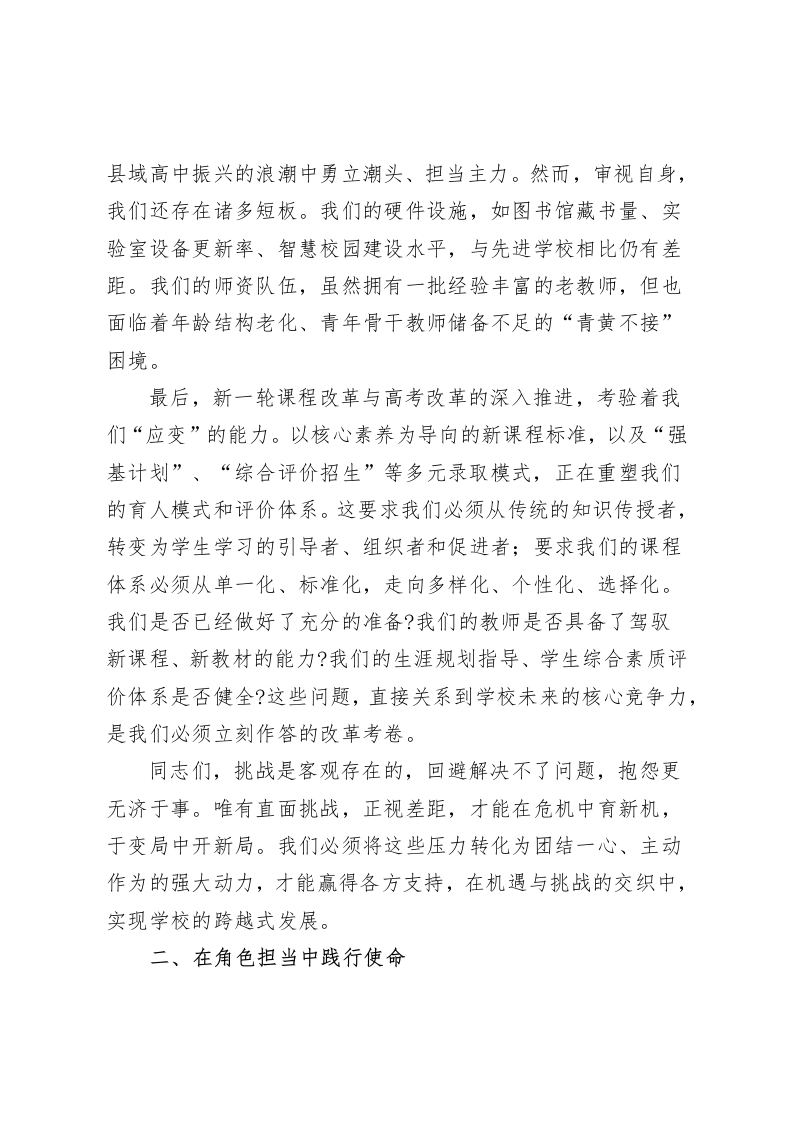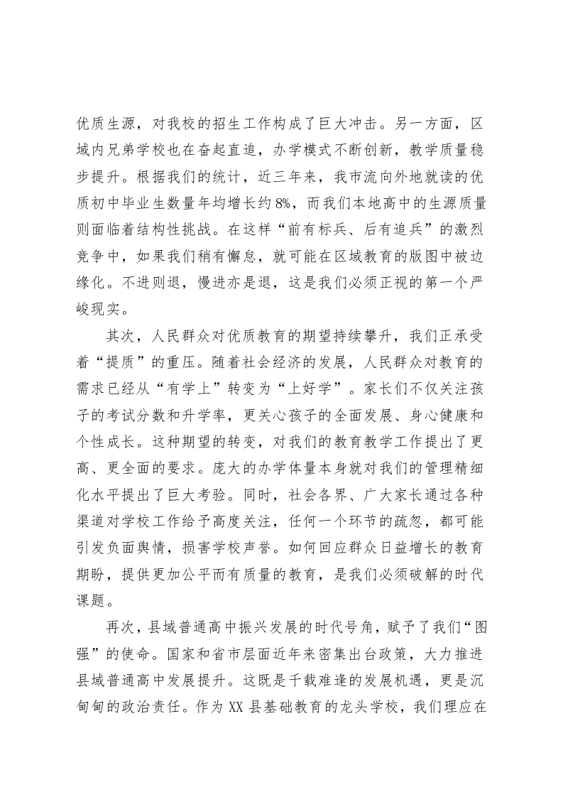 讲稿:凝心聚力,勇担使命,共绘学校发展新蓝图同志们:今天,我们在这里召开全体党员干部大会,主要目的是统一思想、凝聚共识,分析我们面临的形势与挑战,明确我们肩负的责任与使命,共同擘画学校未来发展的宏伟蓝图。在学校即将迎来建校120周年的重要历史节点,这次会议既是一次深刻的“责任课”,更是一场迈向新征程的“动员课”。希望通过今天的交流,能够激发全体党员干部的奋进力量,以实干担当,共同书写中学高质量发展的新篇章。一、在清醒认知中把准航向回顾中学的百年历程,我们充满了自豪与荣光。“人和兴校”的优良传统是我们宝贵的精神财富,“锐意进取、求实创新、团结拼搏、敢为人先”的奋斗精神更是深深烙印在每一代中学人的骨髓里。正是凭借这种精神,我们克服了一个又一个困难,取得了一次又一次辉煌。然而,历史的功劳簿不能成为我们安于现状的“舒适区”。今天,站在新的历史起点上,我们必须以更加清醒的头脑、更加敏锐的洞察力,深刻认识当前学校发展所面临的严峻挑战。首先,区域教育竞争日趋白热化,我们正面临前所未有的“竞存”压力。近年来,随着教育改革的深化,我市乃至全省的教育格局正在发生深刻变化。一方面,省市级“超级中学”凭借其强大的品牌效应和资源优势,不断向周边地区“虹吸”