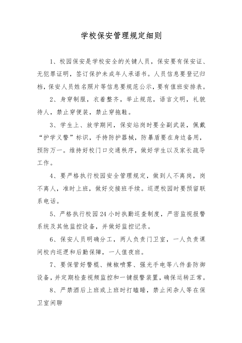 学校保安管理规定细则1、校园保安是学校安全的关键人员,保安要有保安证、无犯罪证明,签订保护未成年人承诺书。人员信息要登记归档,保安人员姓名照片等信息要规范公示,要有值班安排表。2、身穿制服,衣着整齐,举止规范,语言文明,礼貌待人,禁止穿便装,禁止穿拖鞋。3、学生上、放学期间,保安站岗时要全副武装,佩戴“护学义警”标识,手持防护器械,防暴盾要在身边备用,预防万一。维持好校门口交通秩序,做好学生以及家长疏导工作。4、要严格执行校园安全管理规定,做到人不离岗,岗不离人,准时上班,做好交接班手续。巡逻校园时要预留联系电话。5、严格执行校园24小时执勤巡查制度,严密监视报警系统及其他监控设备,并做好监控记录。6、保安人员明确分工,两人负责门卫室,一人负责课间校内巡逻和后勤保障,一人值夜班。7、要保管好警棍、辣椒喷雾、强光手电等八件套防御设备,并定期检查视频监控和一键报警装置,确保运转正常。8、严禁酒后上班或上班时打瞌睡,禁止闲杂人等在保卫室闲聊