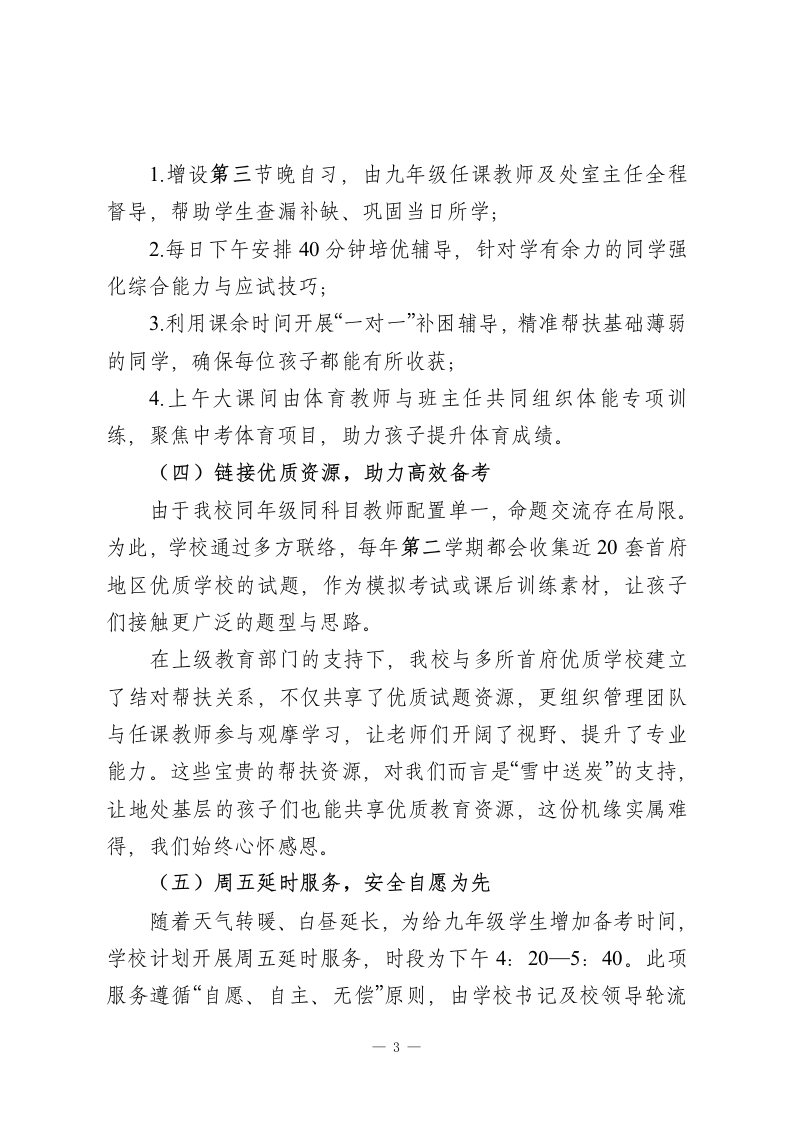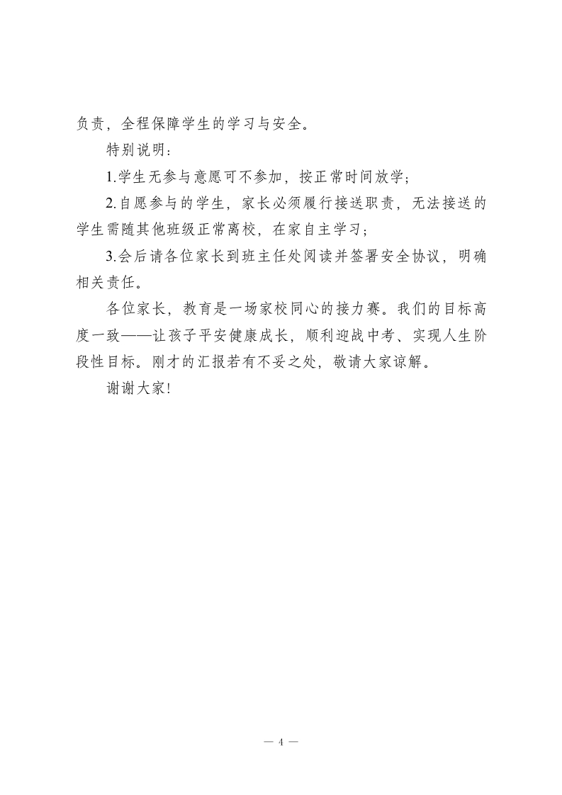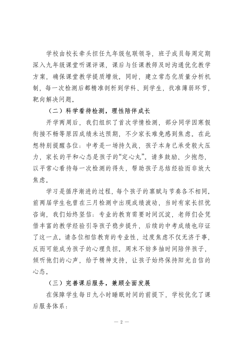 九年级中考备考家长会,校长发言:学校携手做好教育管理工作尊敬的各位家长:大家下午好!春和景明,万物勃发。在这充满希望的季节里,我们因共同的期盼相聚一堂,共商九年级中考备考大计。此次家长会,旨在搭建家校沟通的桥梁,希望各位家长能以平和心态陪伴孩子迎战中考,与学校携手做好教育管理工作。下面,我将向大家汇报本届九年级的基本情况与学校的备考安排,也恳请各位积极履行监护人职责,与我们并肩同行。一、九年级基本情况本届九年级共有4个班级,175名同学。尽管部分优质生源选择外出求学,但孩子们整体展现出良好的学习状态:学风浓厚、纪律严明,绝大多数同学都能主动投入备考,认真完成各项学习任务,这份自律与奋进让我们倍感欣慰。同时,我们也关注到少数同学因个体差异、基础薄弱等原因,学习兴趣不足、成绩有待提升。对此,学校正通过针对性引导,帮助他们调整心态,以积极姿态面对人生的重要选择。二、学校备考工作安排为助力孩子们高效备考,学校围绕“提效、补弱、培优、保稳”四大目标,制定了系列扎实举措:(一)狠抓课堂实效,精准分析学情一1