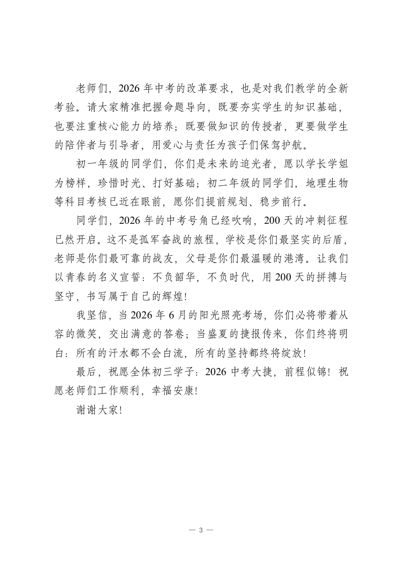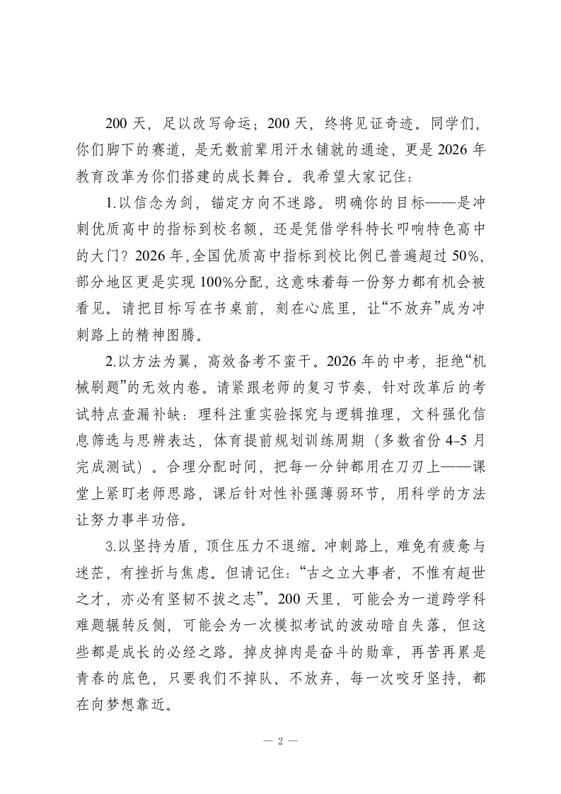 离中考只有200多天,2026届中考冲刺动员校长讲话一一以青春之名,赴时代之约亲爱的老师们、同学们:大家上午好!当晨光洒满校园,当倒计时牌定格在200天,我们站在了2026年中考冲刺的关键节点。此刻,距离全国中考集中开考(6月中旬至7月初)仅有短短七个月,这场被称作“没有硝烟的战争”,早已在无形的赛道上拉开序幕。今天,我想对初三全体学子说:2026年的中考,既是检验多年寒窗的试金石,更是你们人生中第一场与时代同频的成长战役一一掉皮掉肉不掉队,再苦再累也无悔!2026年的中考,正经历着深刻的变革。教育部持续推进“全面育人”改革,取消考试大纲、增加探究性试题、强化综合素质评价,让这场考试不再是“唯分数论”的独木桥,而是对德智体美劳全面发展的综合检阅。从北京将综合素质评价纳入道德与法治计分,到深圳把物理实验操作纳入中考总分;从浙江新增人机对话测试,到全国80%省份采用分散考核+集中笔试模式,这些变化告诉我们:2026年的中考,不仅考查知识储备,更考验思维能力、实践本领和综合素养。你们既要吃透课本上的基础知识,也要适应跨学科命题的灵活形式;既要攻克数理化的逻辑难关,也要重视体育测试、实验操作等前置考核项目一这正是2026年中考赋予“奋斗”的新内涵。1