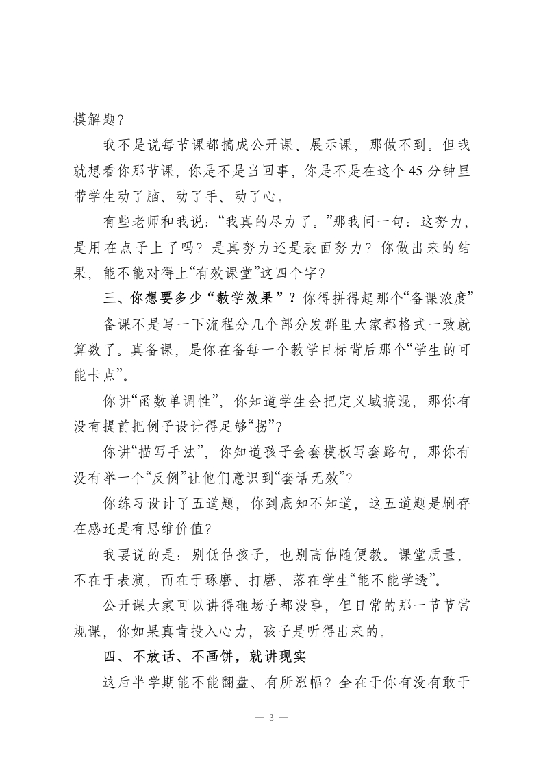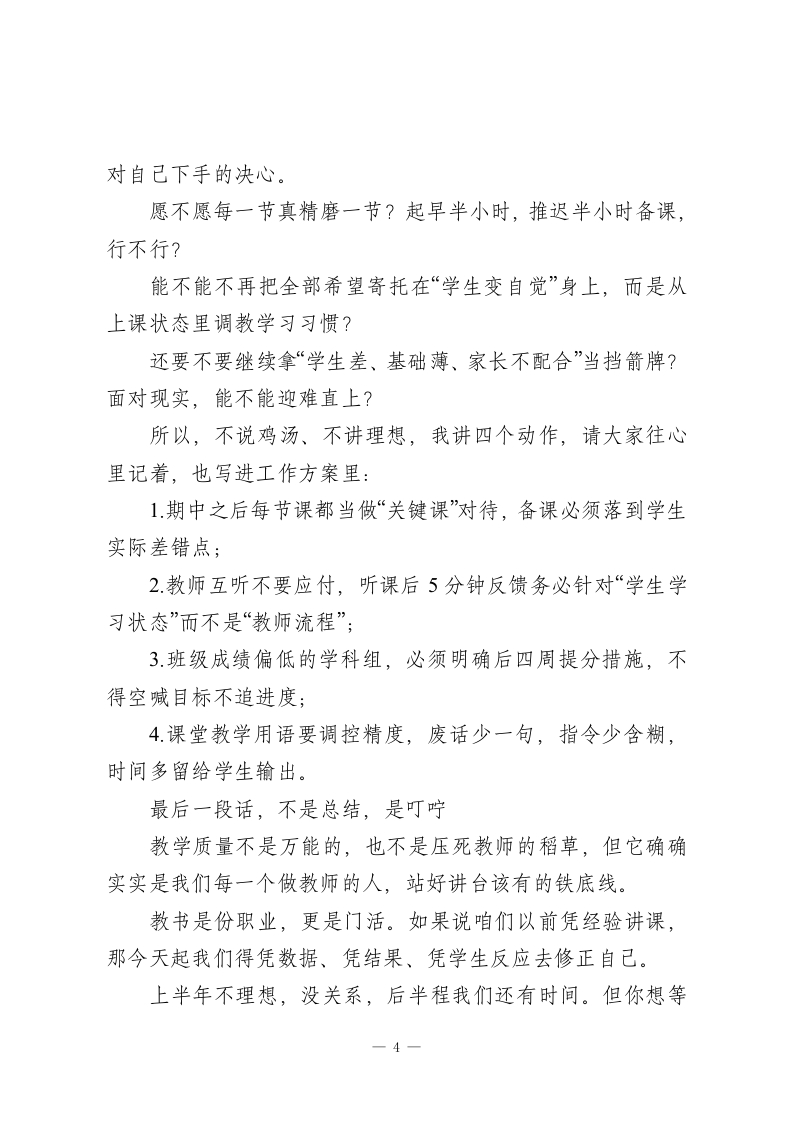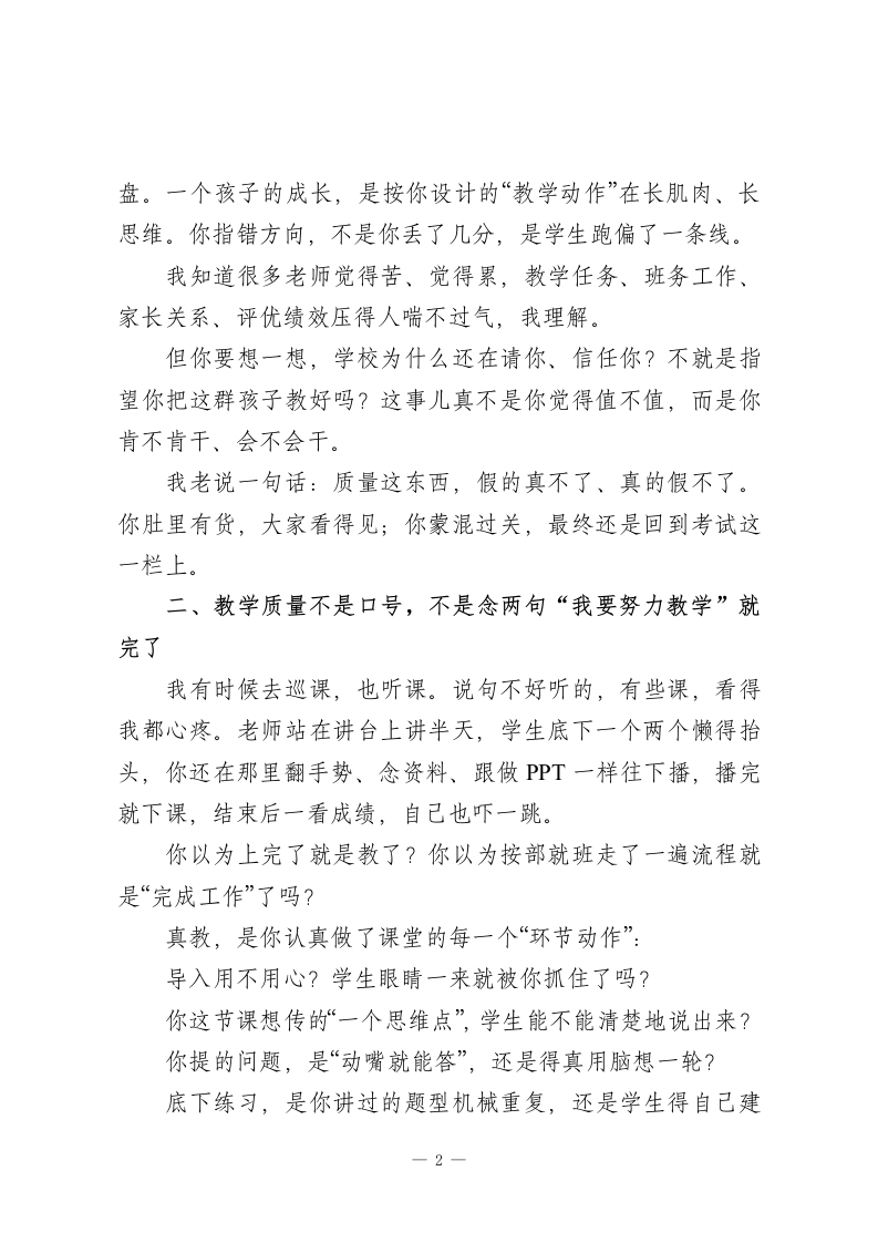 期中质量分析会上,校长讲话:很多教育真话都不敢在会上说各位老师,下午好。今天这场会,是咱们每学期都会有的“期中分析会”,但我希望它别只是一个“自来水”流程走一遍。我想借这个机会,把一些问题讲穿,把一些话摆到明面上。成绩已经出来,摆在那,数据不会说谎。有老师喜笑颜开,也有的眉头紧锁,我不评谁高谁低。我想的是,不管你是哪个段位,这一刻,你是不是该静一静、想一想这三个问题:第一问:这半学期的教学,你是真用心了,还是只是“走完流程”?你交的这份成绩单,撑不撑得住学生期待?对得起一张张信任的脸吗?第二问:成绩不好,你甩得出去多少“客观原因”?你想过哪些问题,其实是你可以掌控、可以改的吗?第三问:从明天开始,到这学期结束,你准备怎么做?具体地说,你打算怎么赢回来?这三句话,不是给你审查用的,而是作为一个做教育的人,是不是心里还有一口“责任气”一一把自己的课讲对,把孩子的路带顺,把这份职业干得起码对得起良心。一、你教的不是分数,是一个家庭的希望,是一个少年未来的起点说的重一点,我们手里哪是书本?我们拿的是命运的方向1